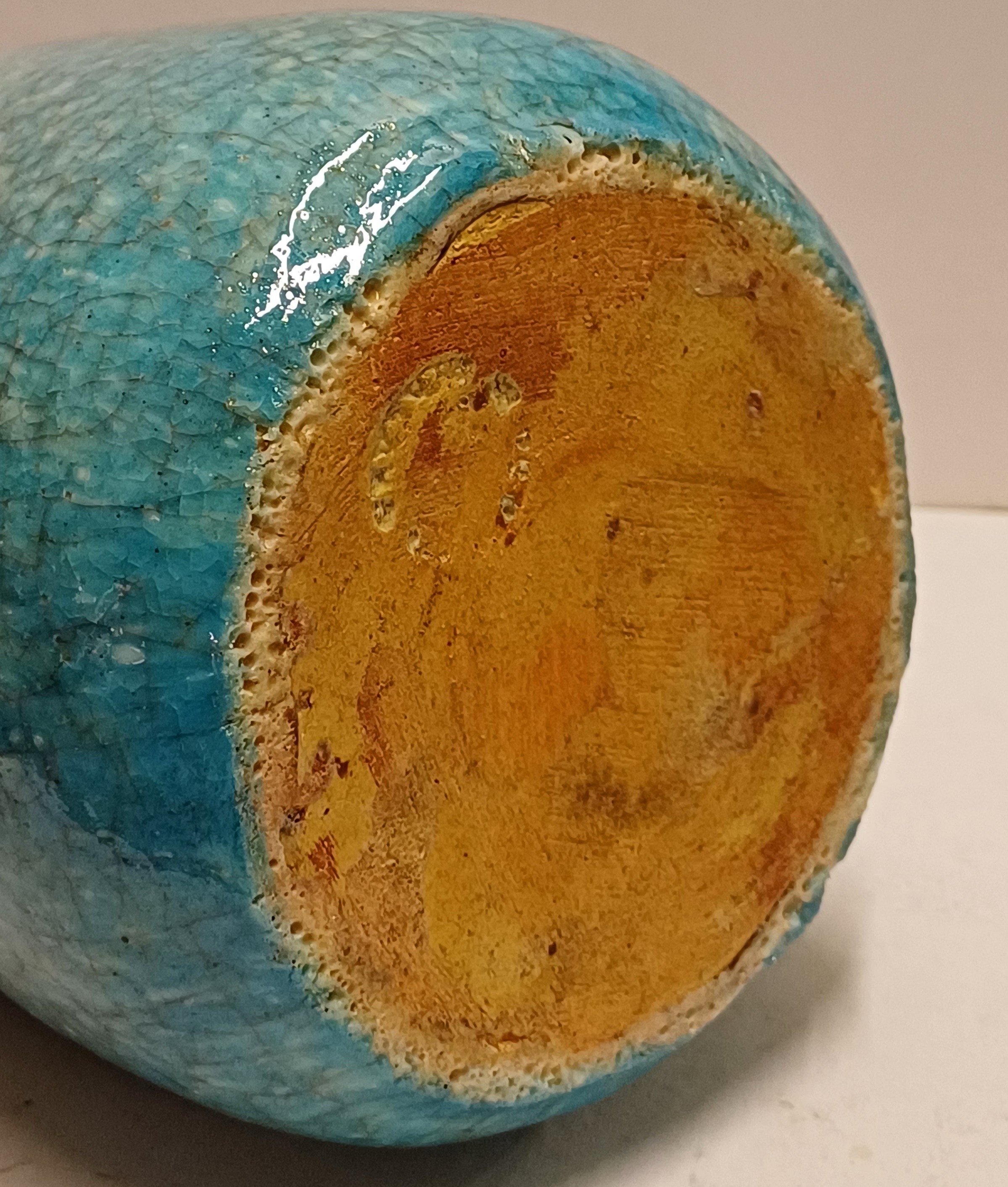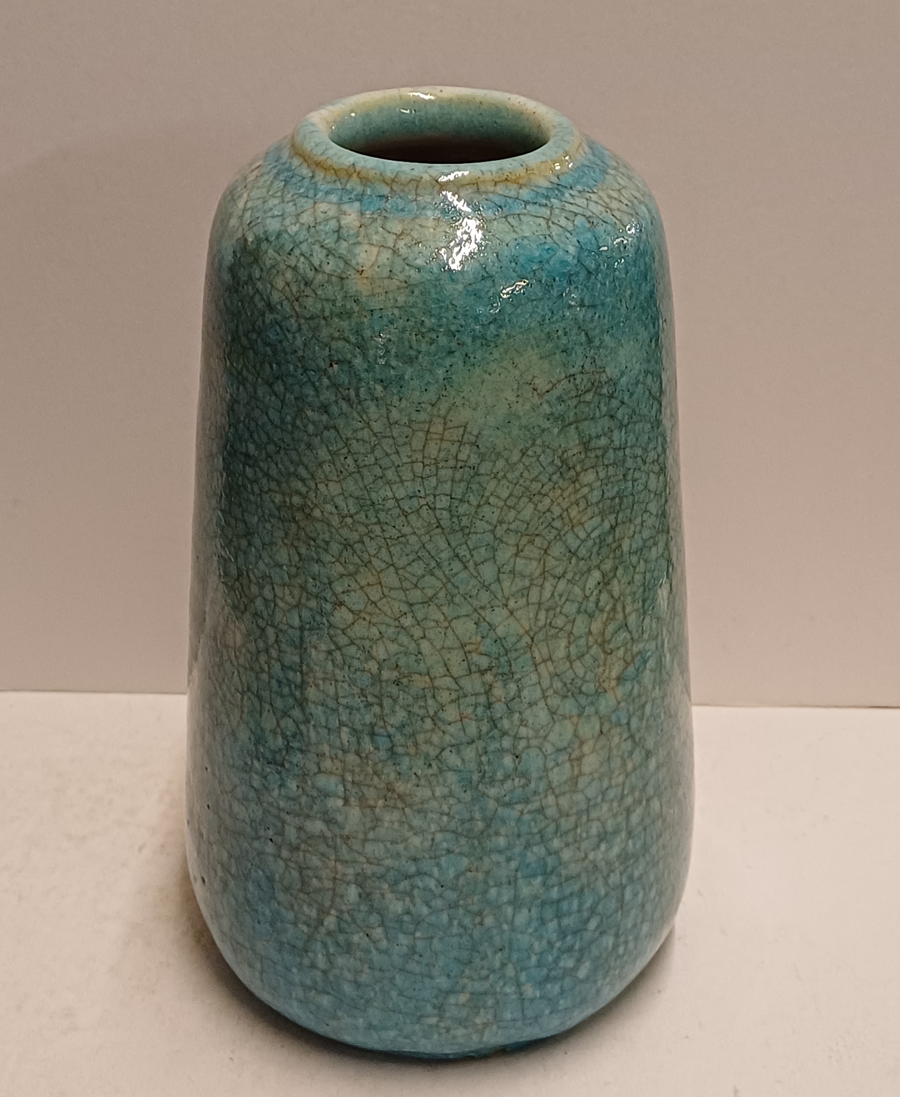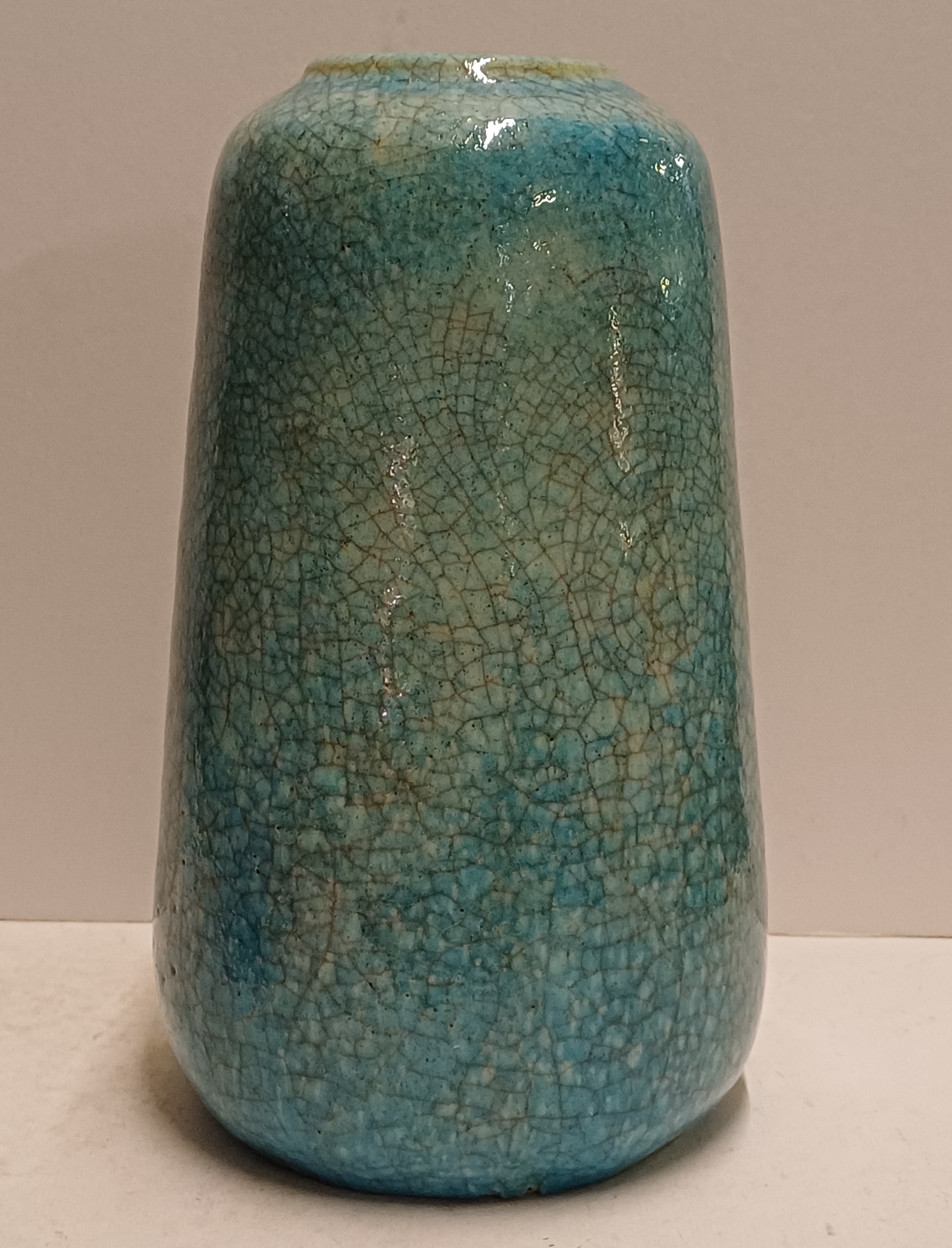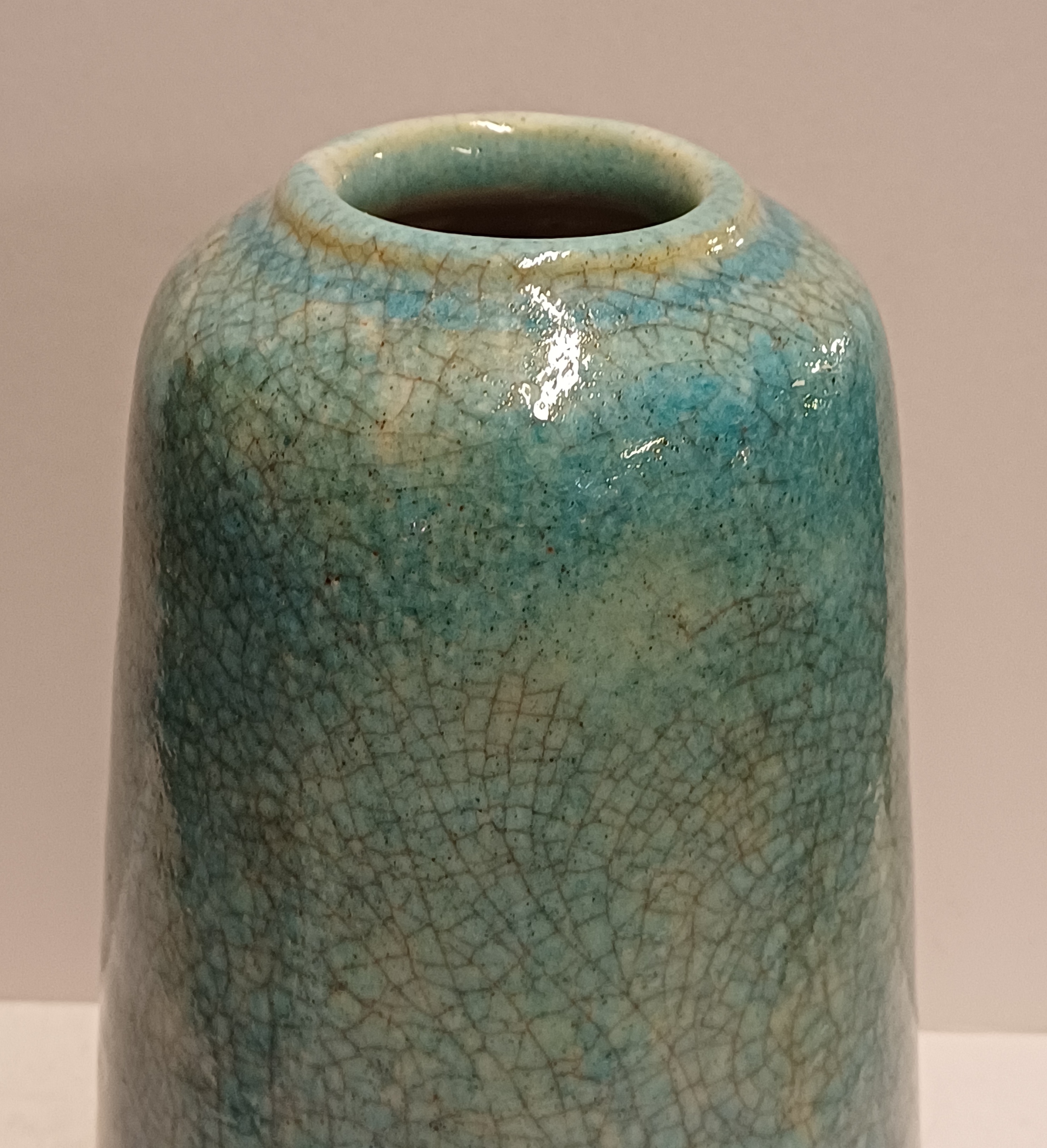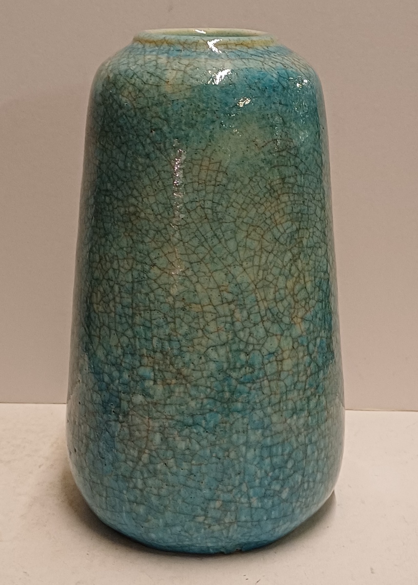 Grote vaas met lichtblauwe glazuur met fijne craquele. Onderzijde met fabrieksmerk.