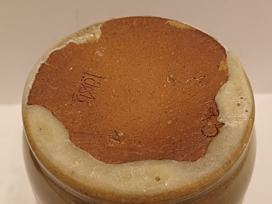 Vase mit grauer Glasur. Unterseite mit Modellnummer und Signatur.