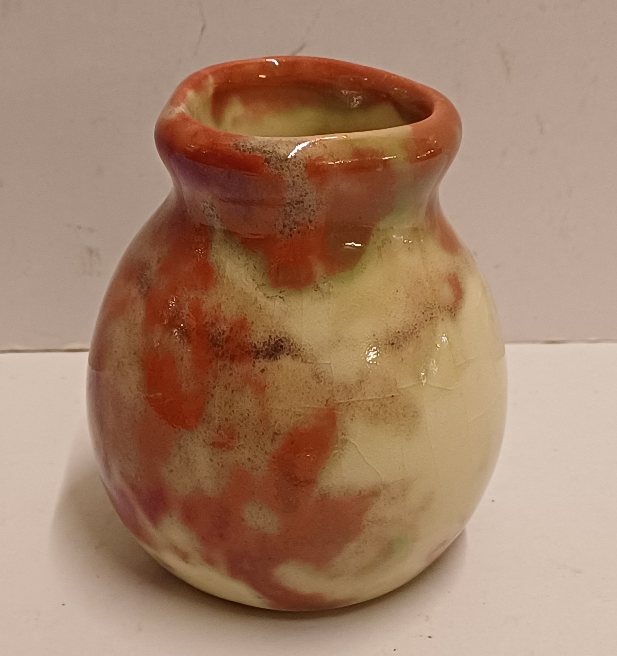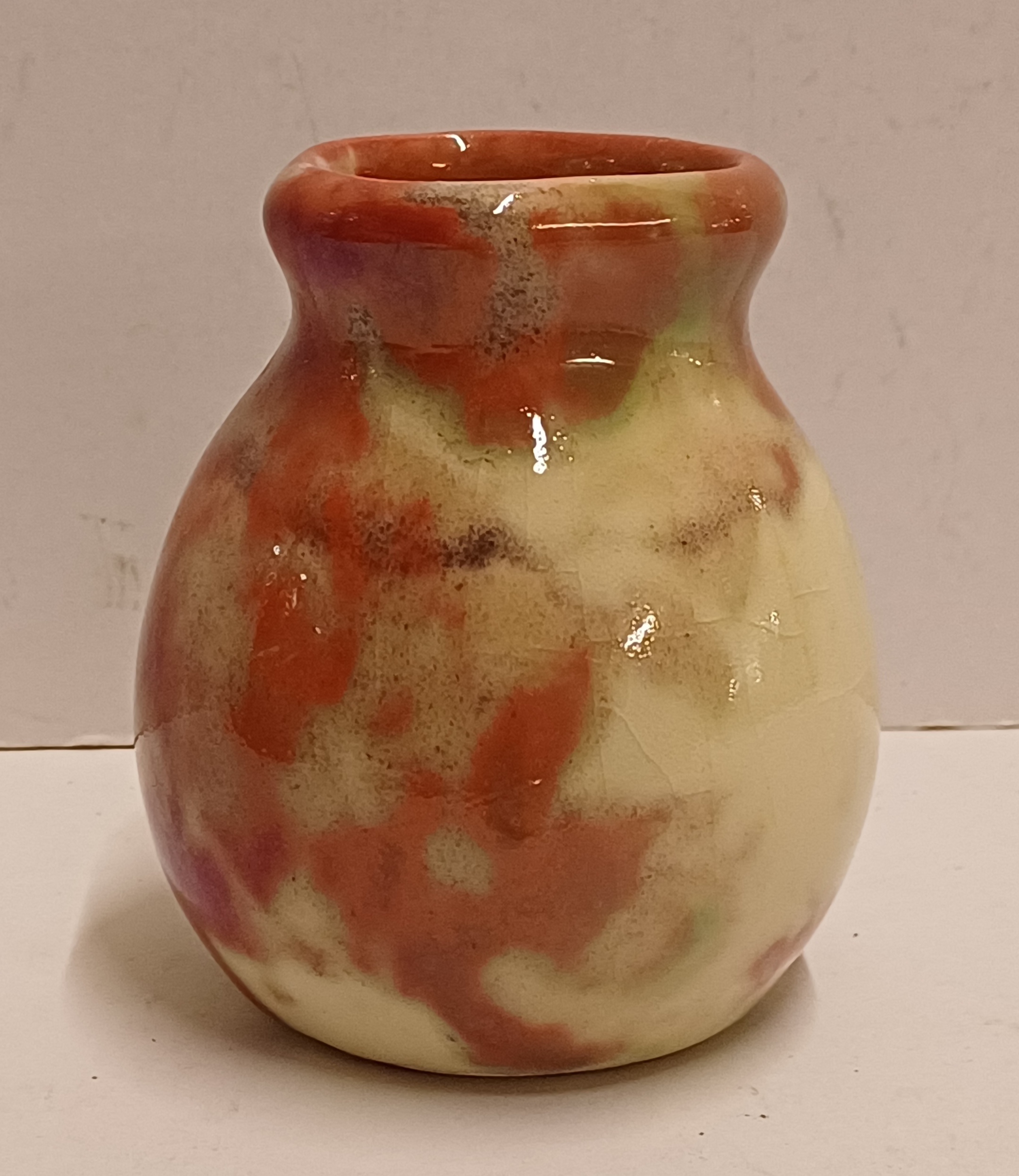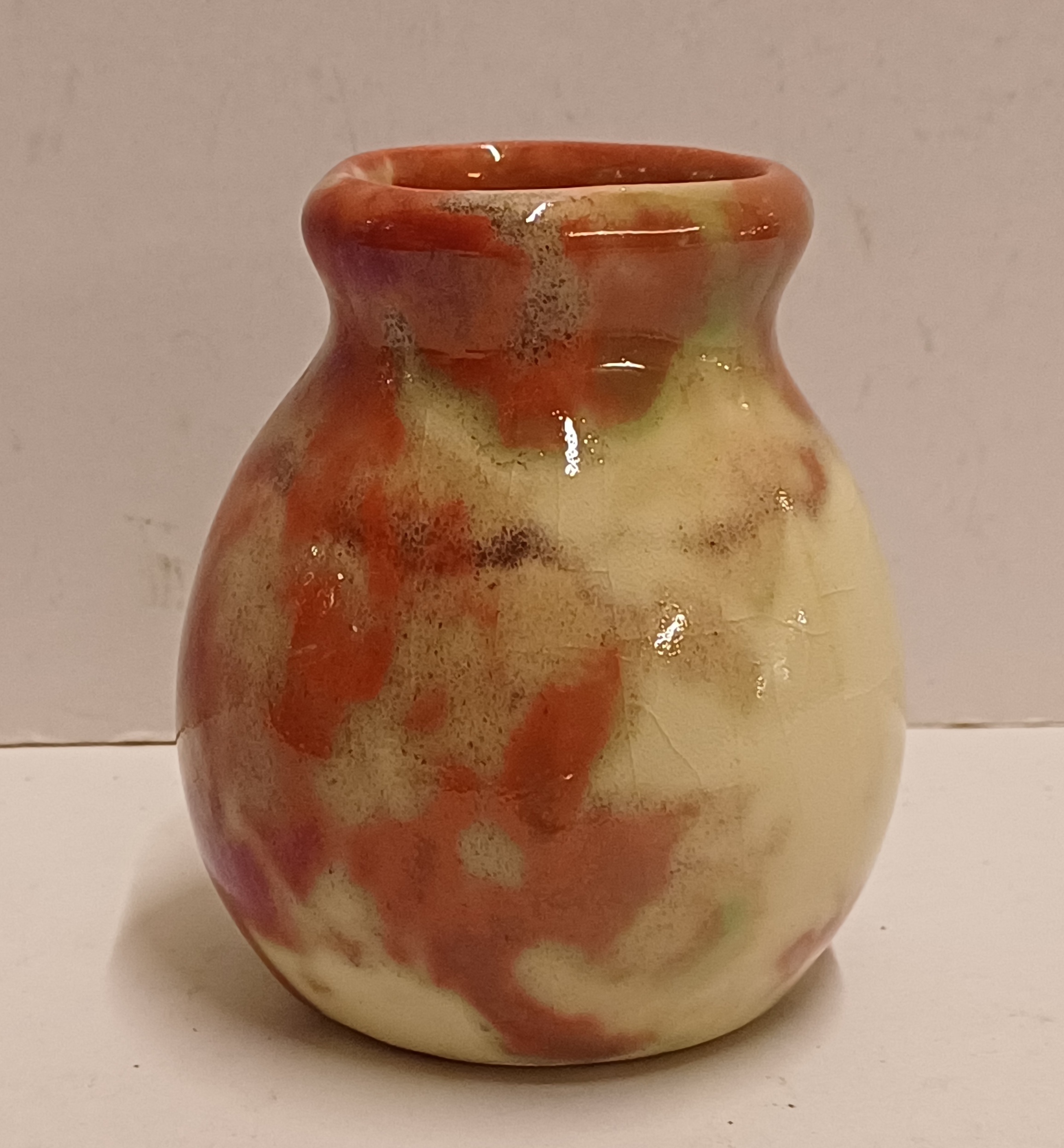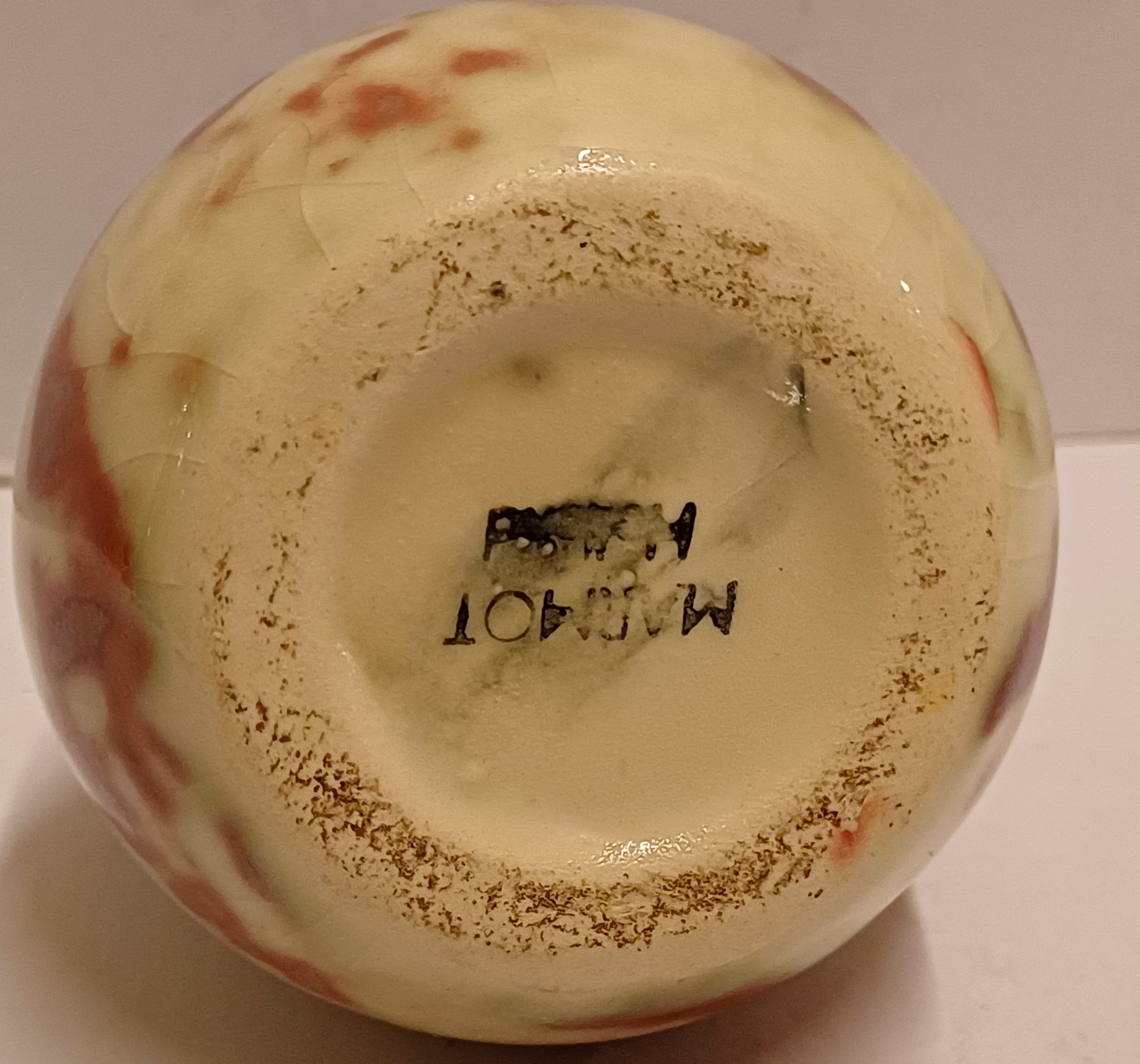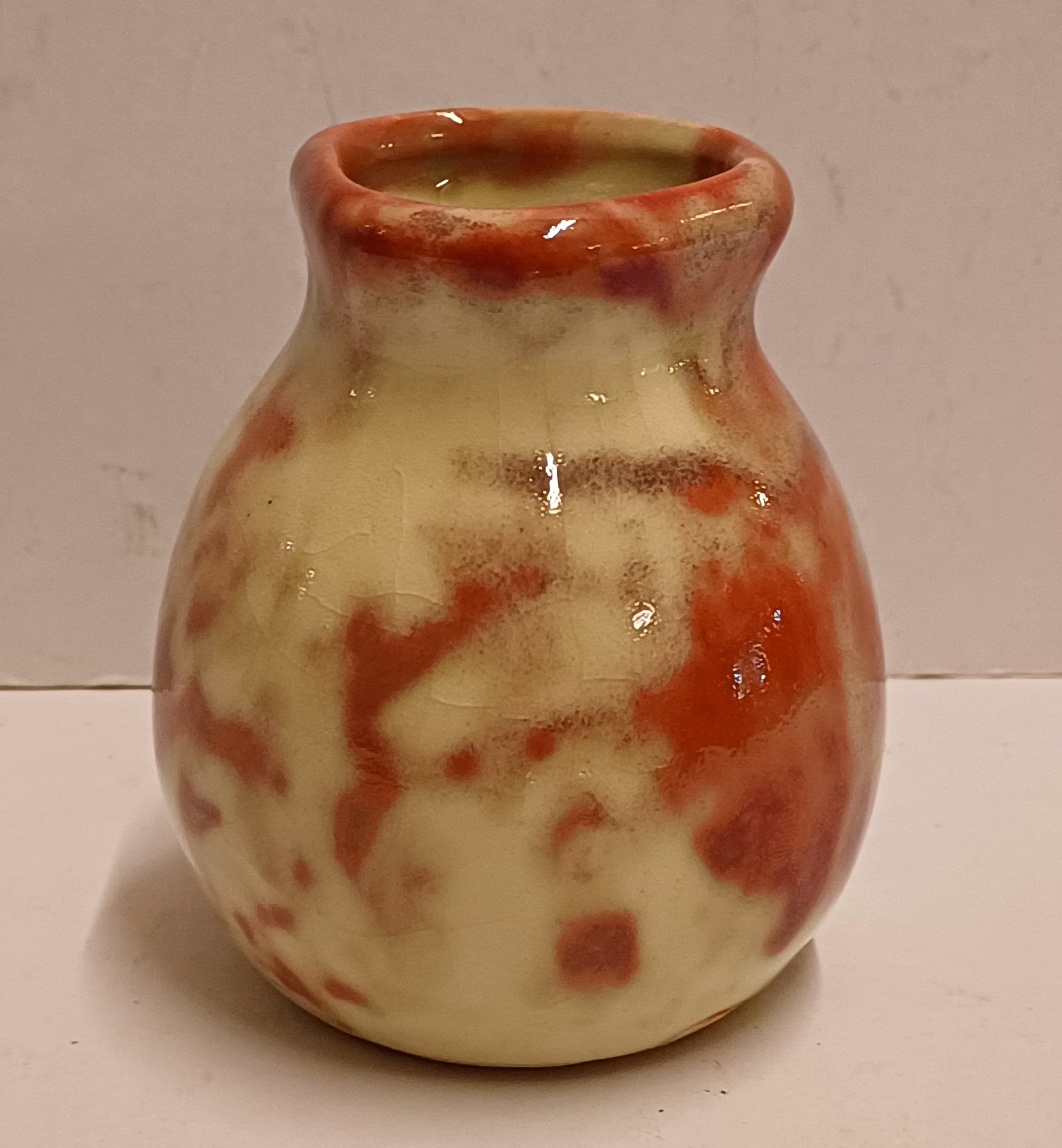 Kleines Vasen mit roter Reflet Métallique Glasur. Unterseite mit Fabrikmarke.