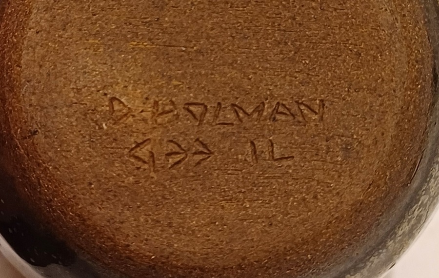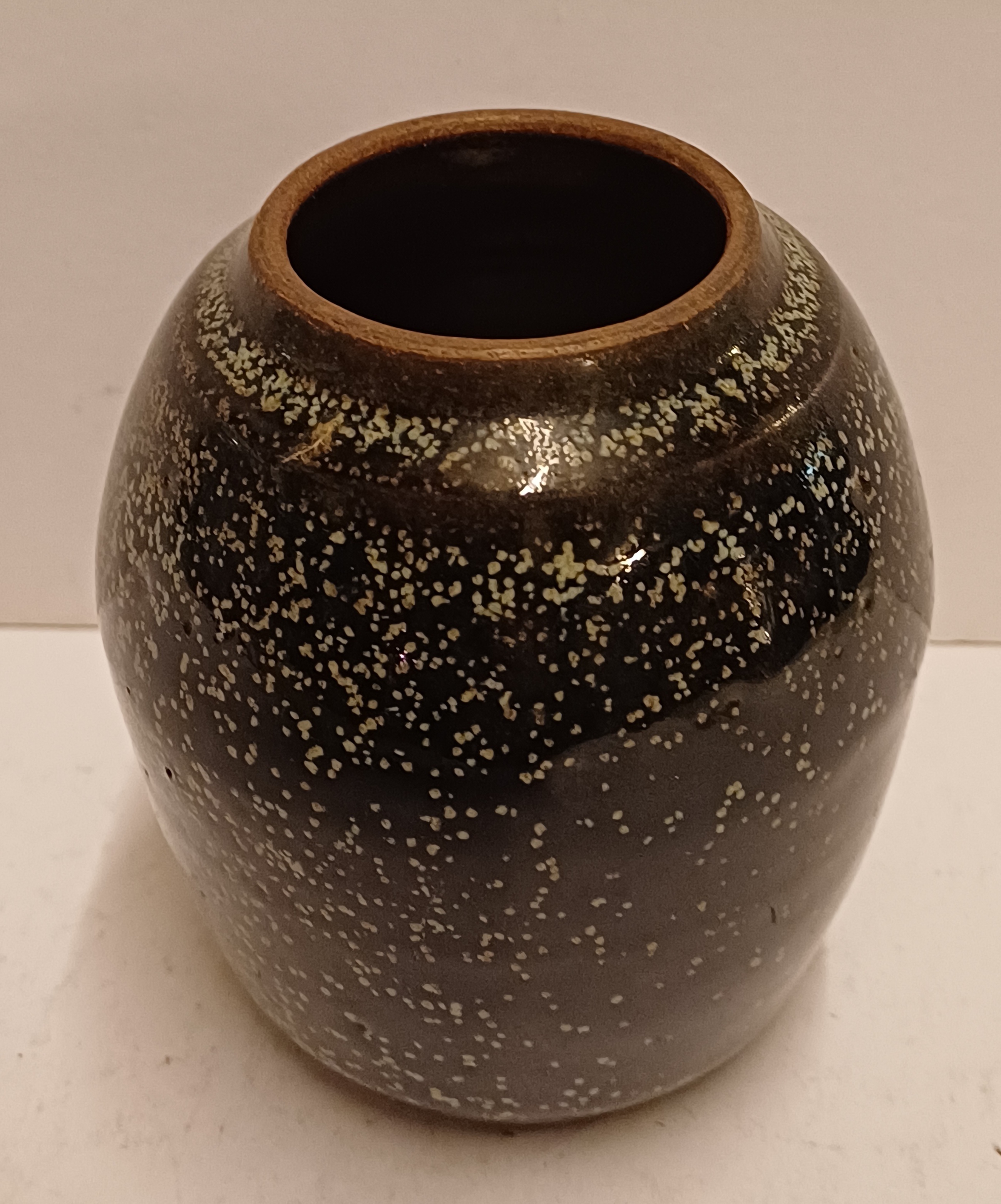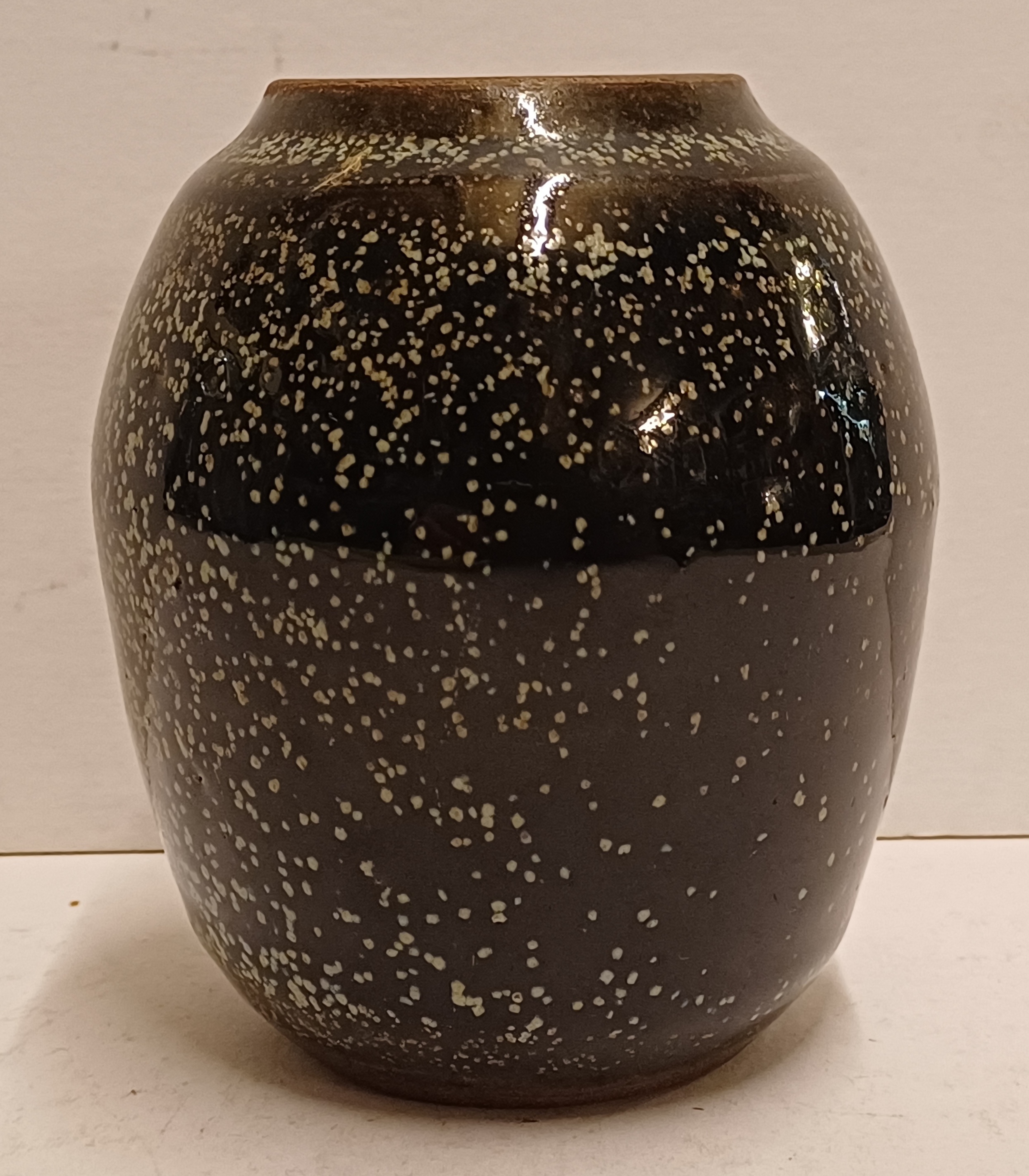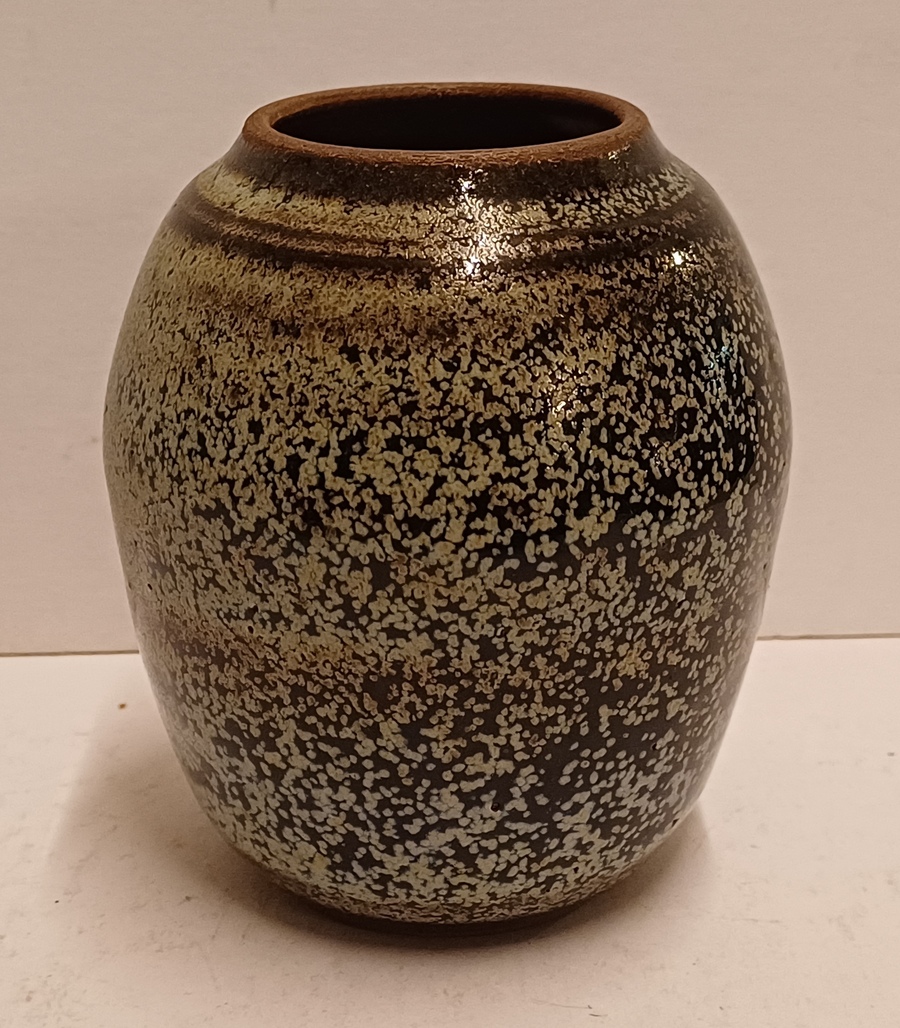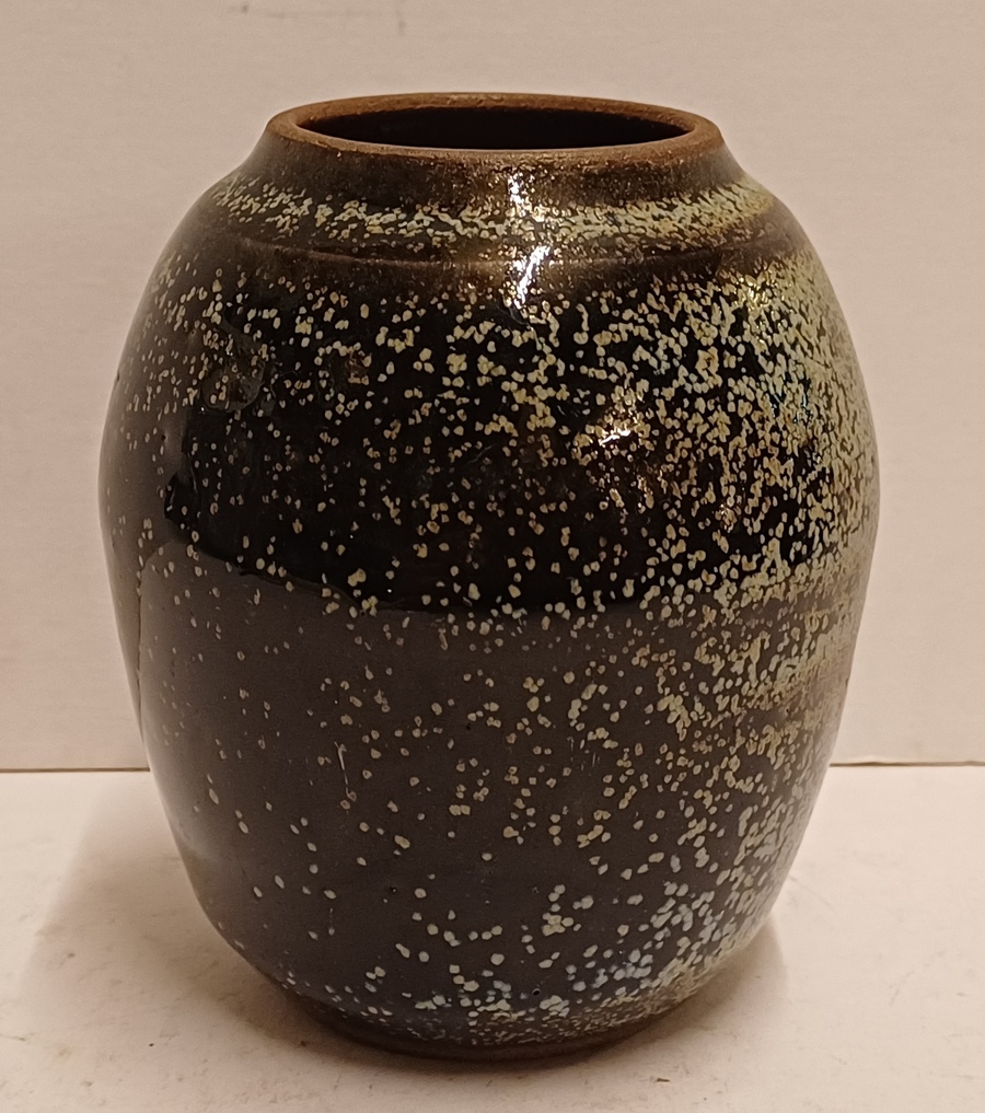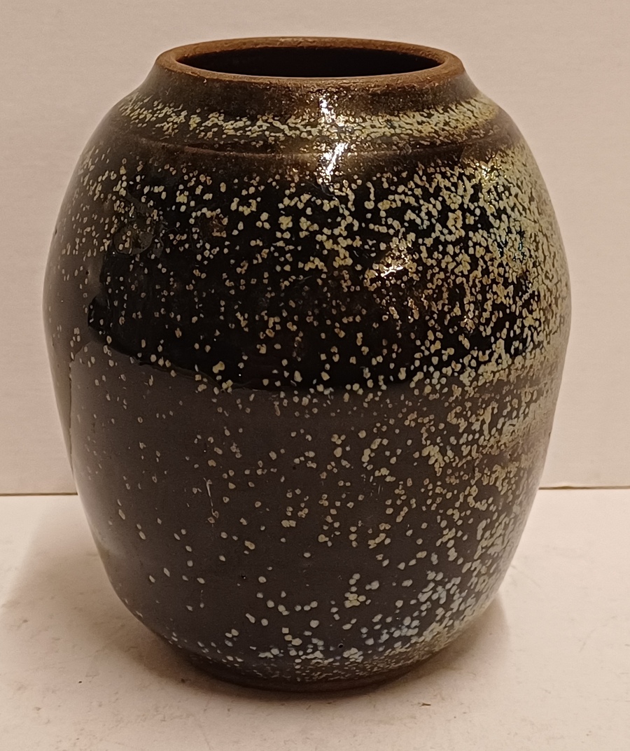 Steingutvase mit dunkler Glasur und Sprenkeln. Unterseite signiert und nummeriert 433 IL.