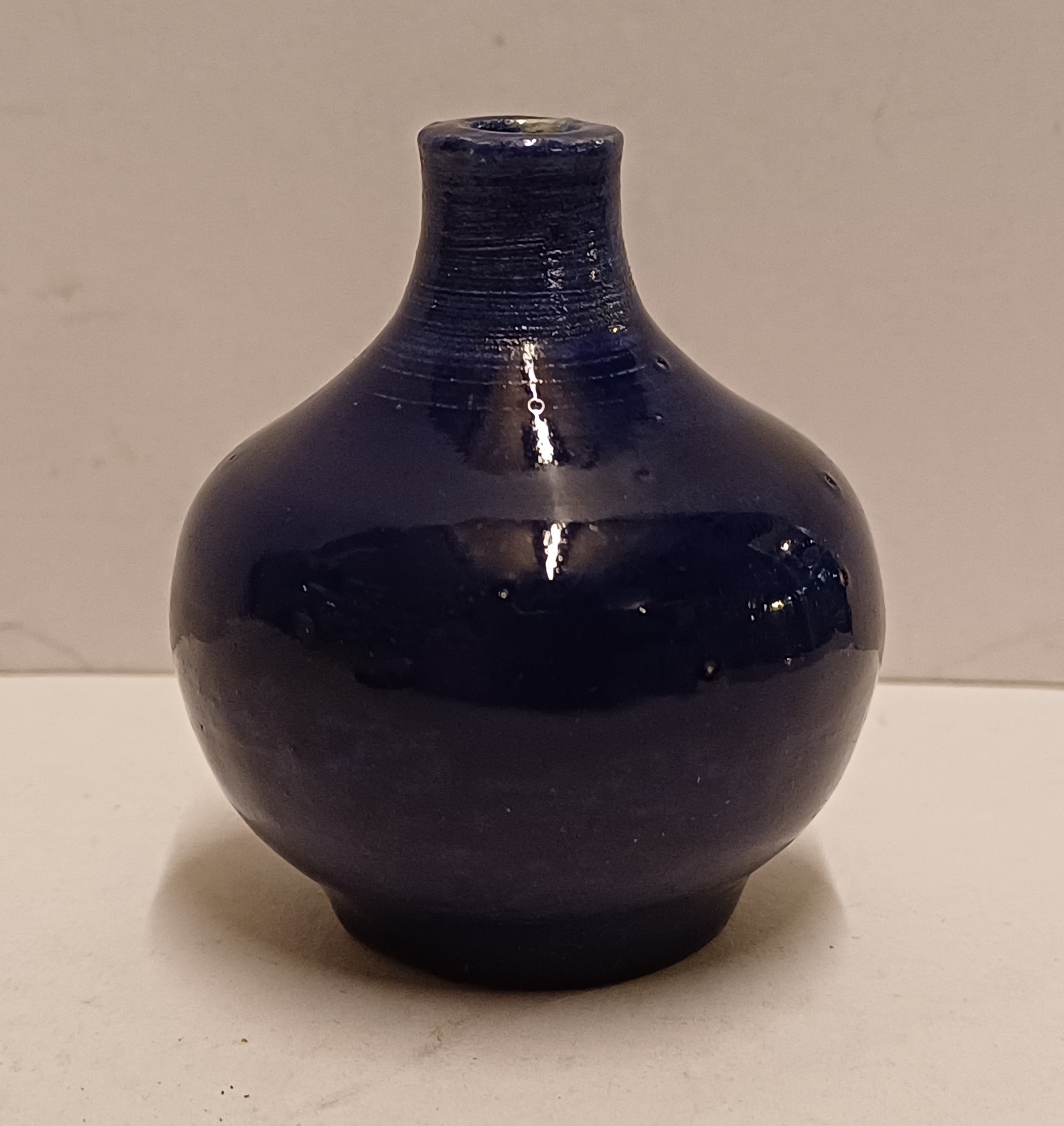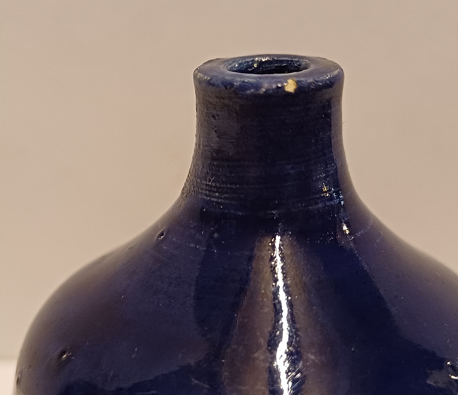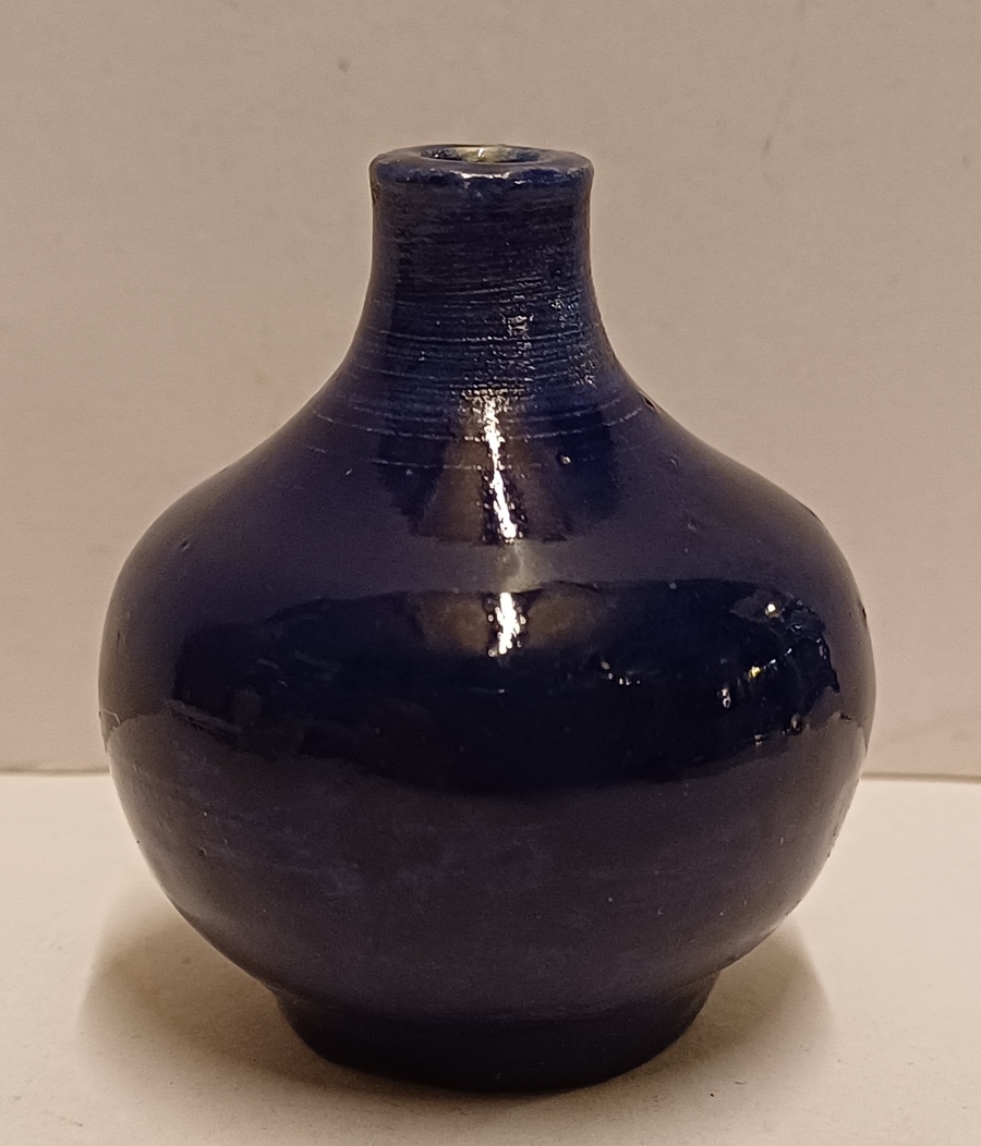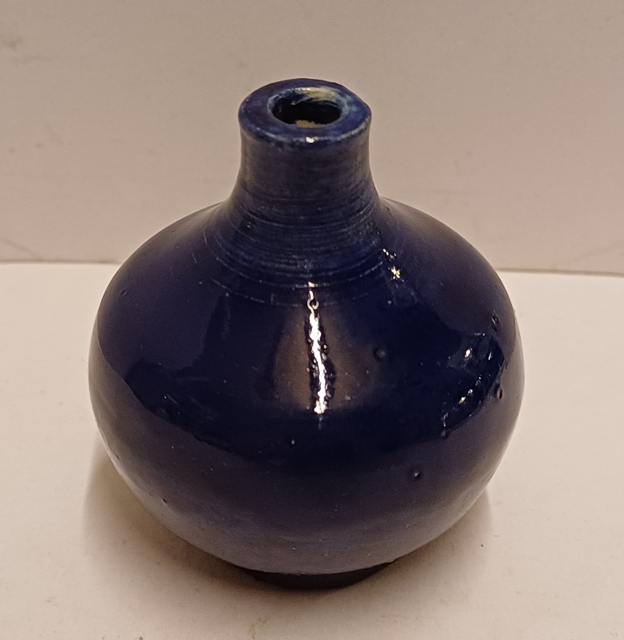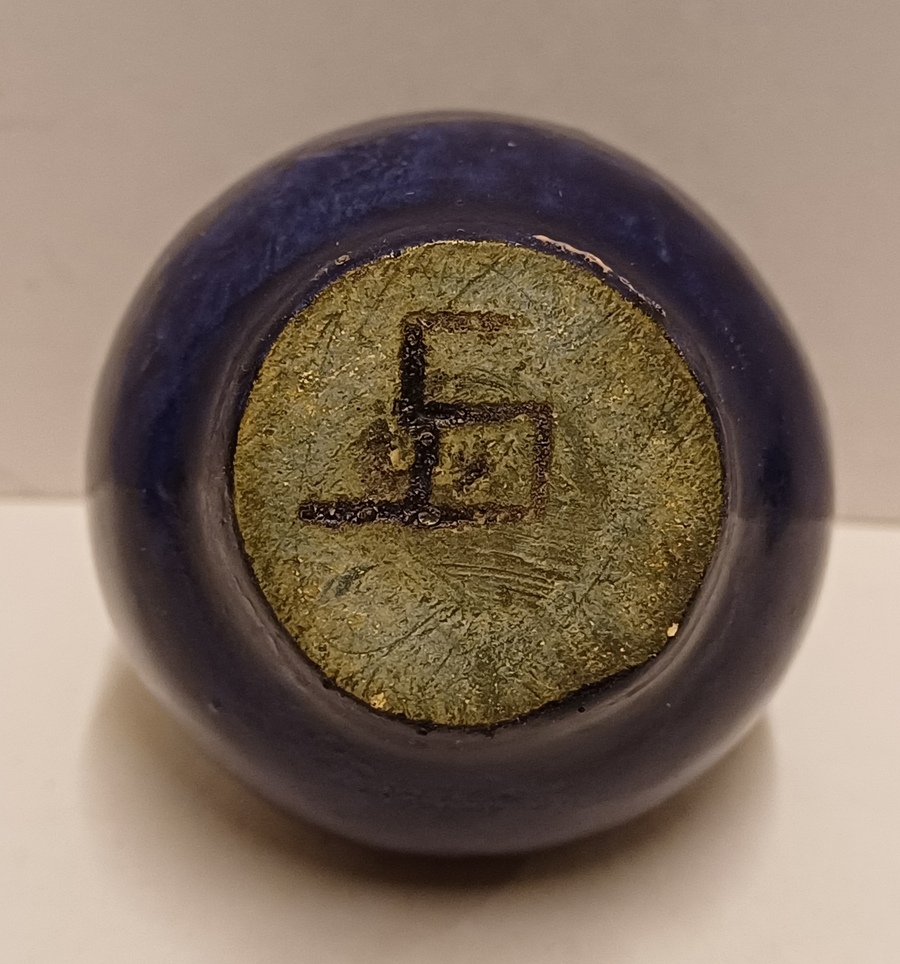 Keramikväschen mit dunkler kobaltblauer Glasur. Unterseite mit Mitarbeitermarke JS?