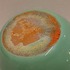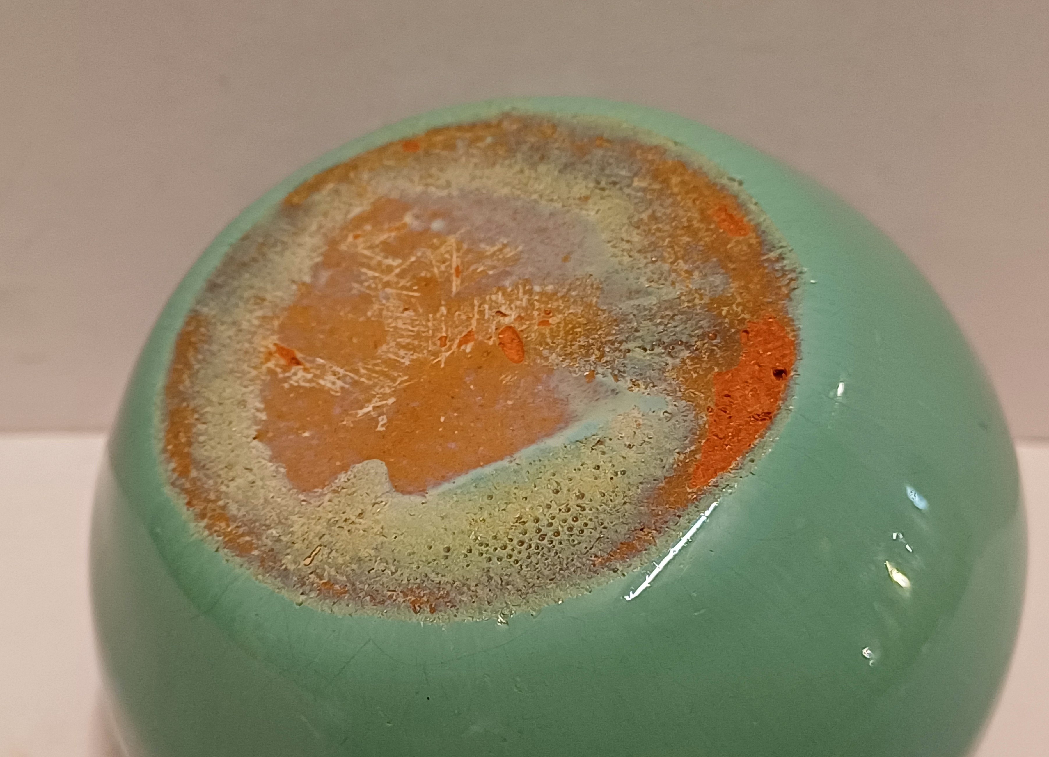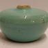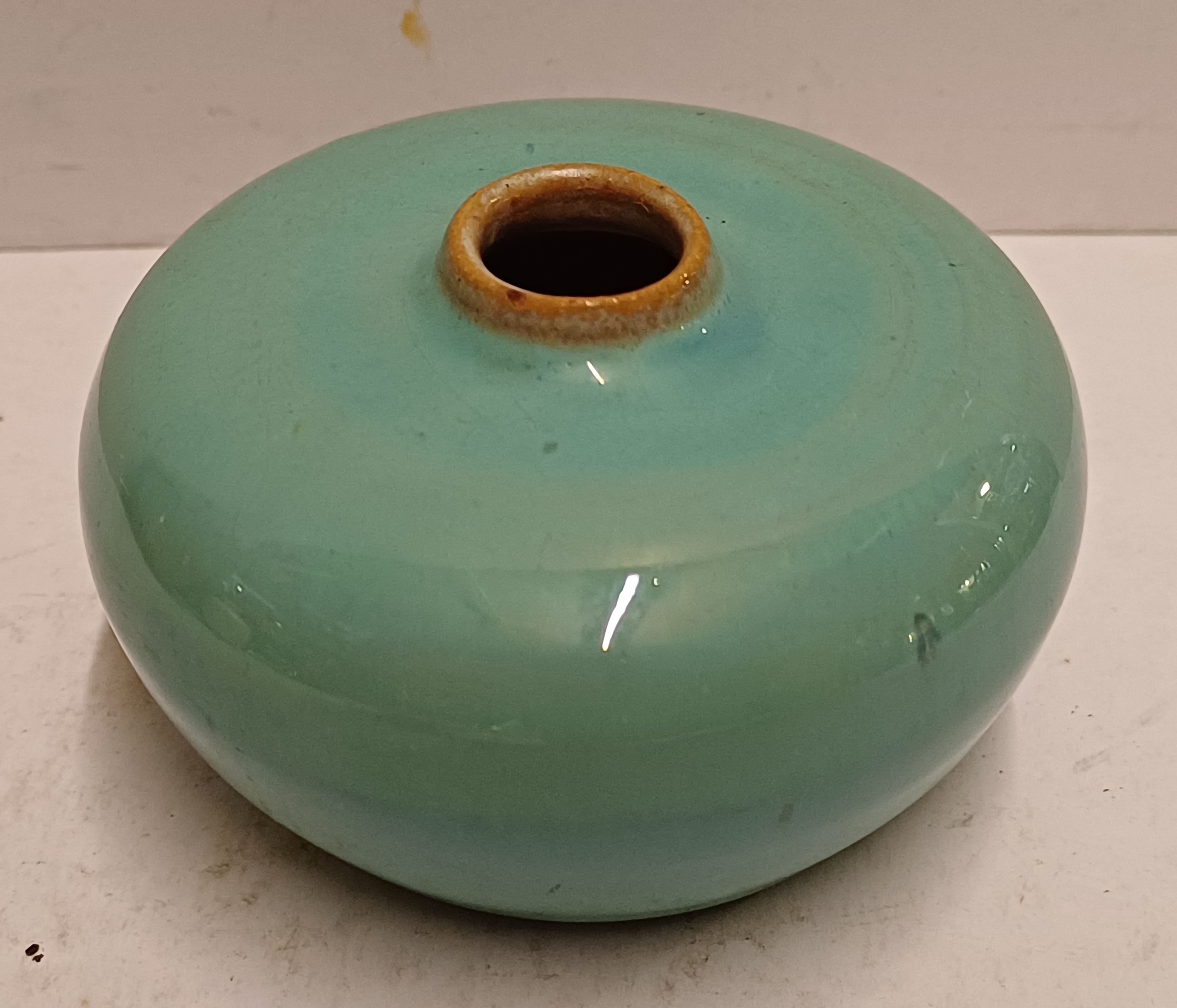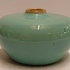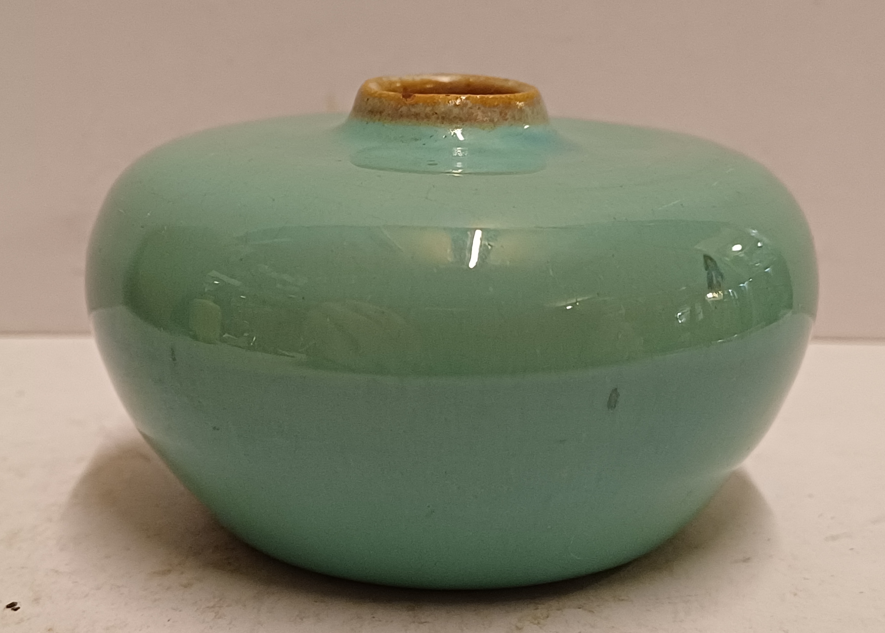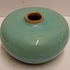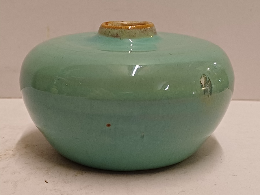 Abgeflachtes Steingut-Väschen mit grüner Glasur und brauner Mündung. Nicht signiert.