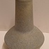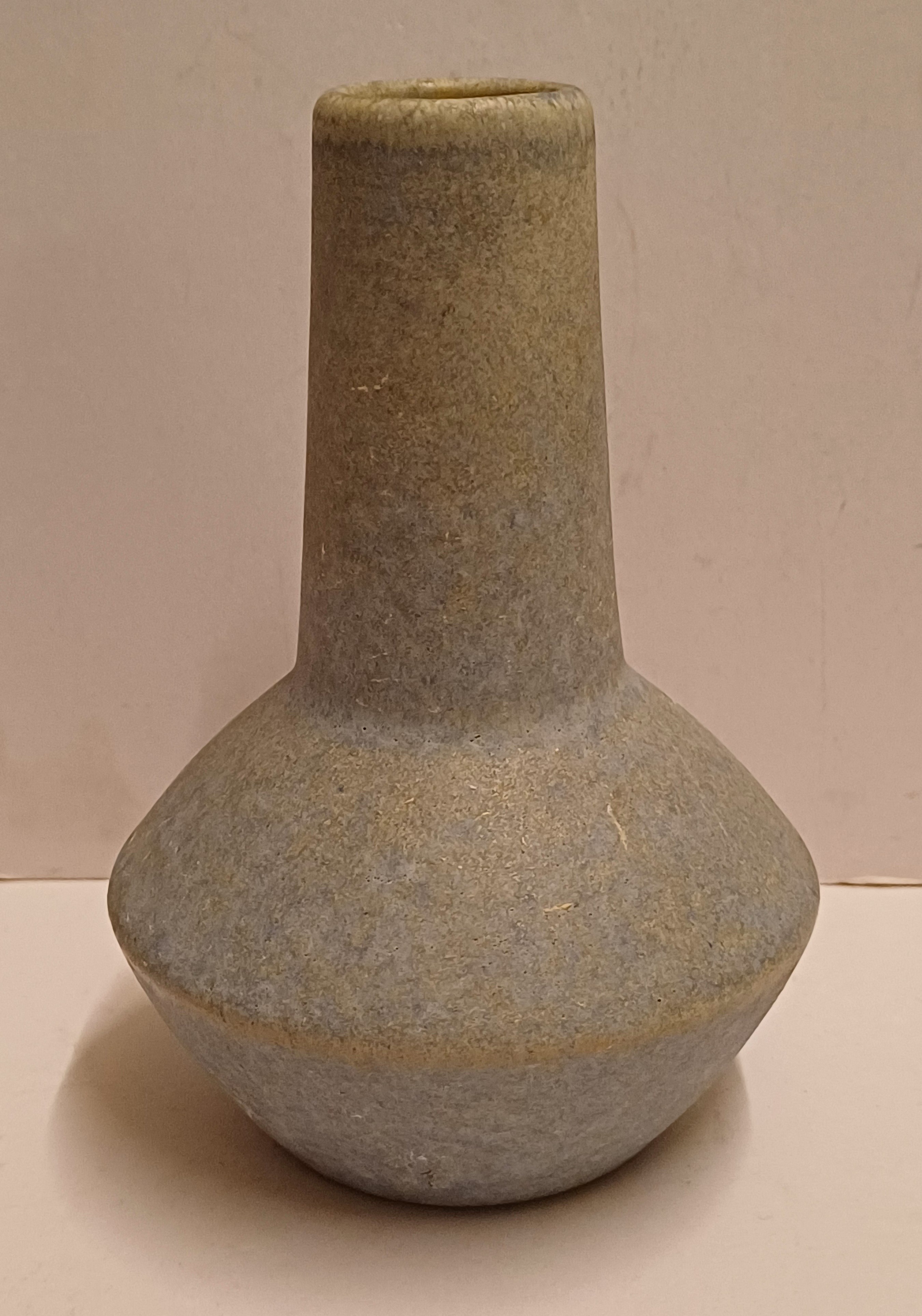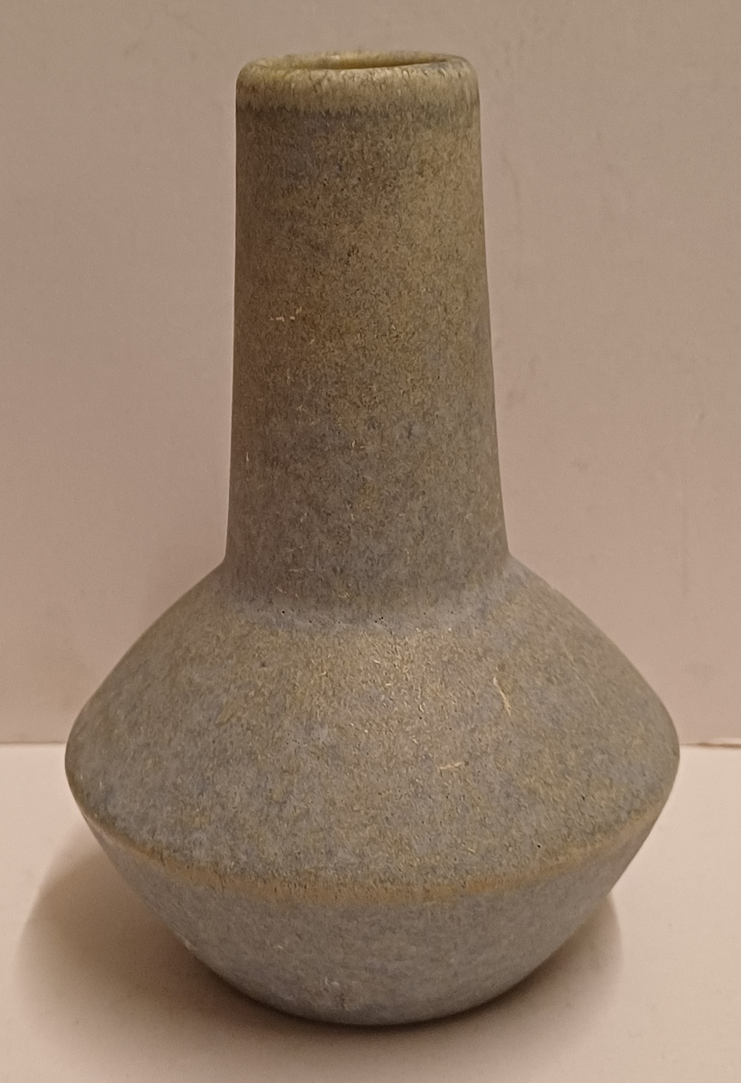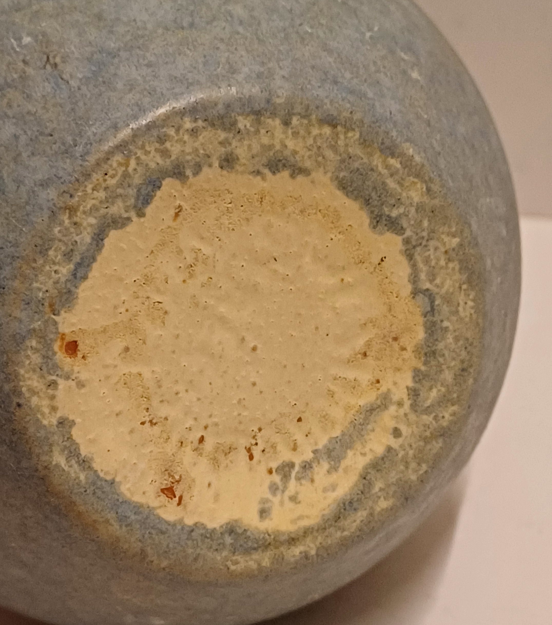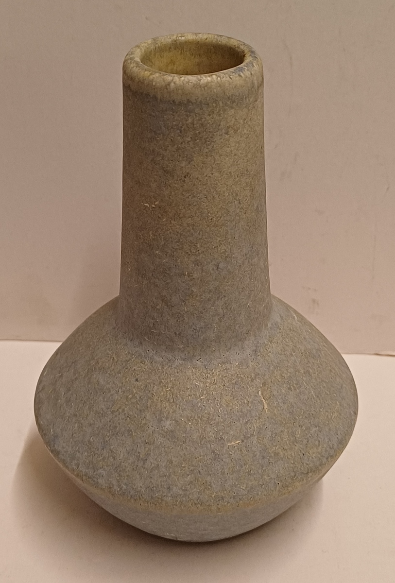 Aardewerken vaasje met grijzige glazuur. Onderzijde gestempeld merk.