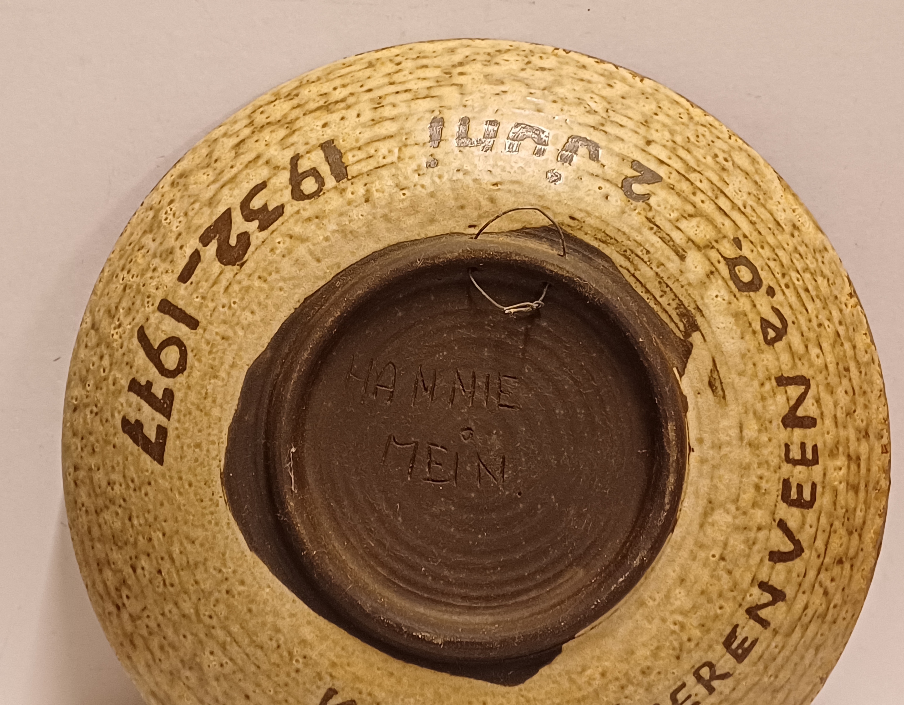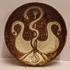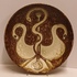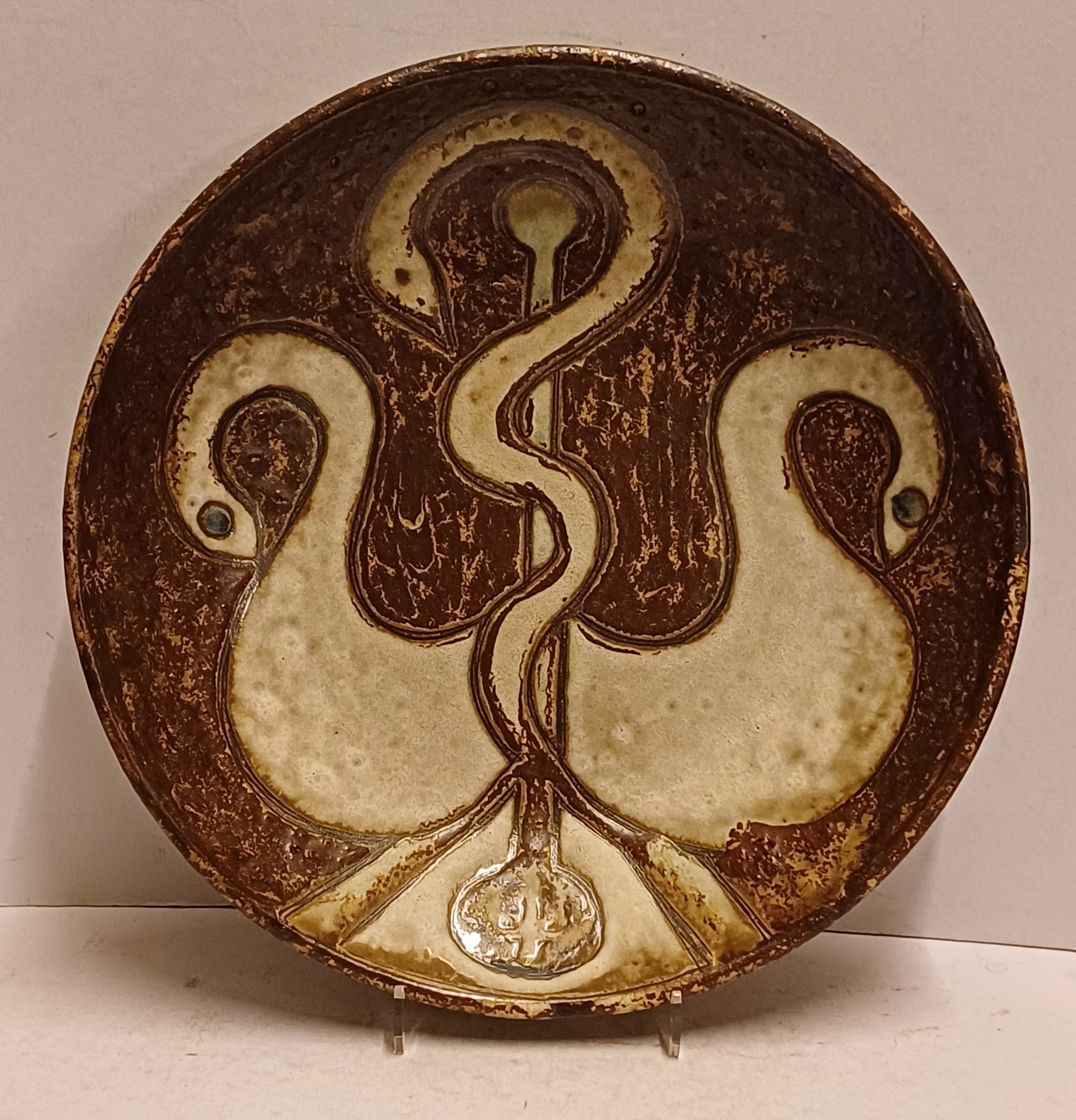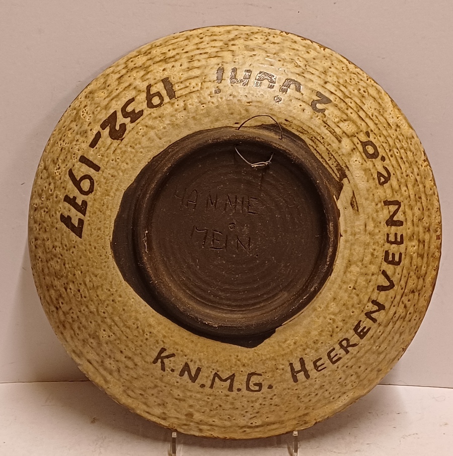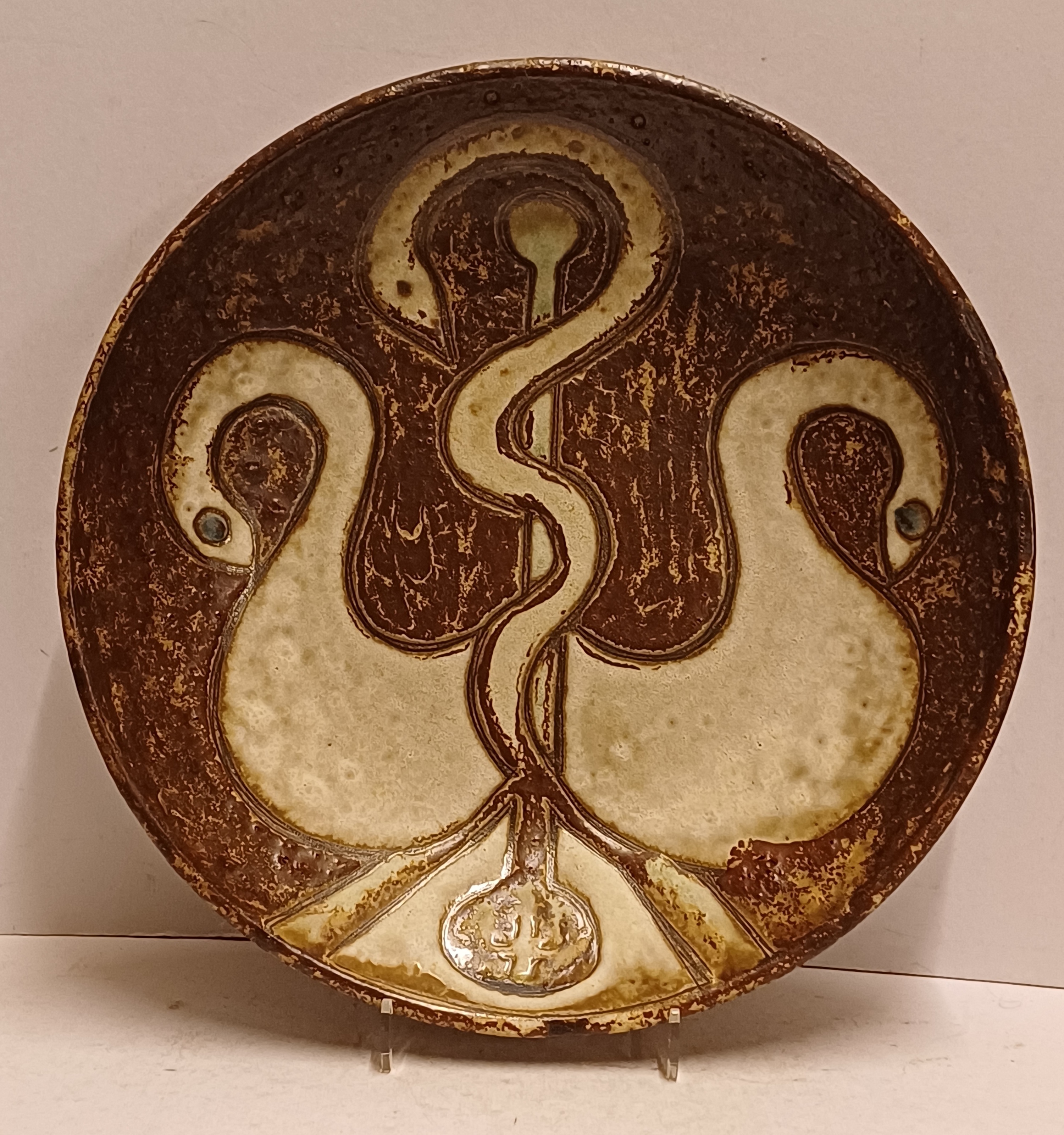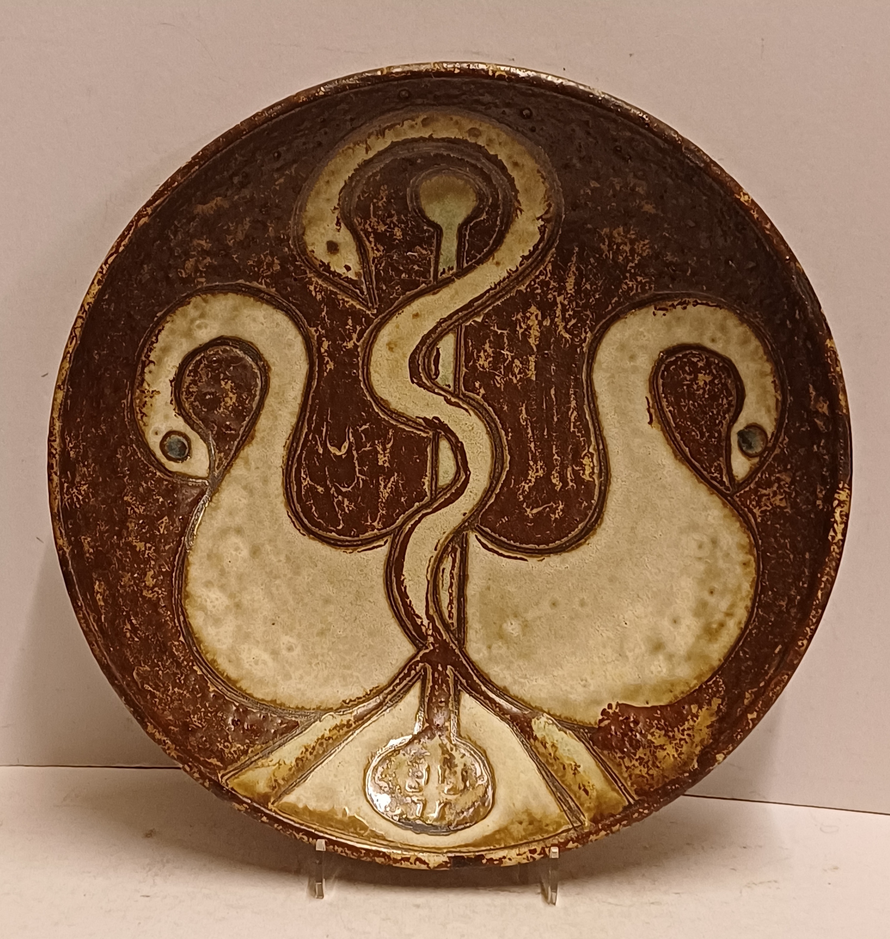 Aardewerken wandbord met decor van 2 zwanen met een esculaap. Achterzijde de tekst K.N.M.G. Heerenveen 2juni 1932-1977.