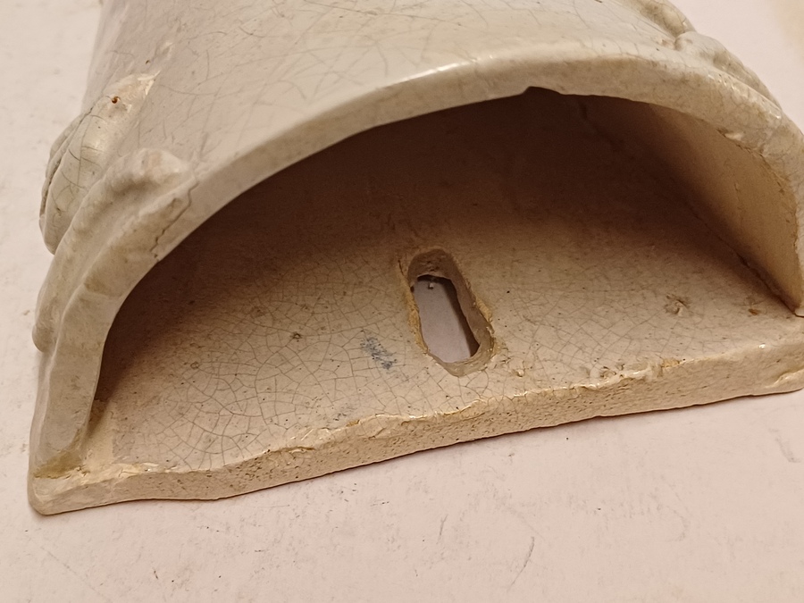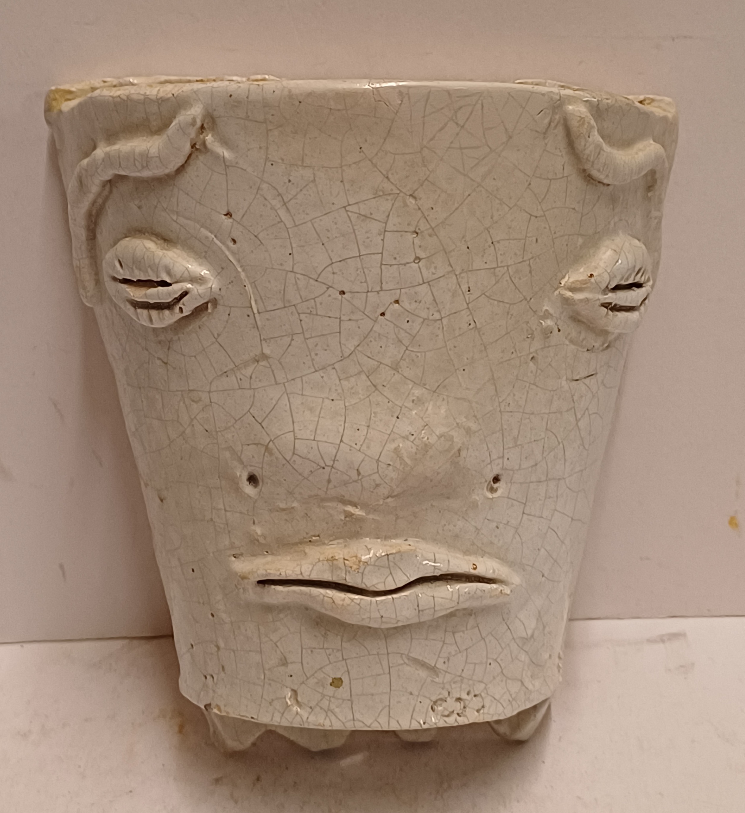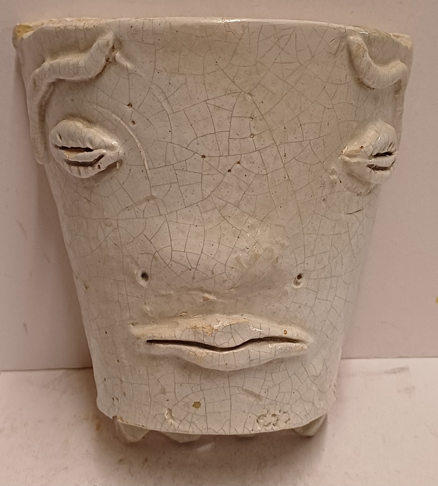 Weiß glasierte Wandvase mit einem Gesichtsausdruck. 2 mal signiert HH KO und datiert '59.