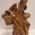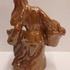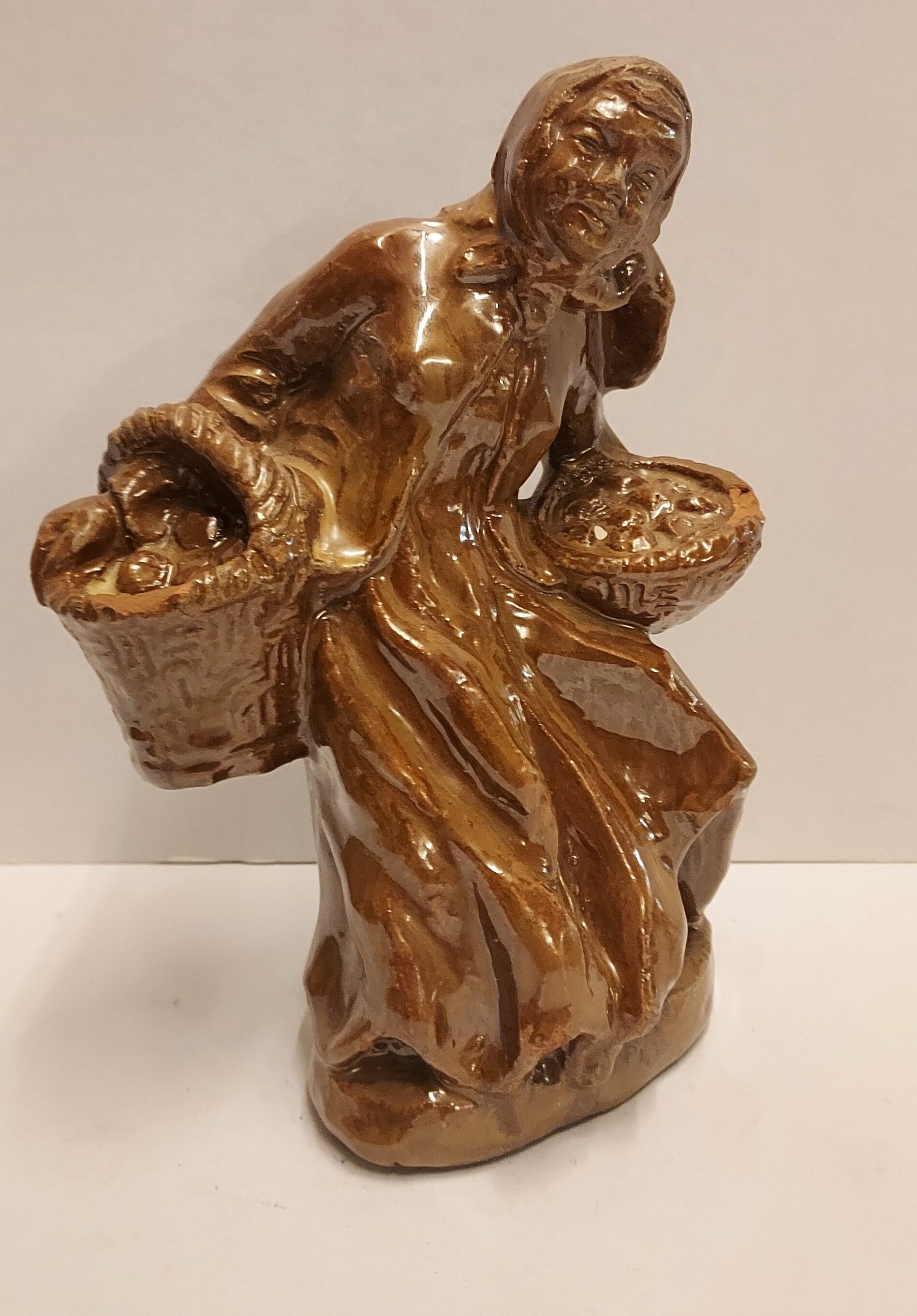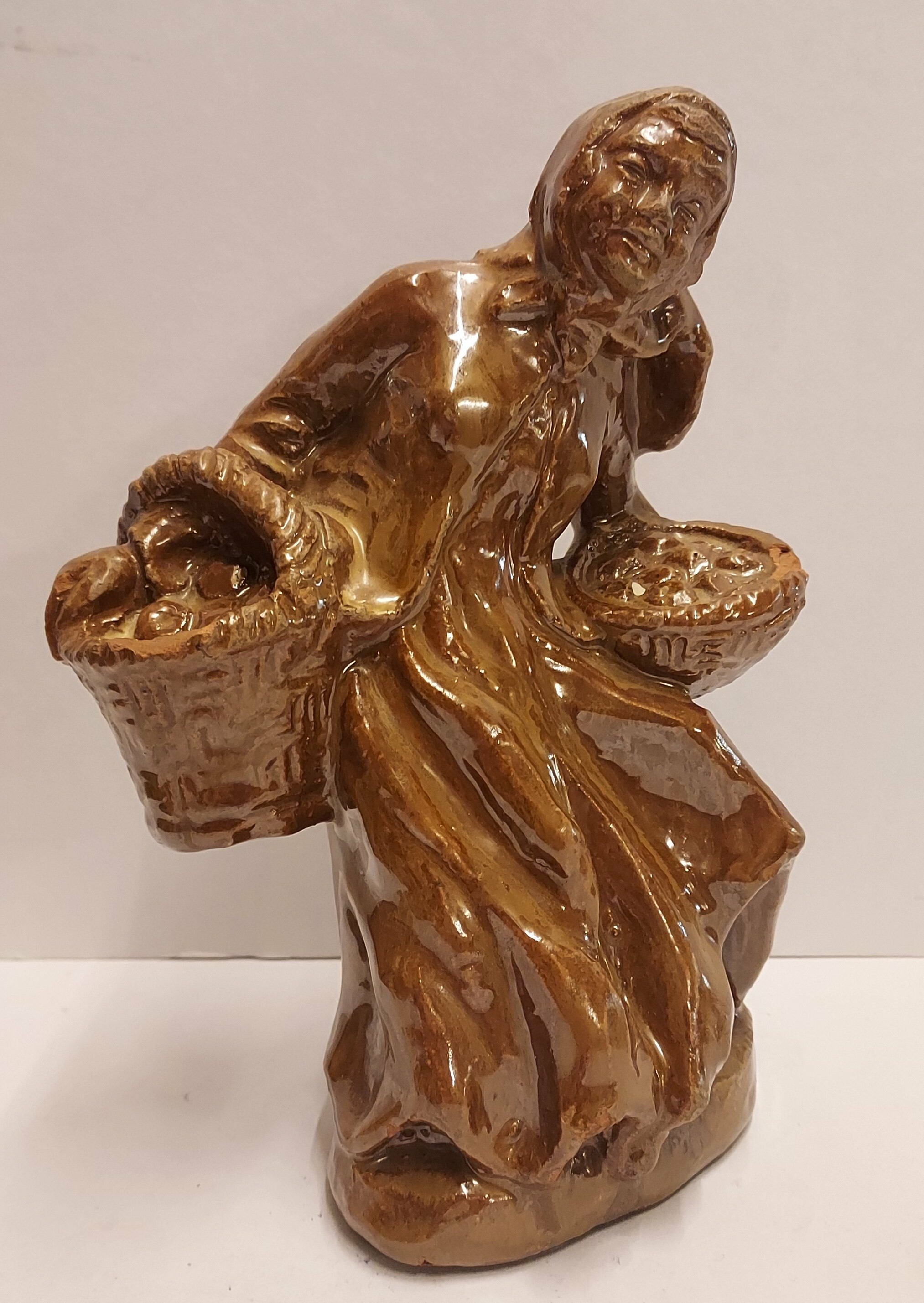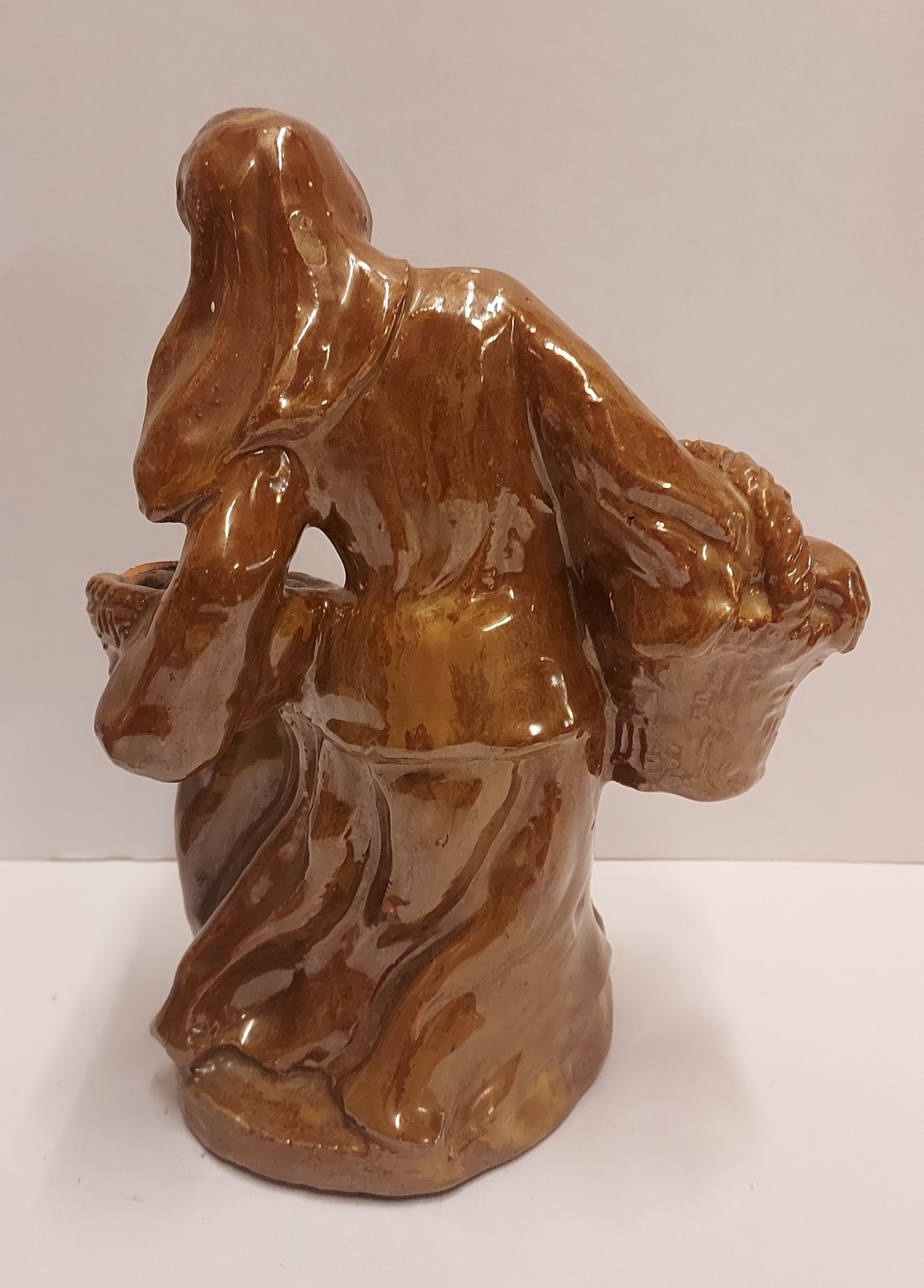 Terracotta statue with lead glaze. Depiction of an old lady with 2 baskets. Interior with scratched number.