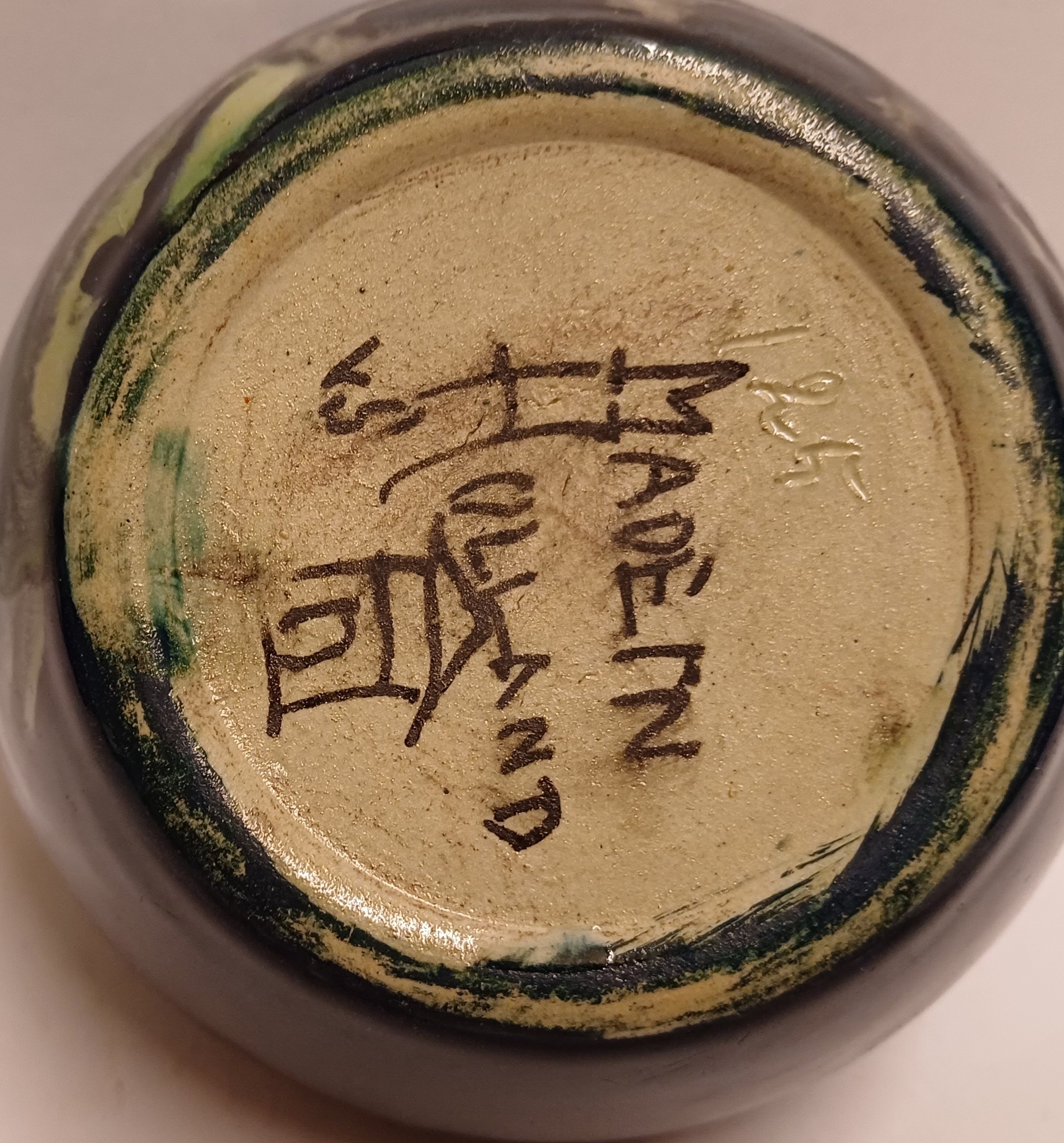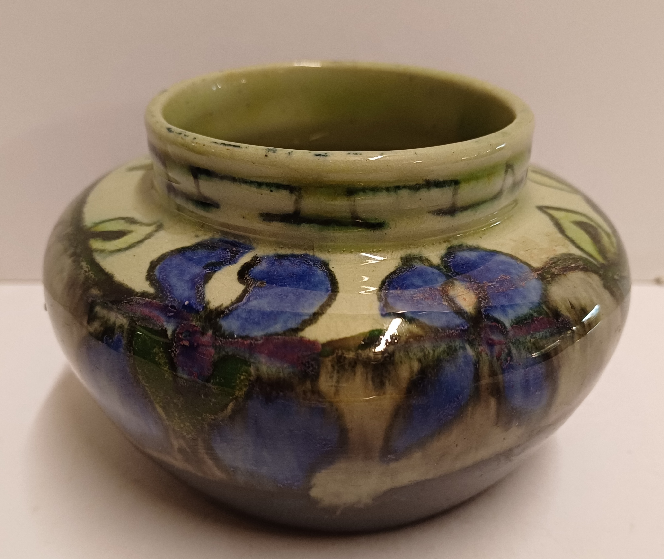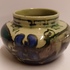 Early glossy earthenware flower pot with stylized floral decor. Bottom with factory mark.