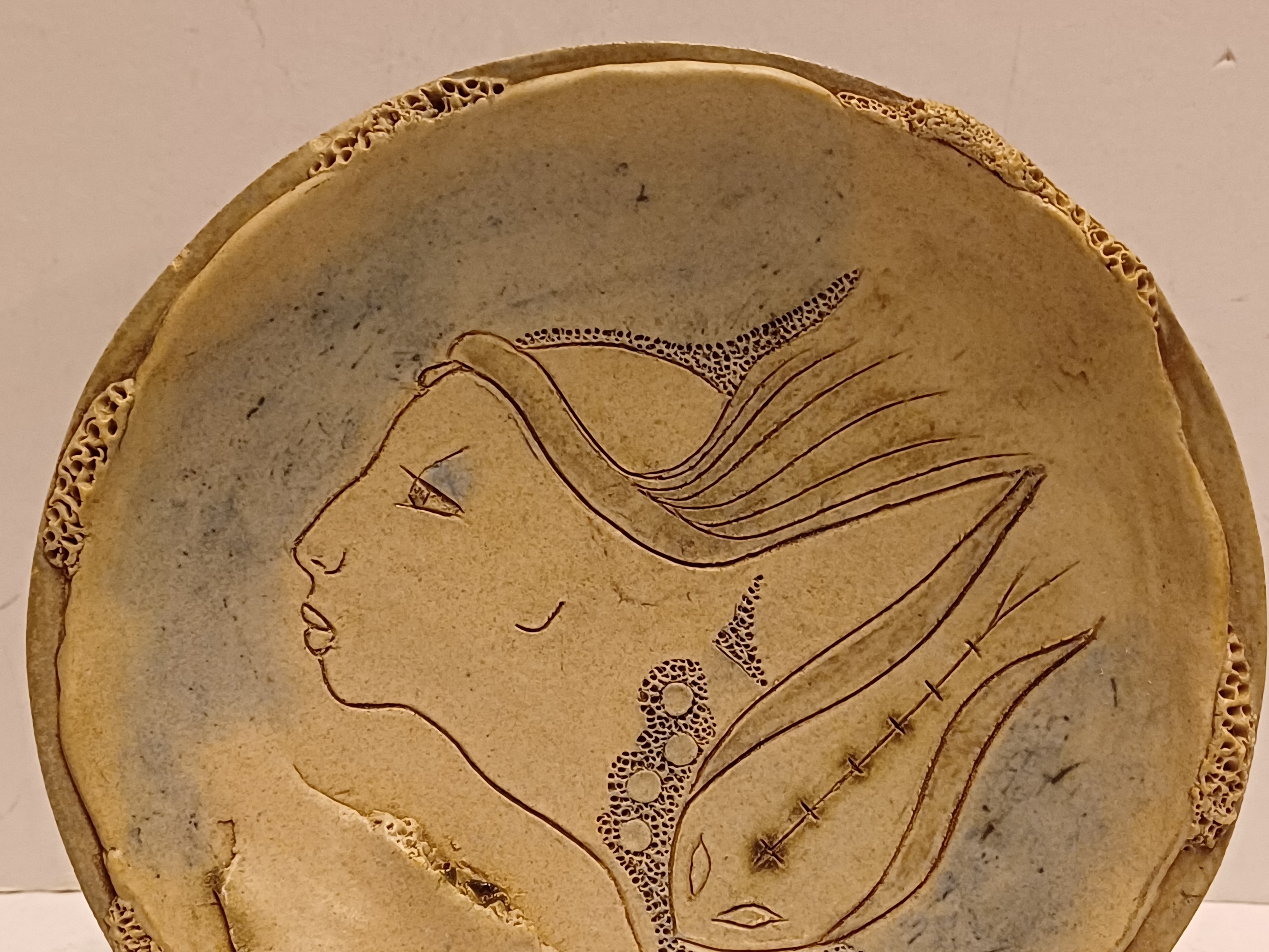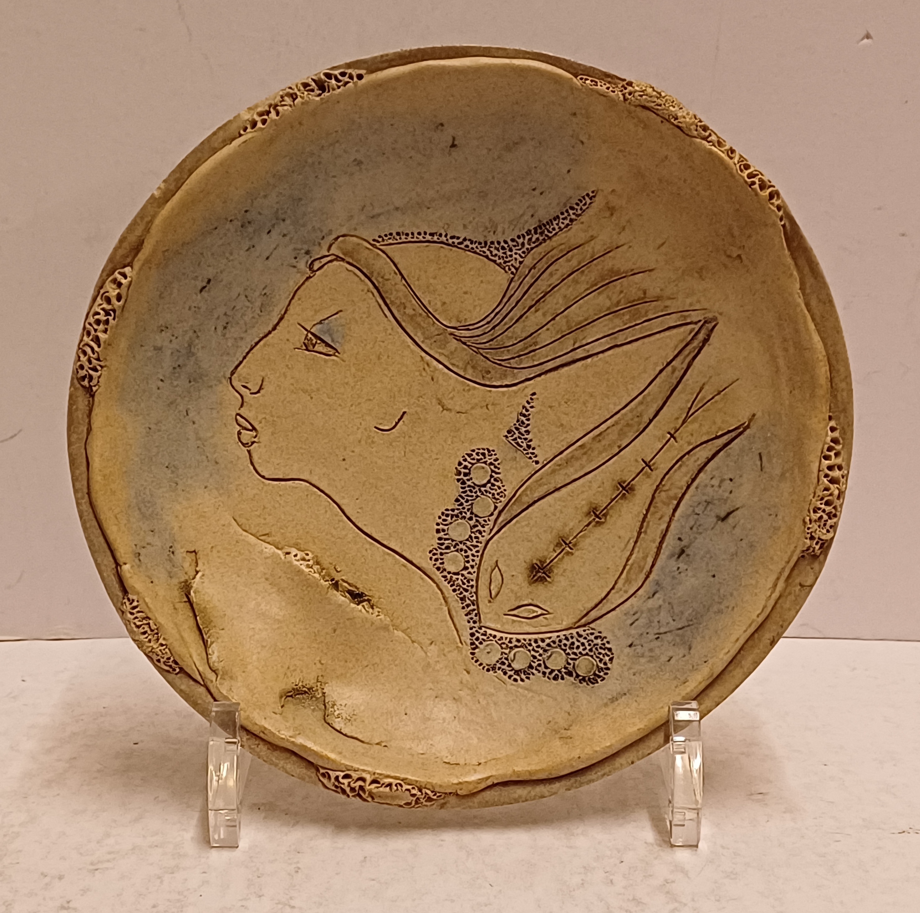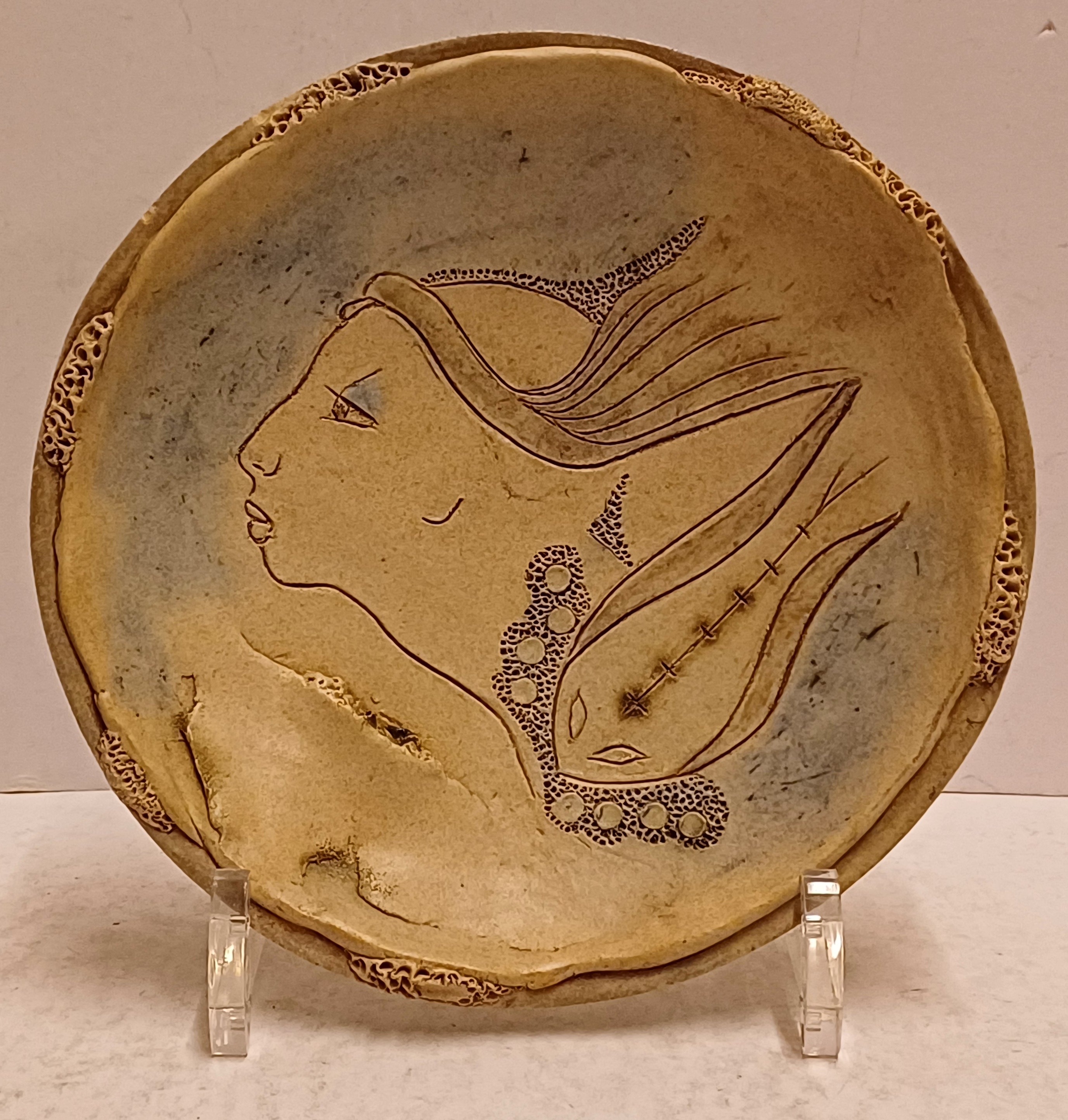 Aardewerken bord met decoratie van een vrouwengezicht. Achterzijde gesigneerd.