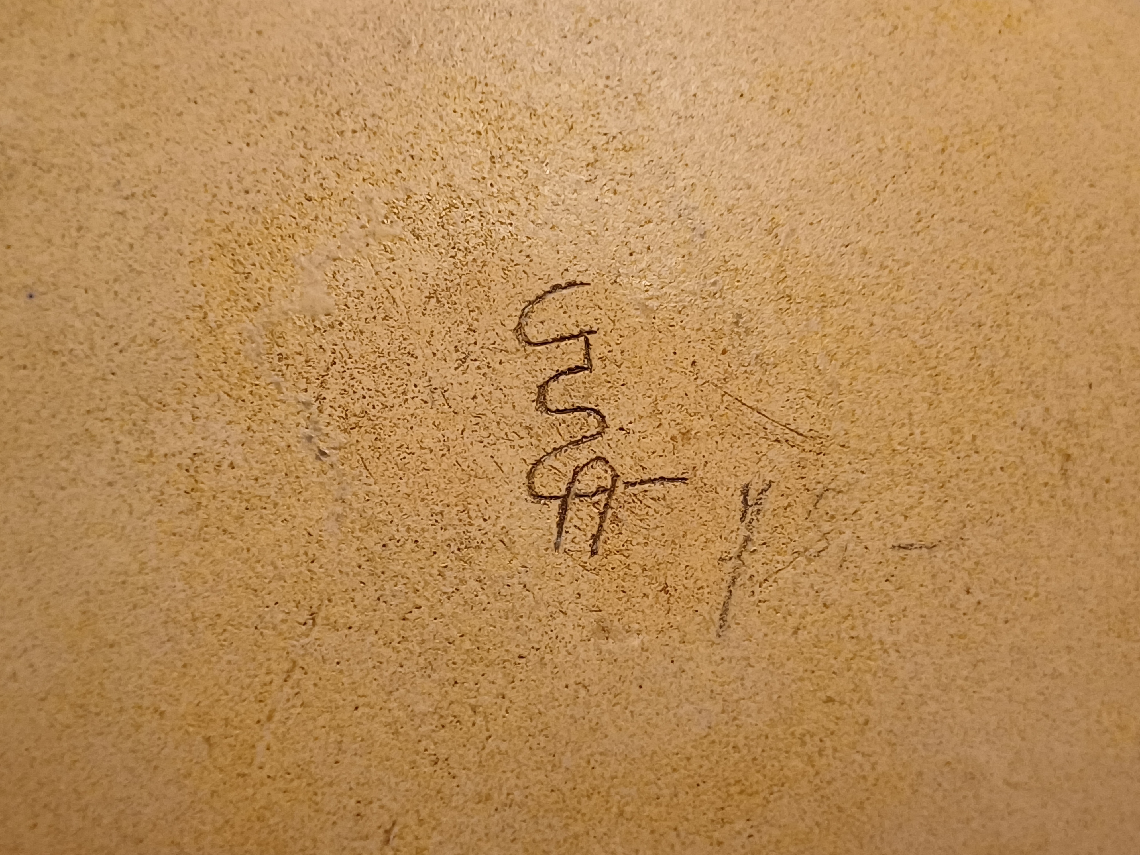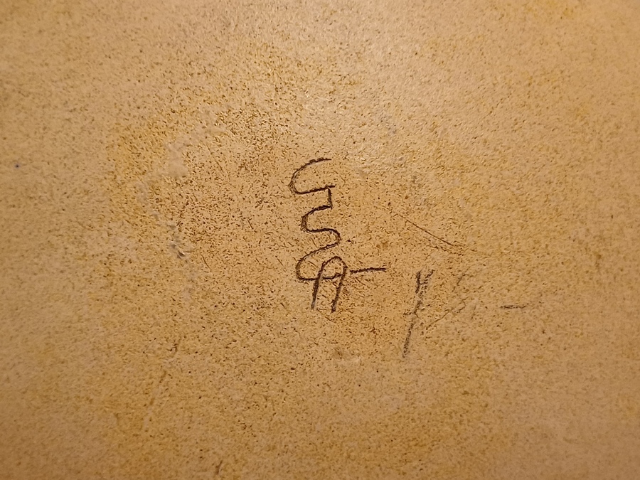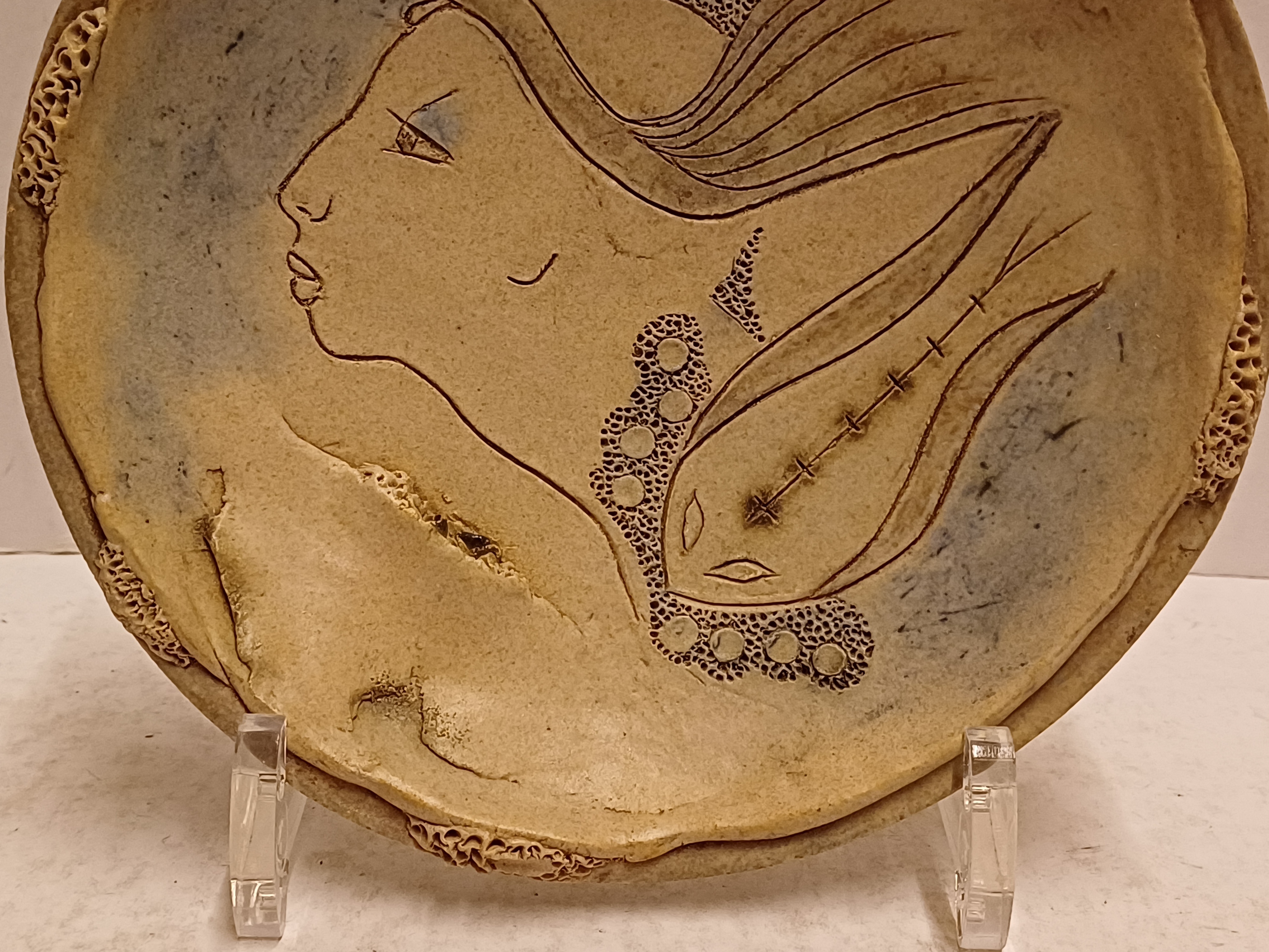 Aardewerken bord met decoratie van een vrouwengezicht. Achterzijde gesigneerd.
