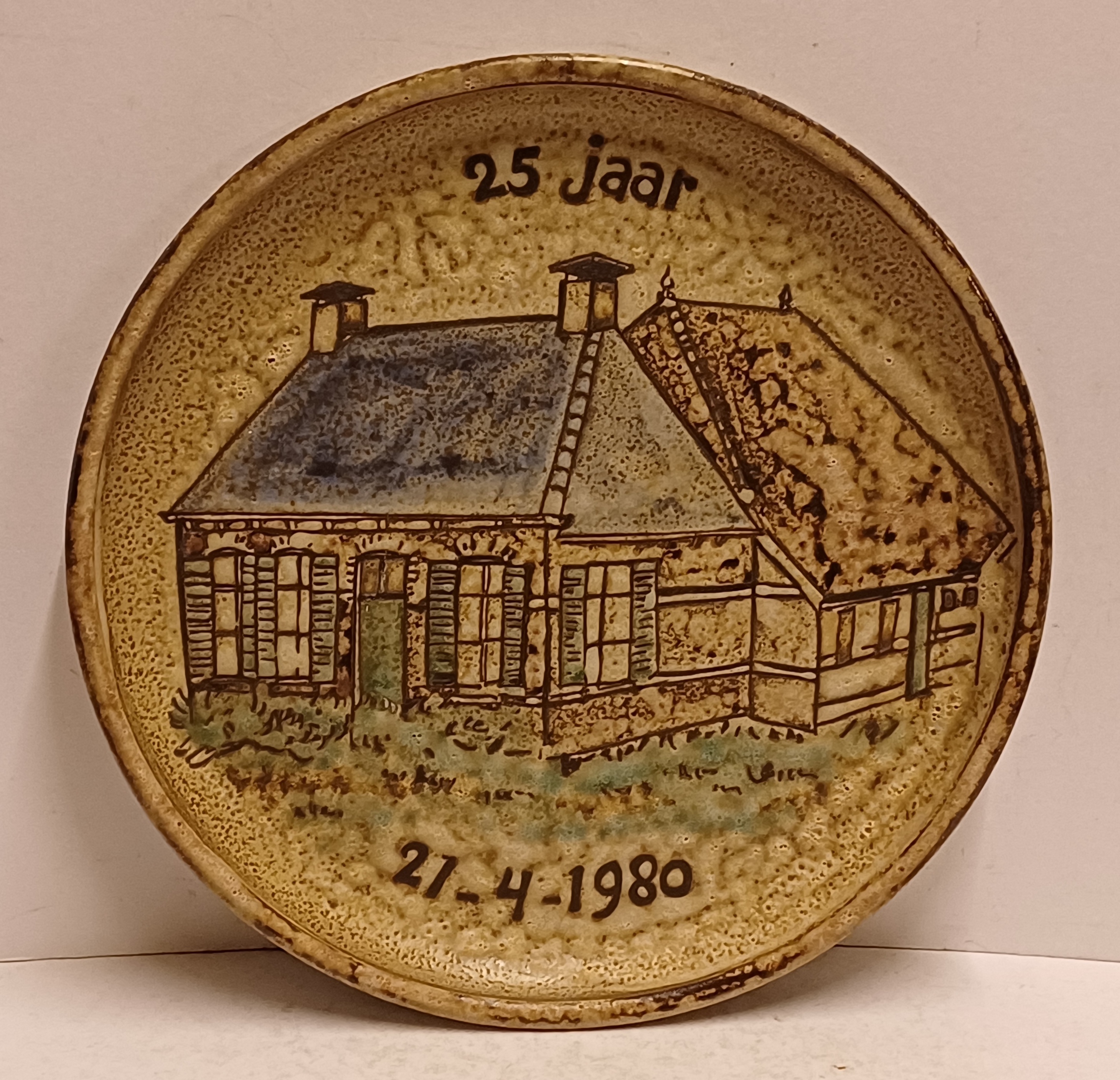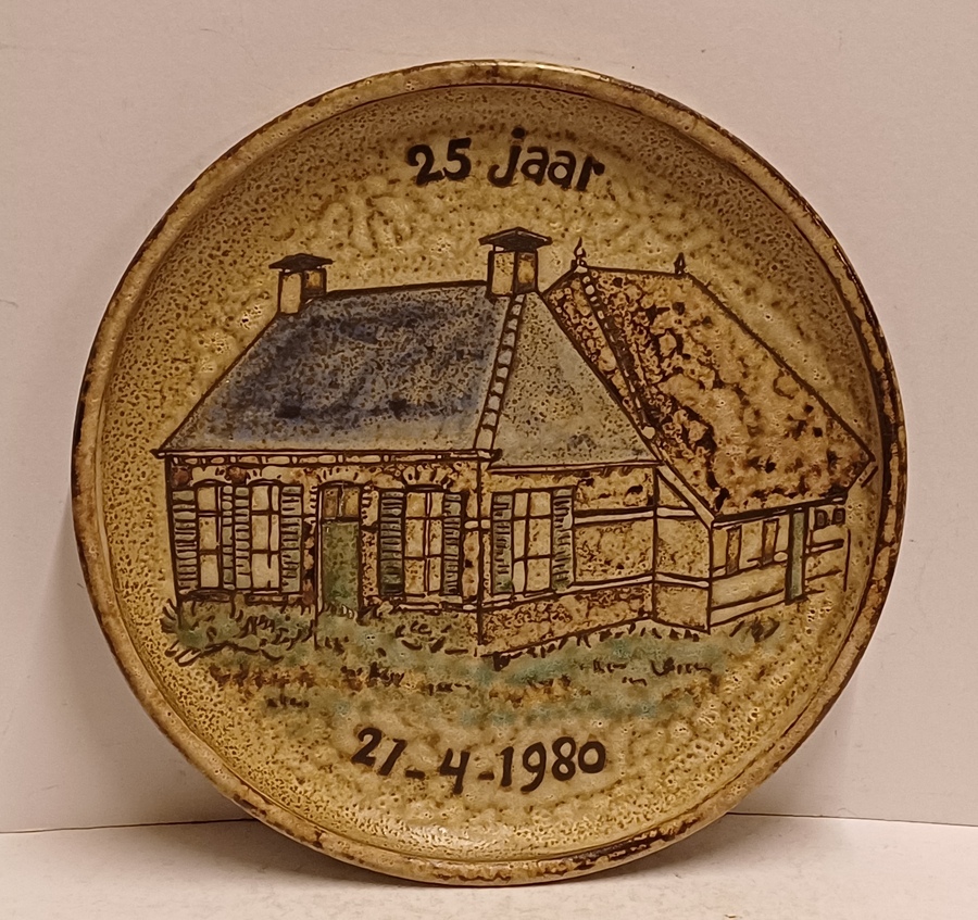 Aardewerken bord met decoratie van een boerderij met de tekst "25 jaar 21-4-1980" Achterzijde gesigneerd