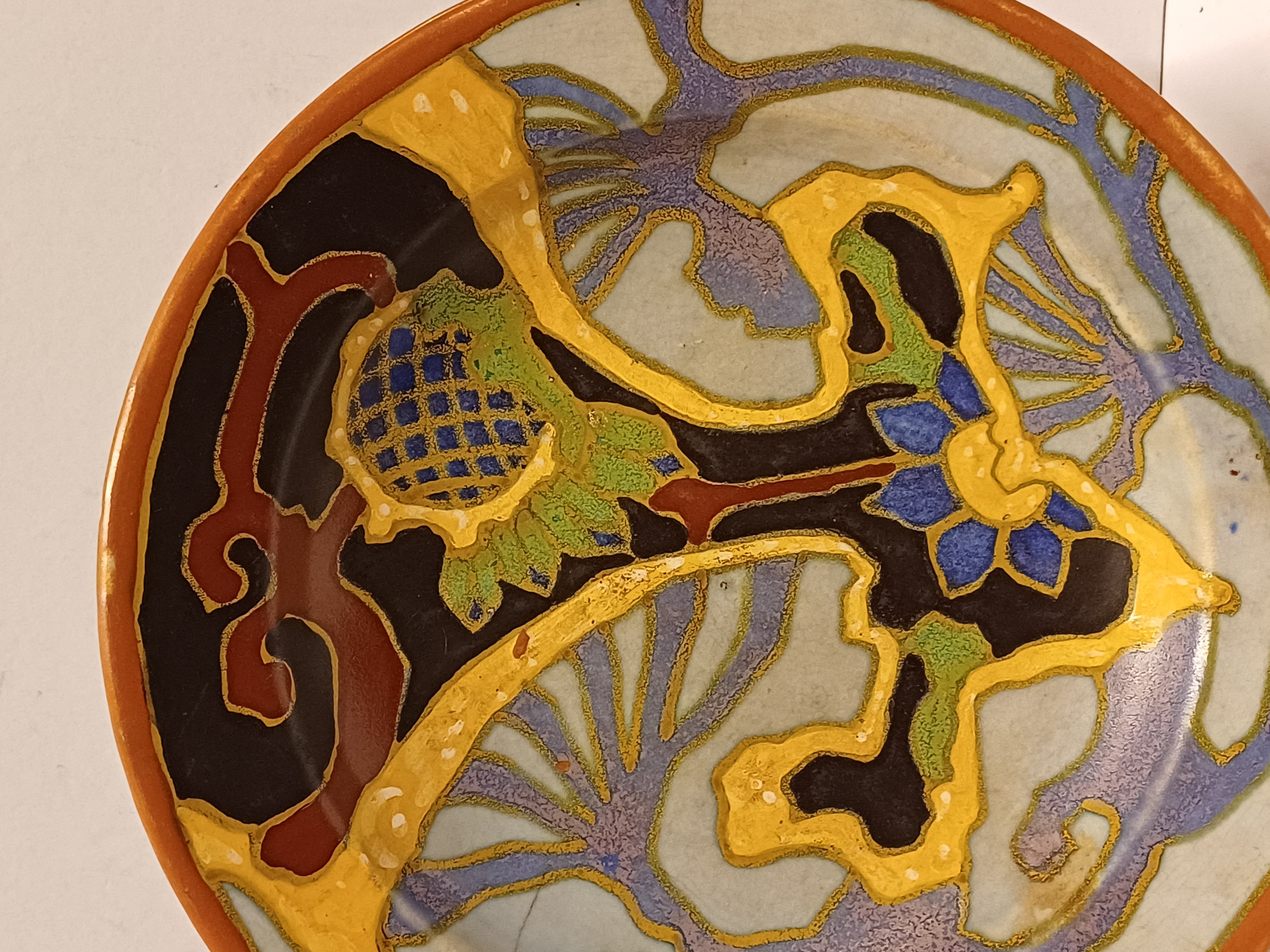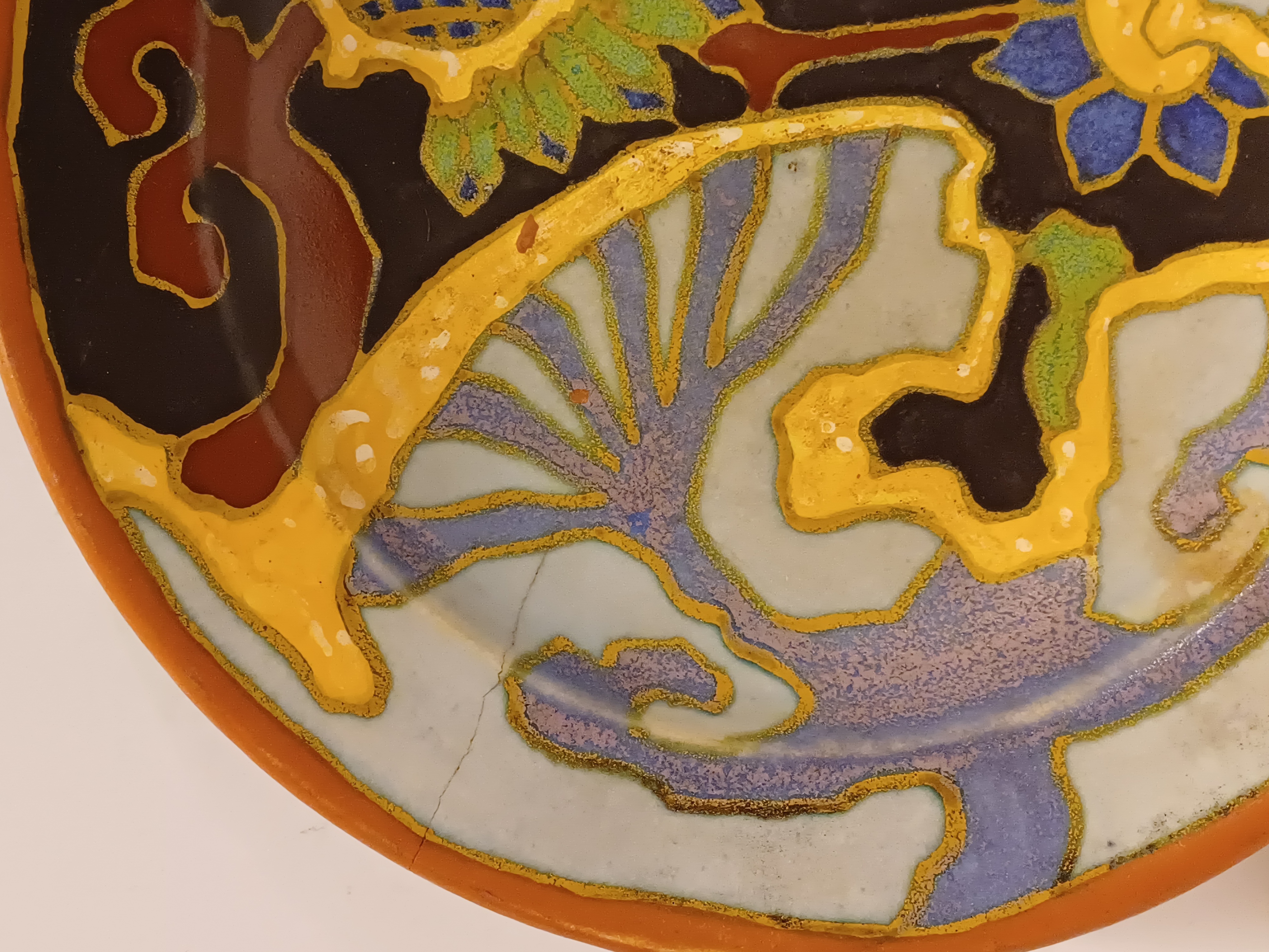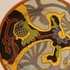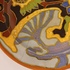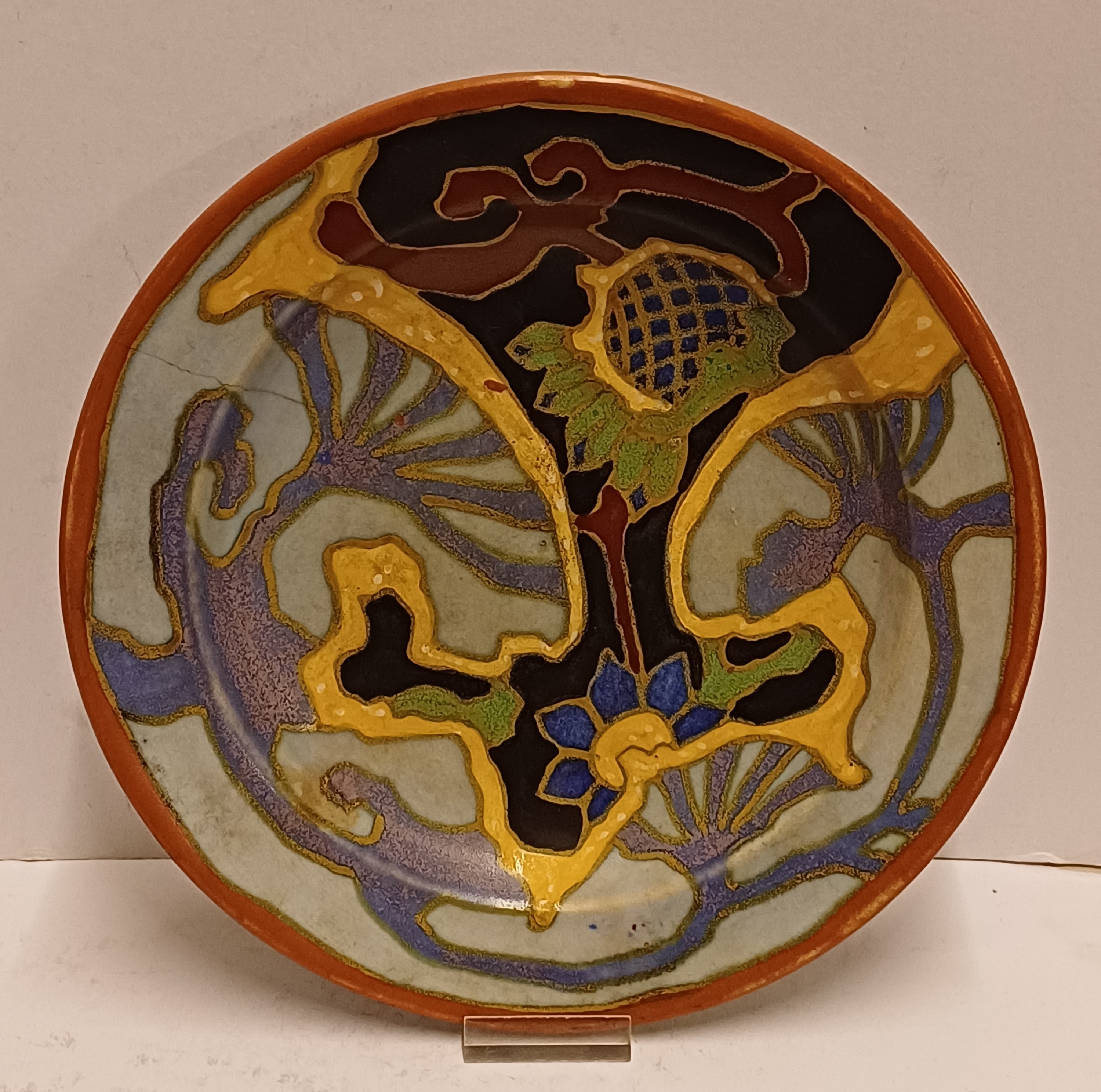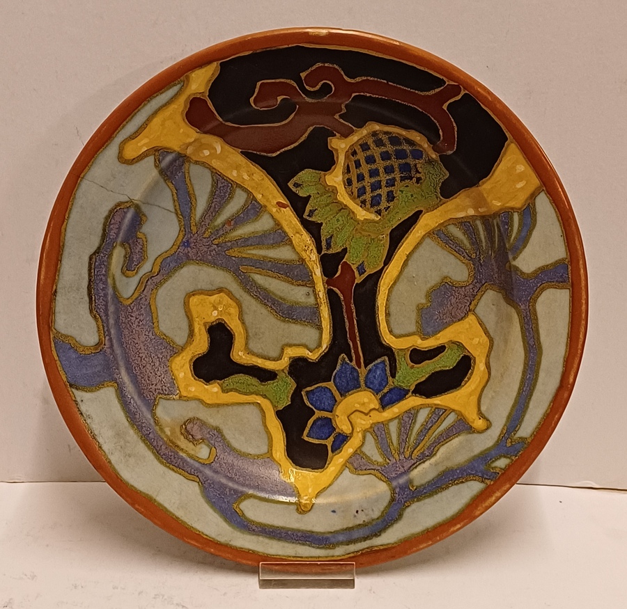 Platelen wandbord met geabstraheerd decor. Ontwerp van He nri Breetveltr voor PZH. Achterzijde met fabriewksmerk en decornaam Breetvelt.