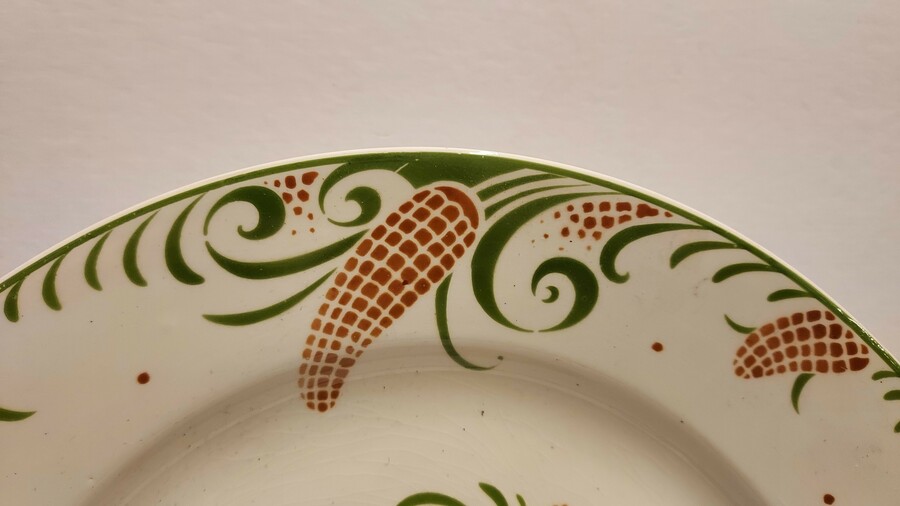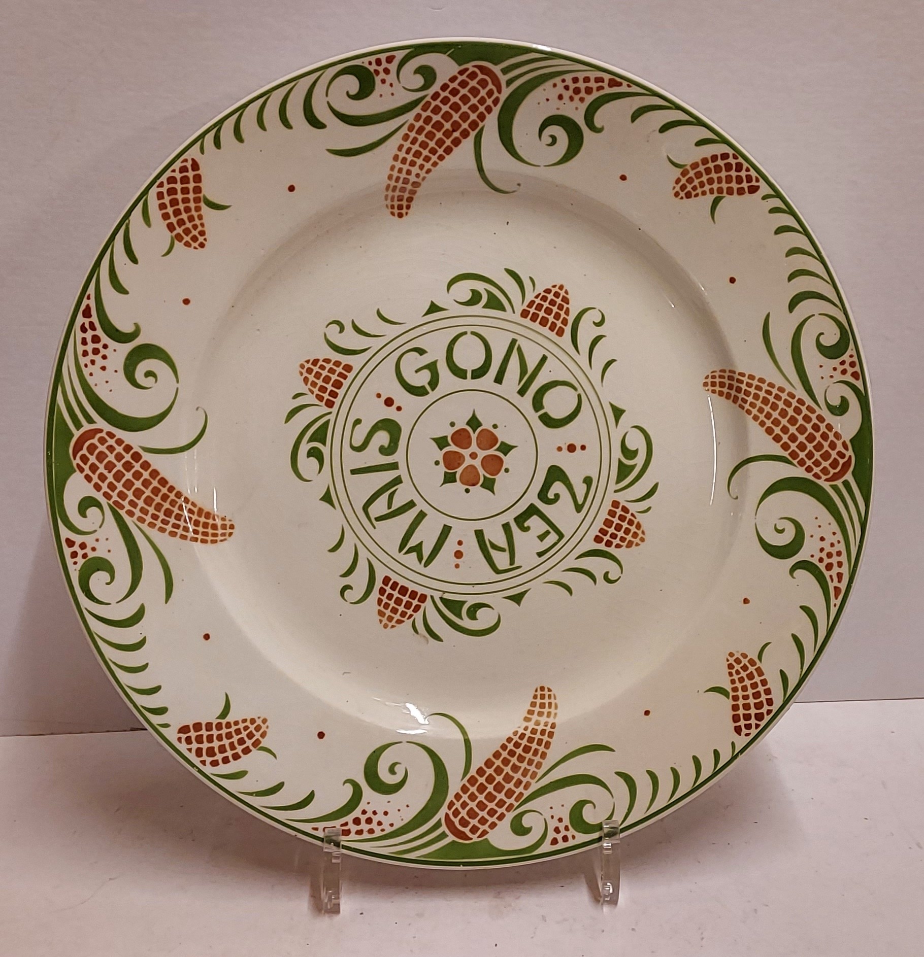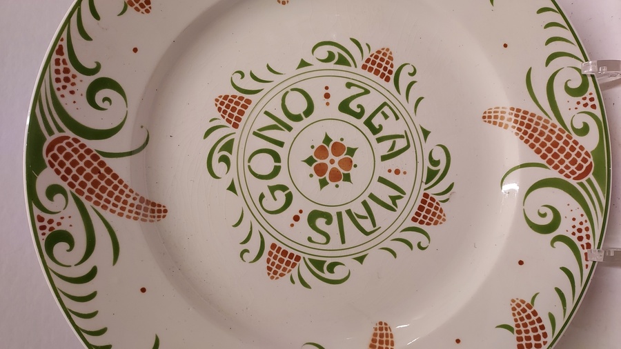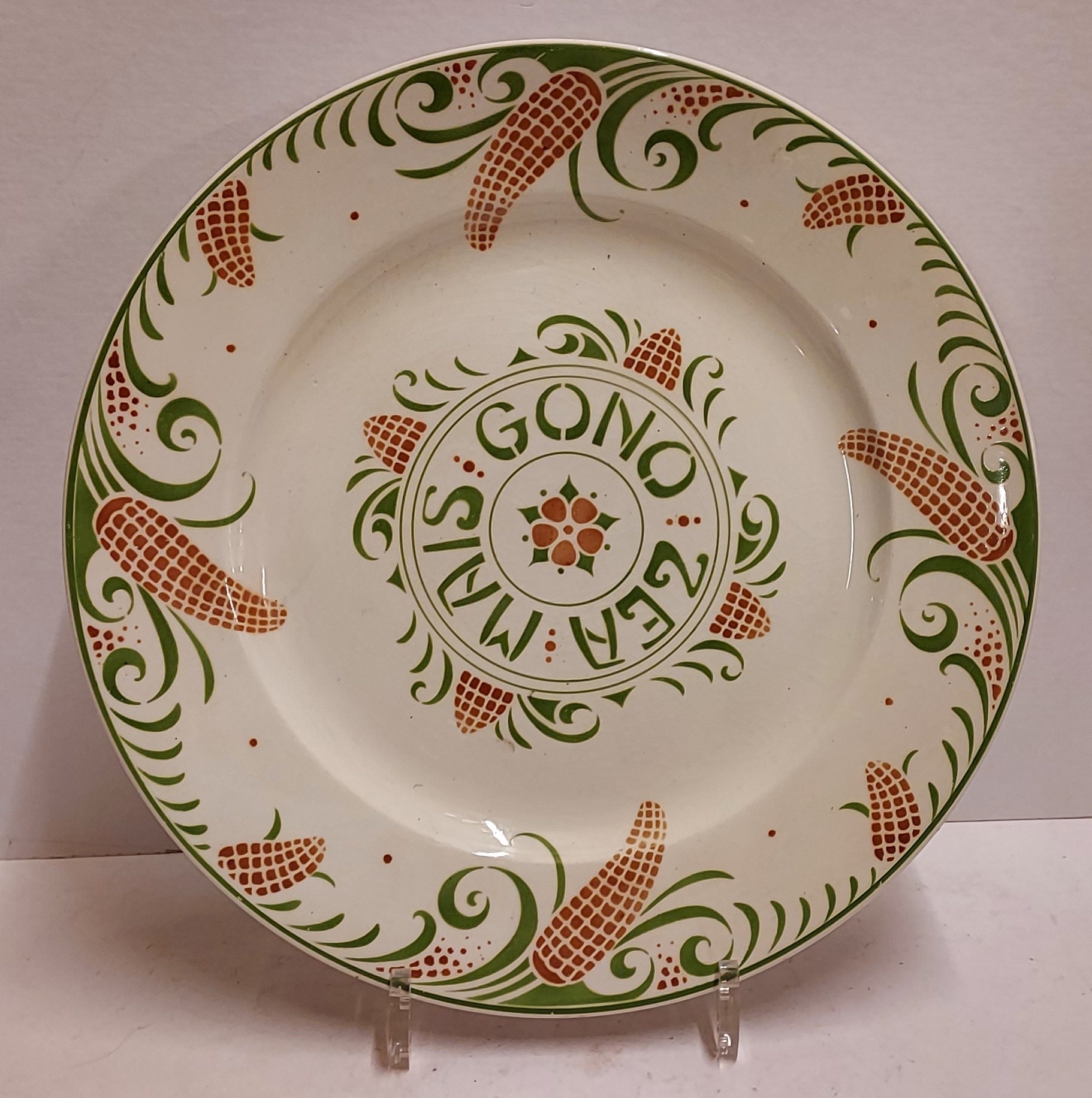 Decorated with corn cobs on the rim, with the text Gono Zea Mais on the flat. Reverse side with factory mark.