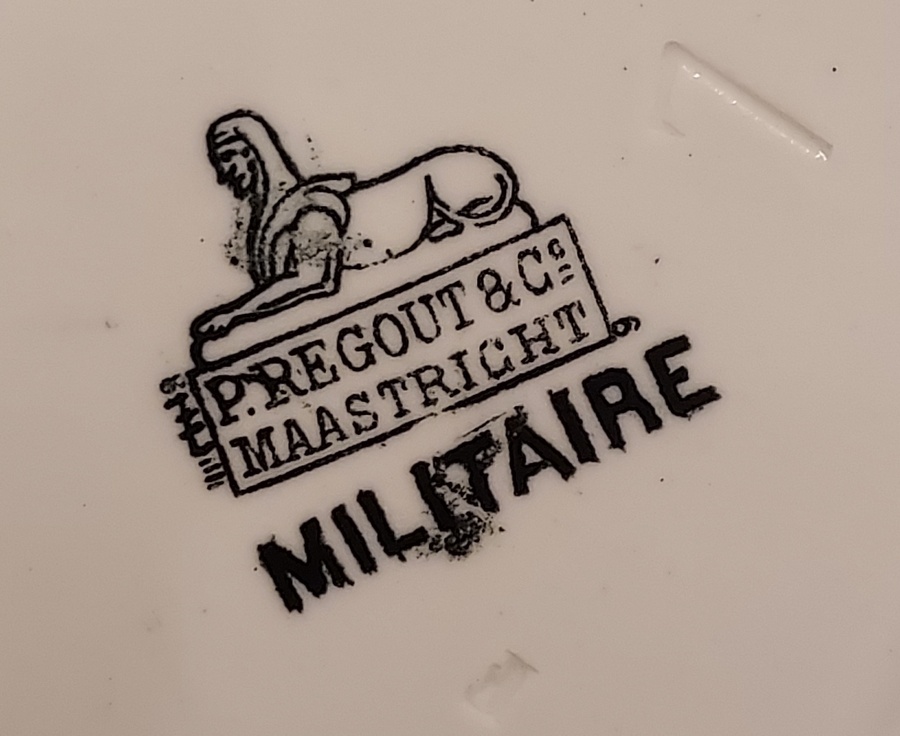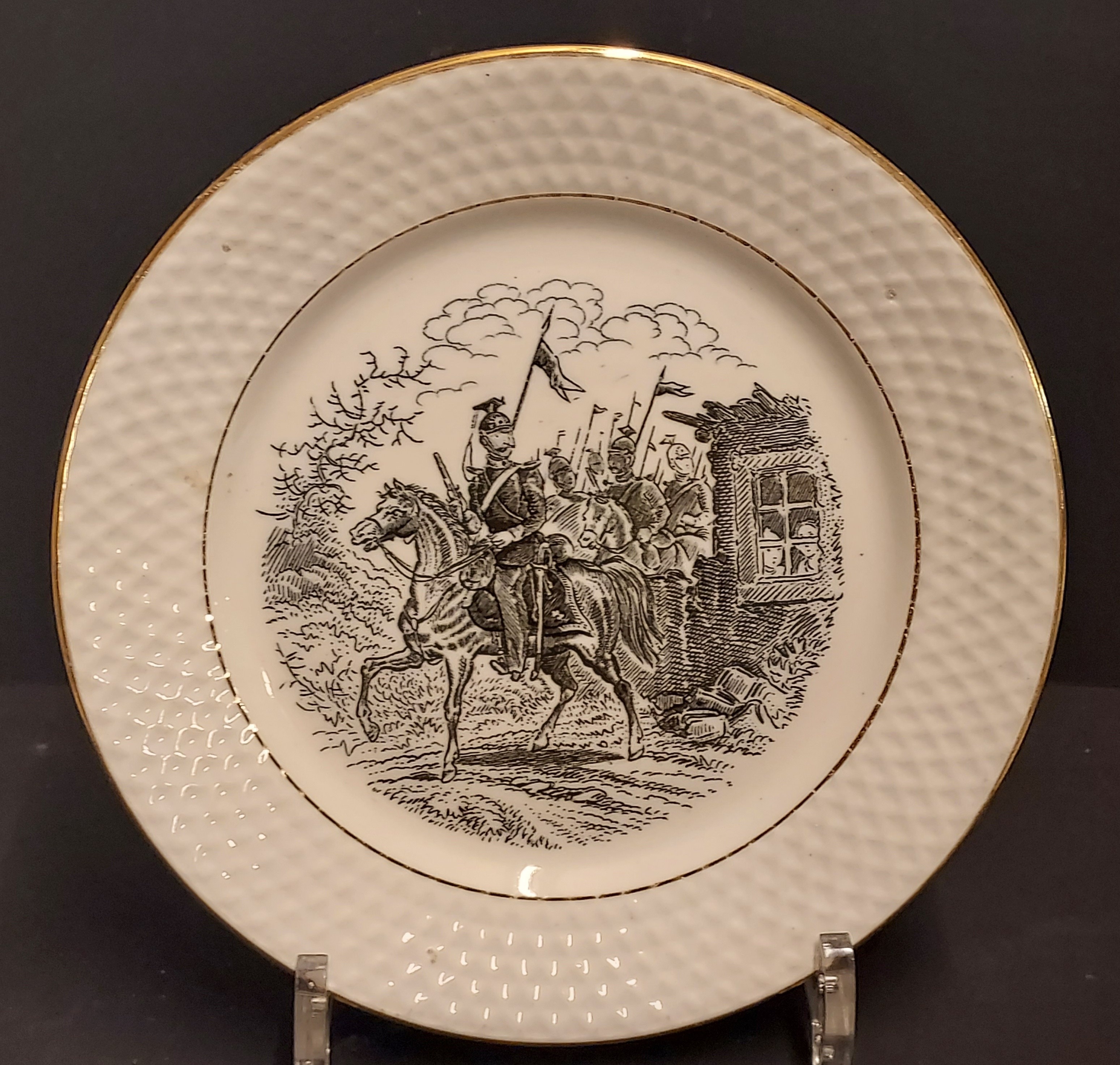 Monochrome black decor of a soldier on horseback. Reverse side with factory mark and peat dating. Production period 1879-1909.