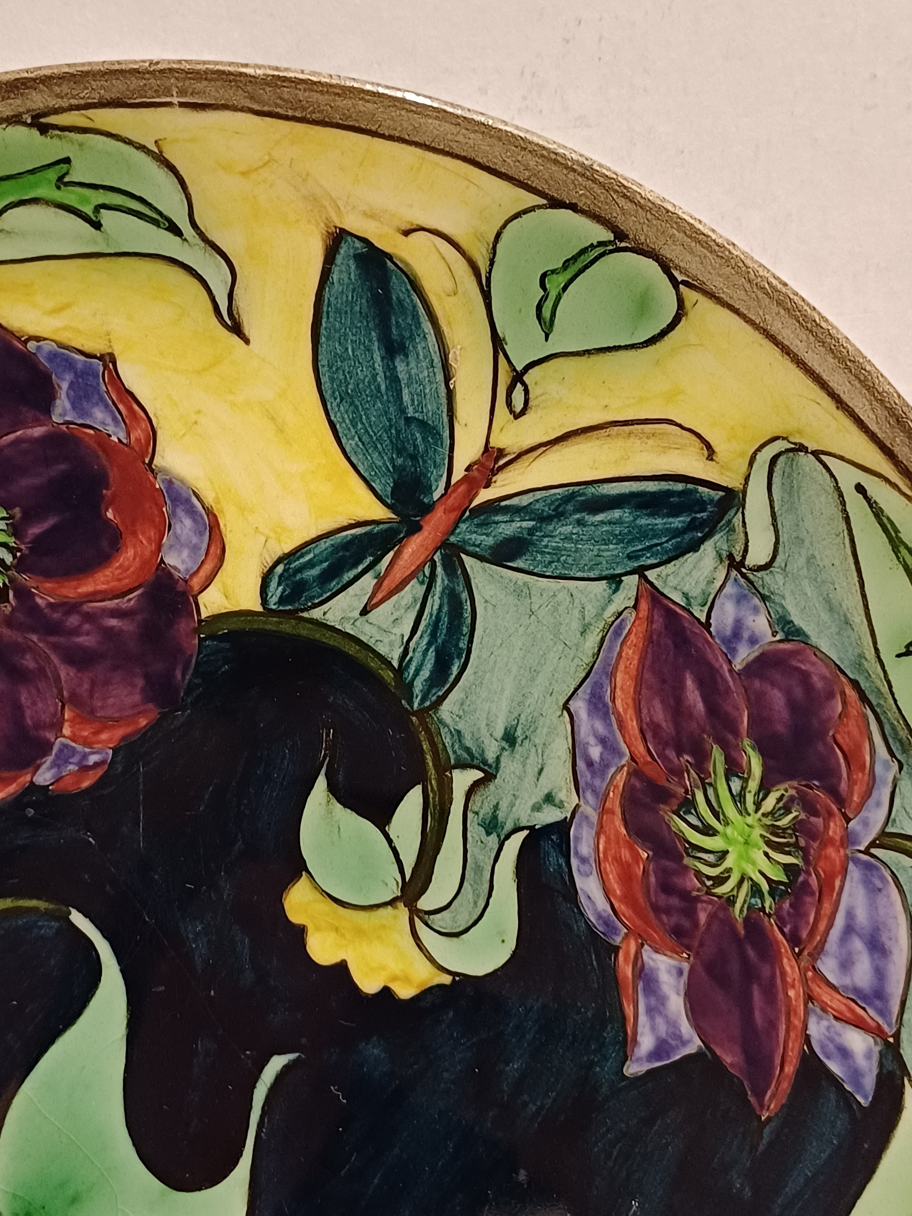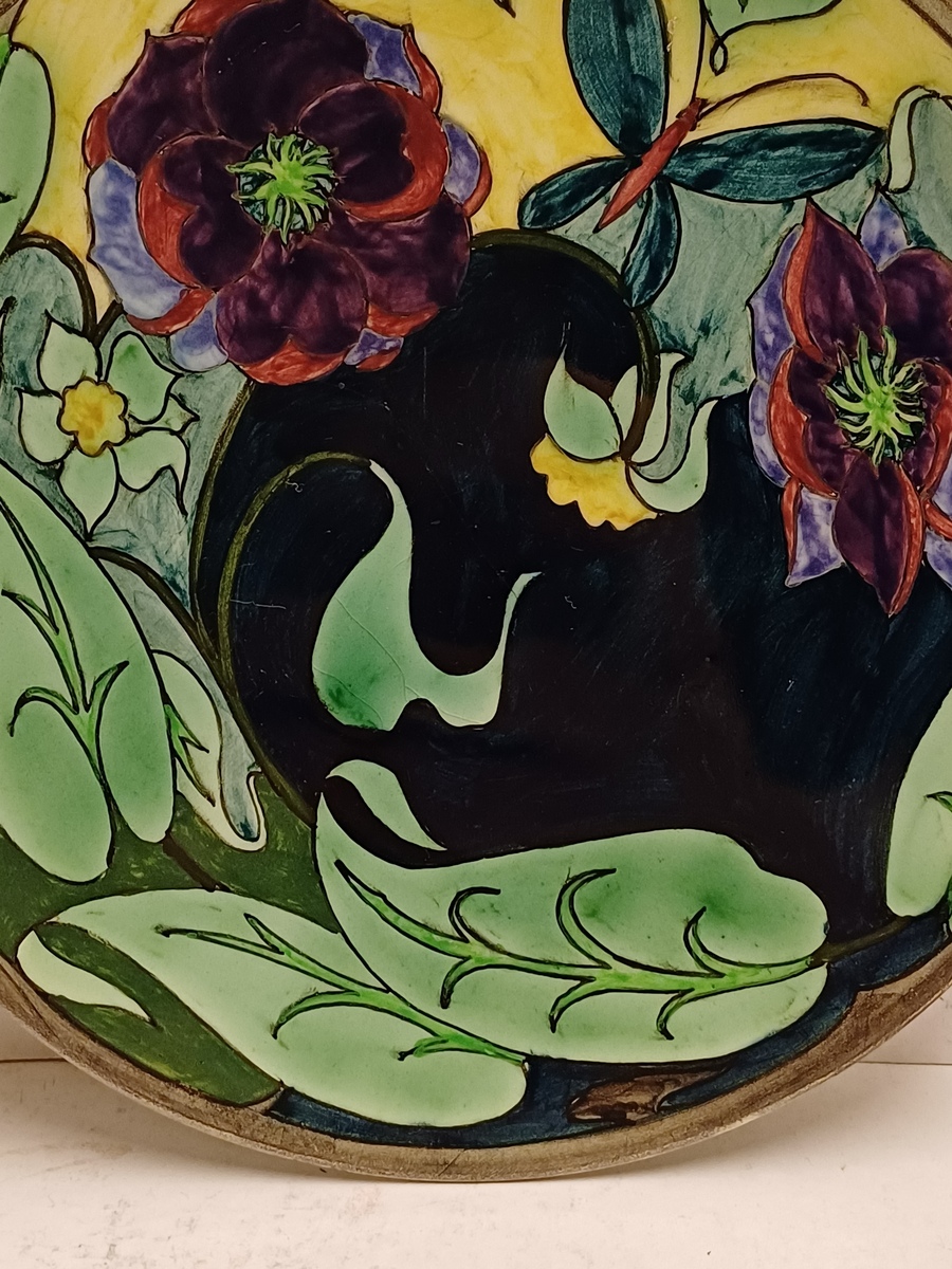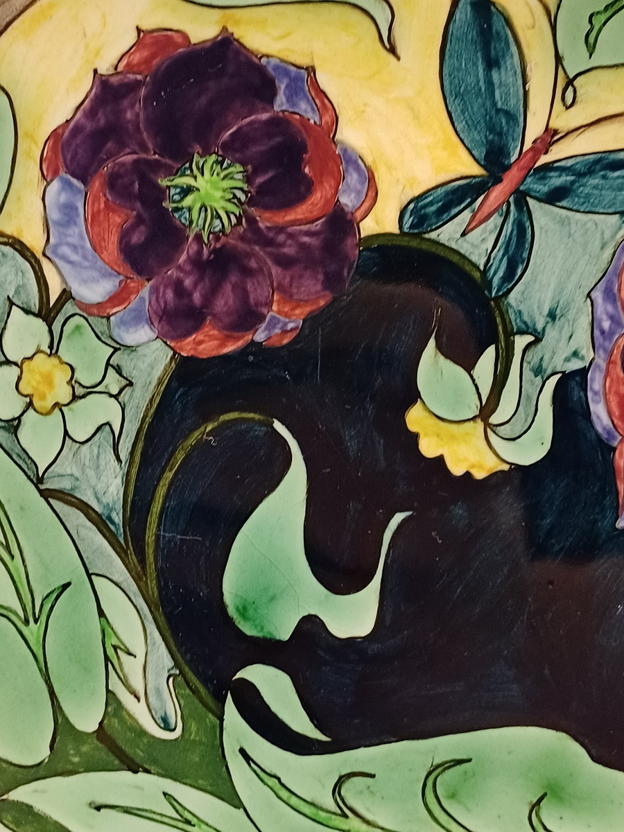 Vroeg glansplatelen bordje met decor van gestileerde flora m et vlinder. Achterzijde met fabrieksmerk.