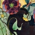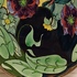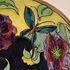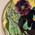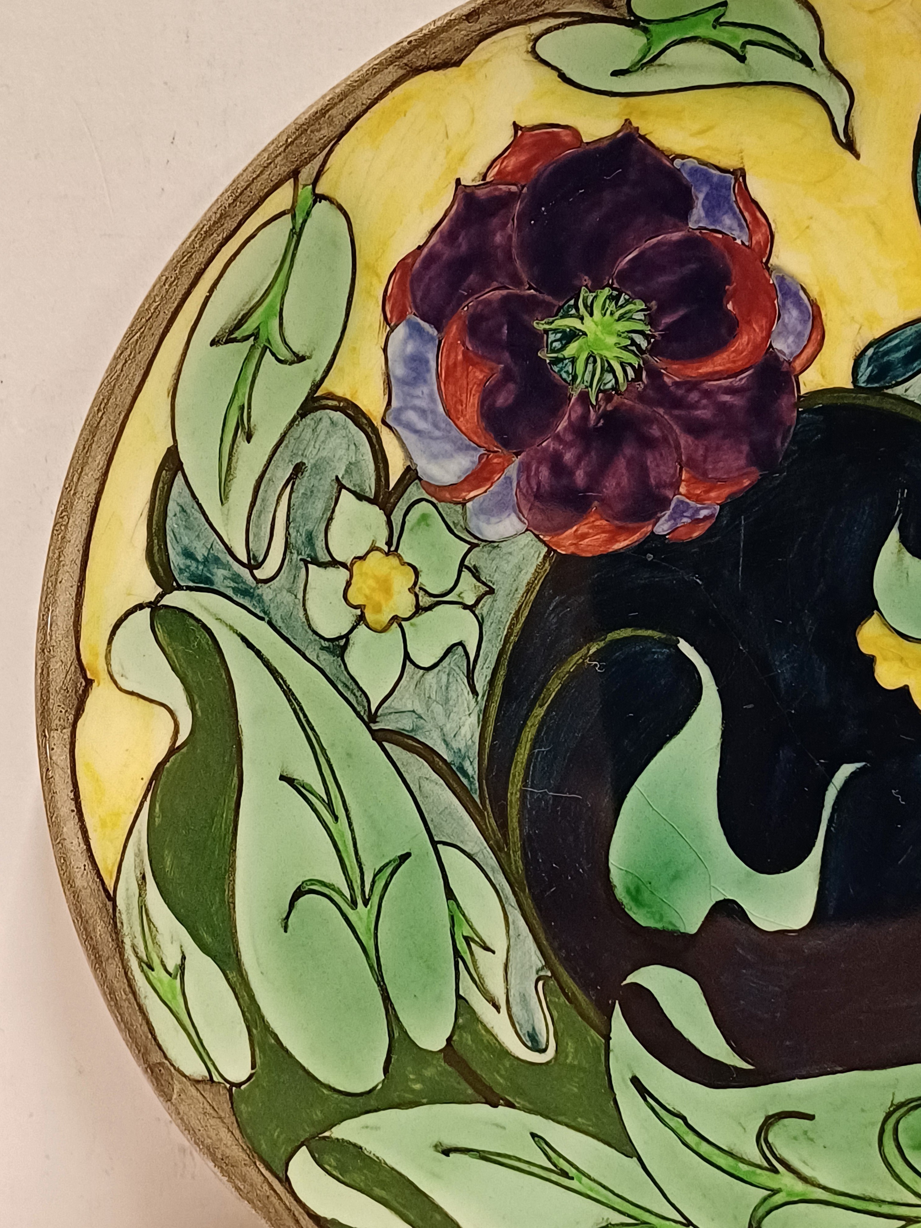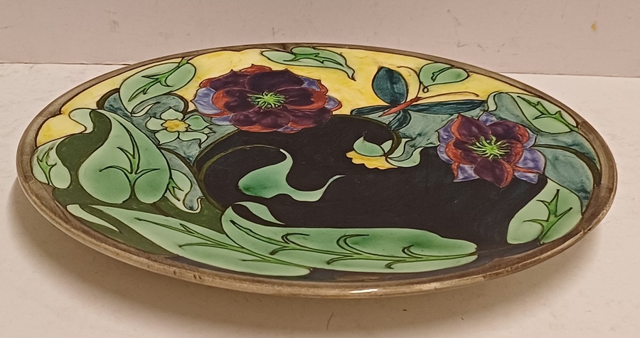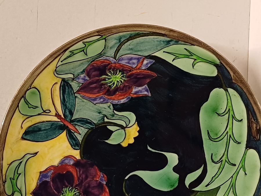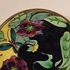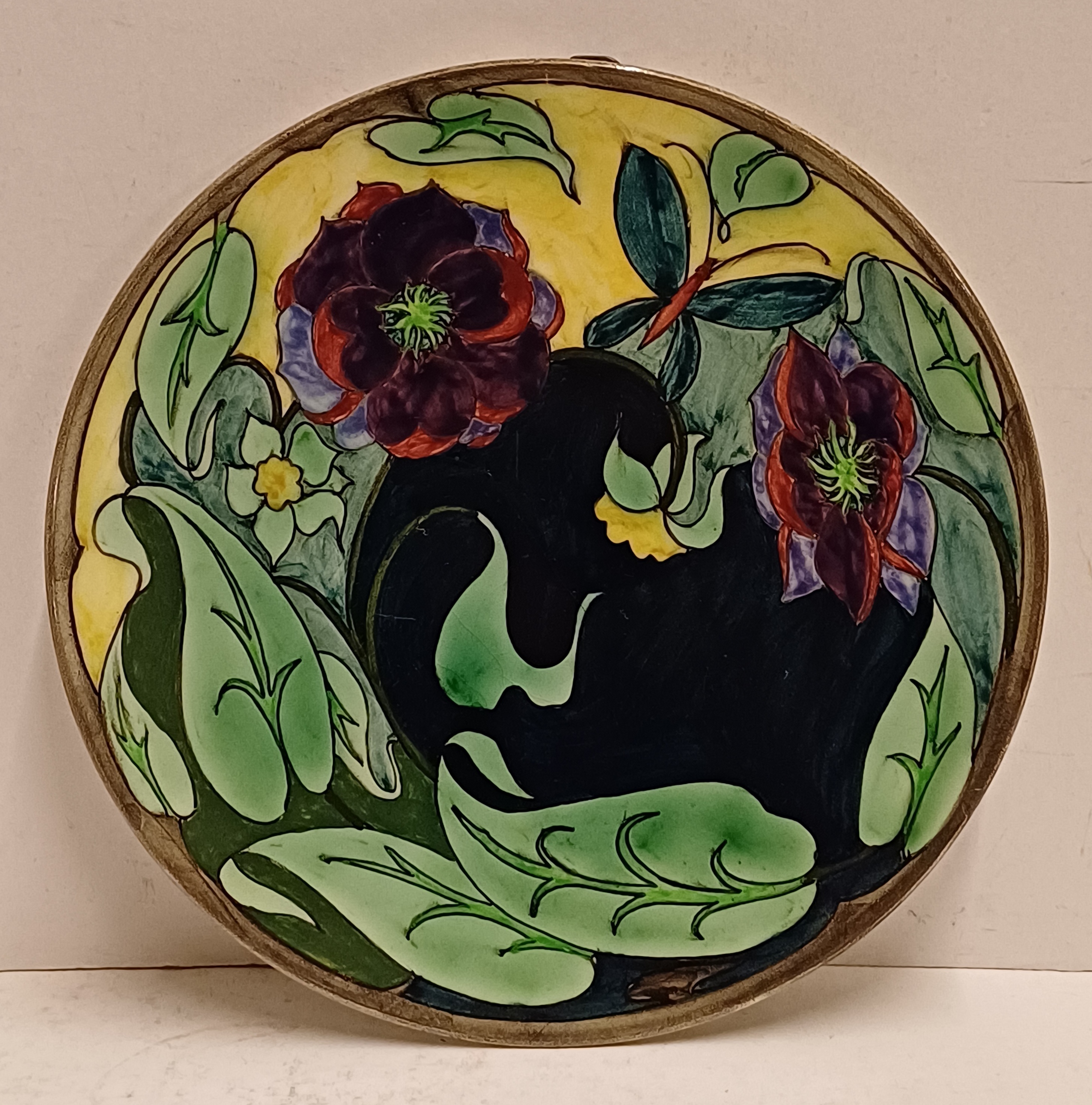 Vroeg glansplatelen bordje met decor van gestileerde flora m et vlinder. Achterzijde met fabrieksmerk.