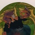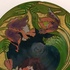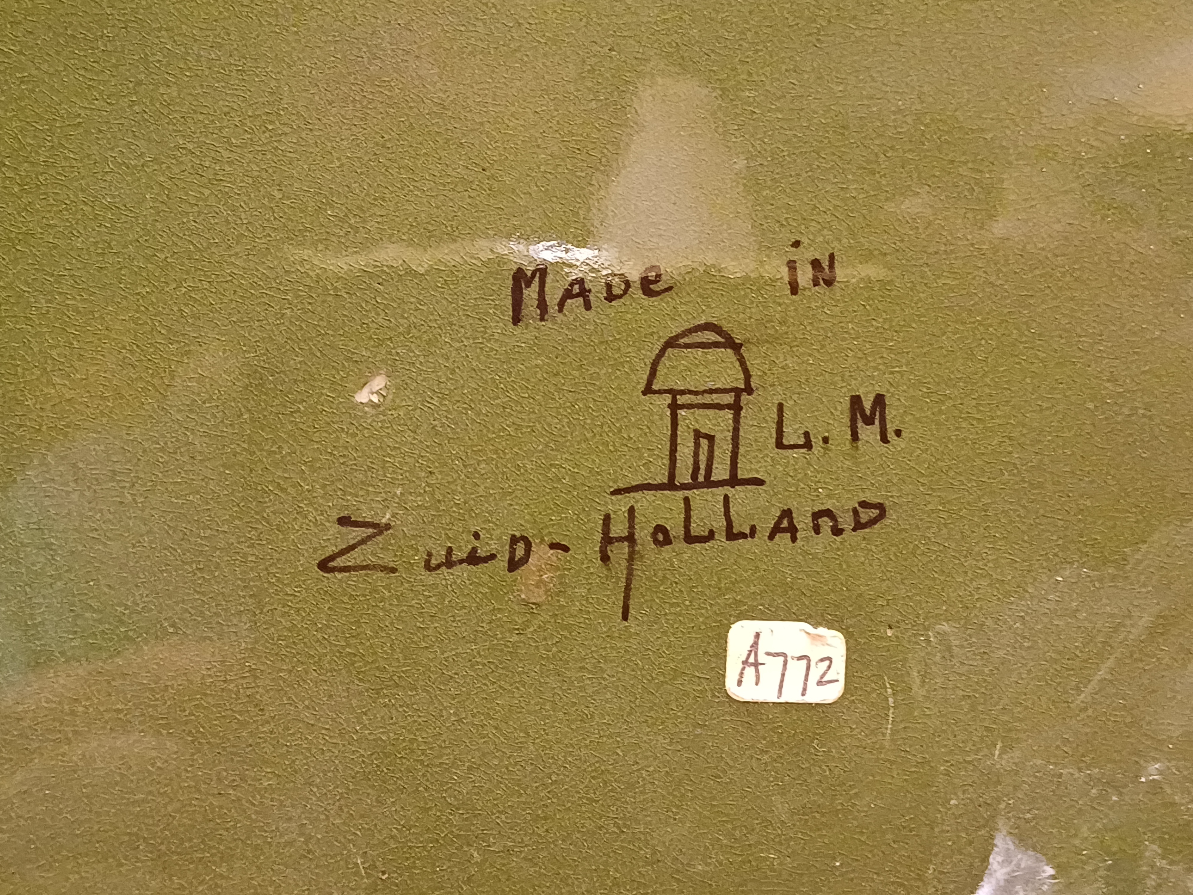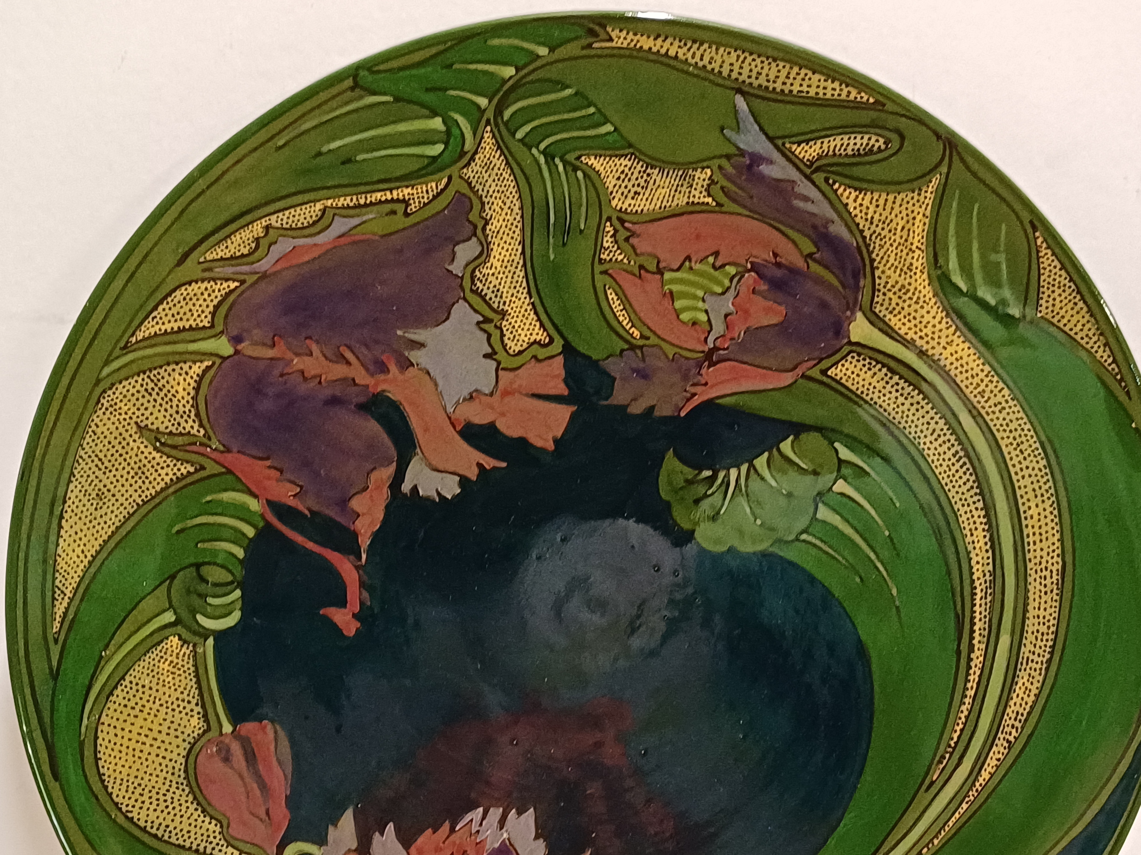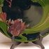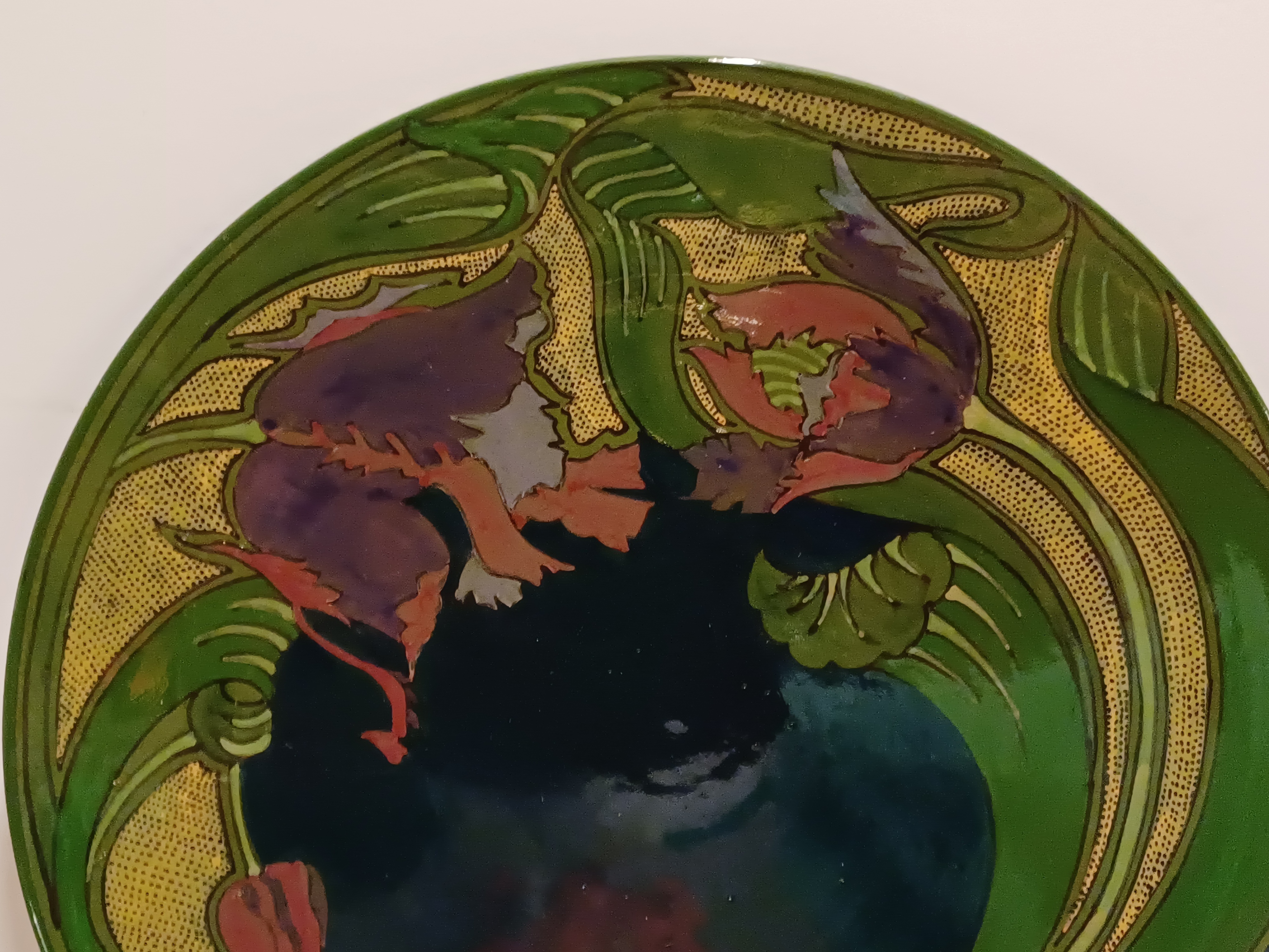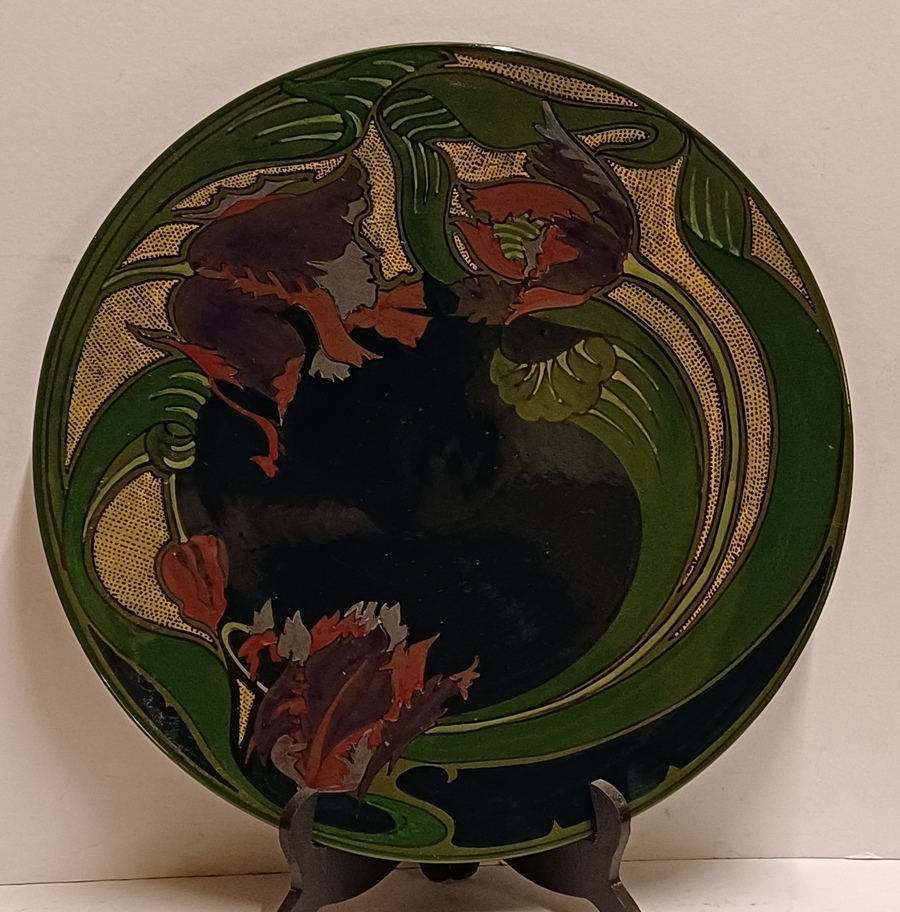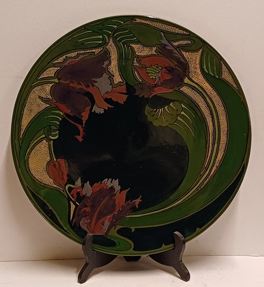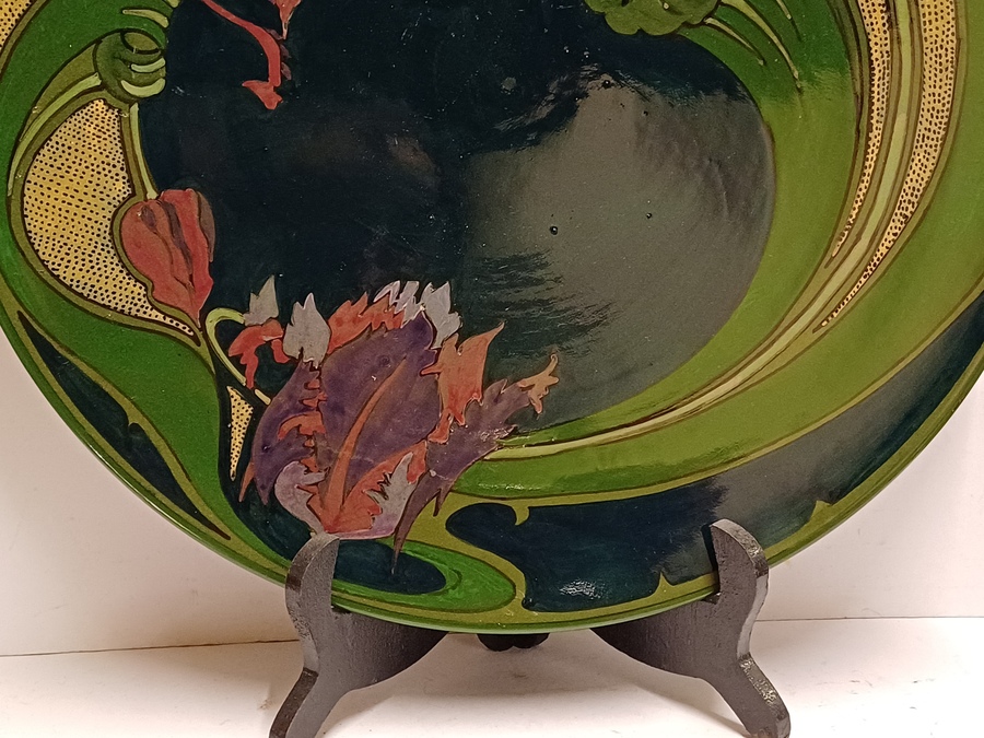 Groot glansplatelen wandbord met gestileerd floraal decor op donker fond. Achterzijde met fabrieksmerk. Vroege productie