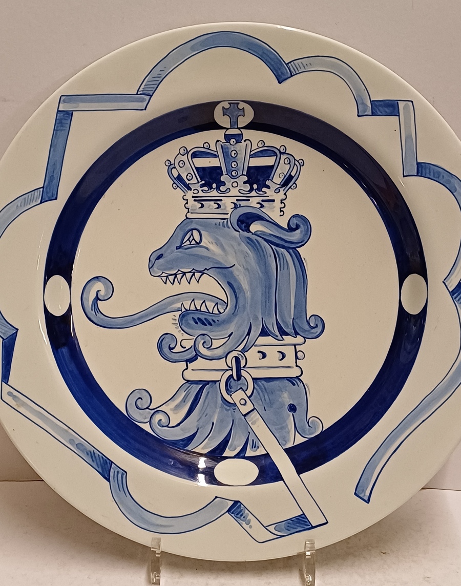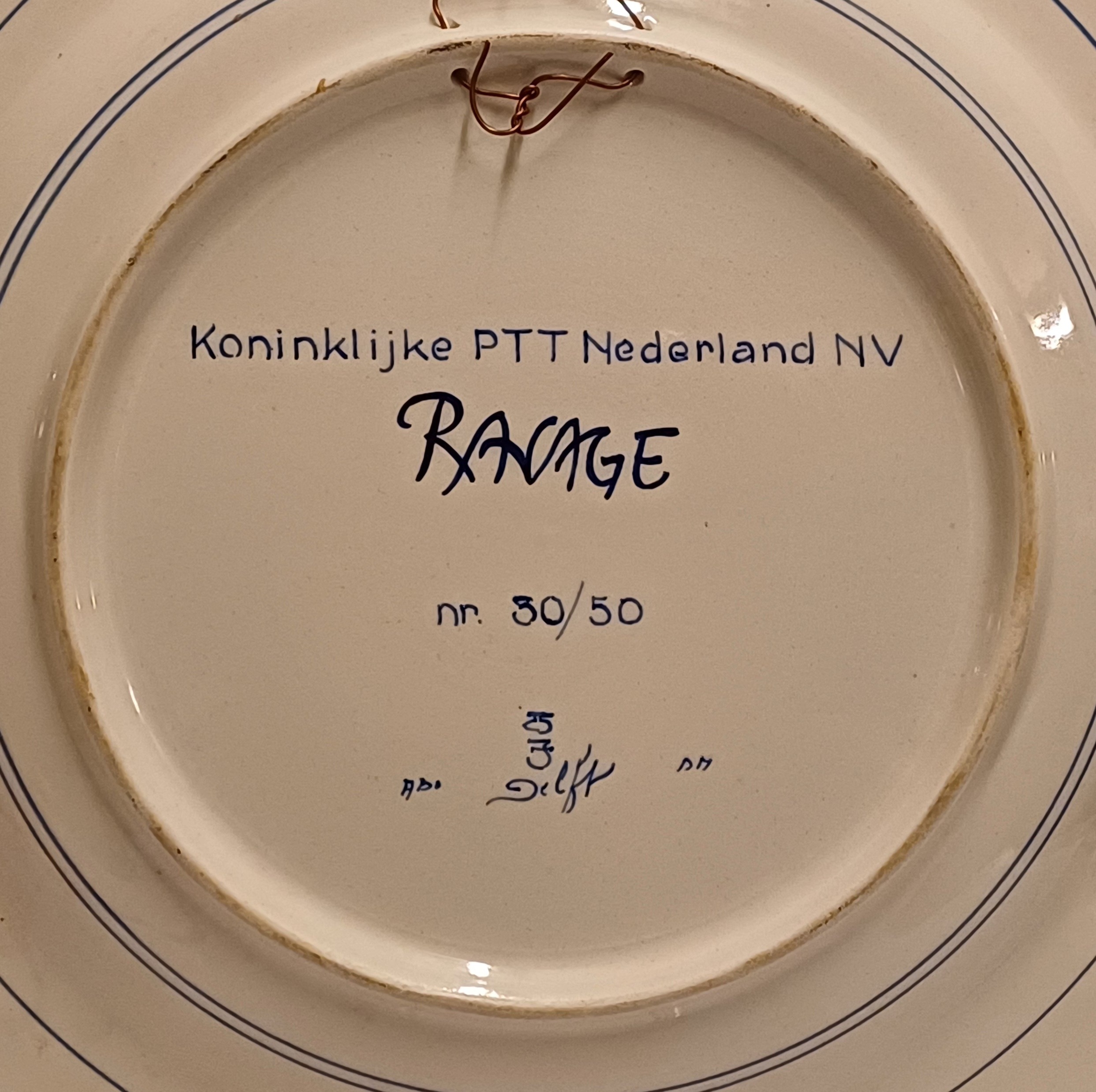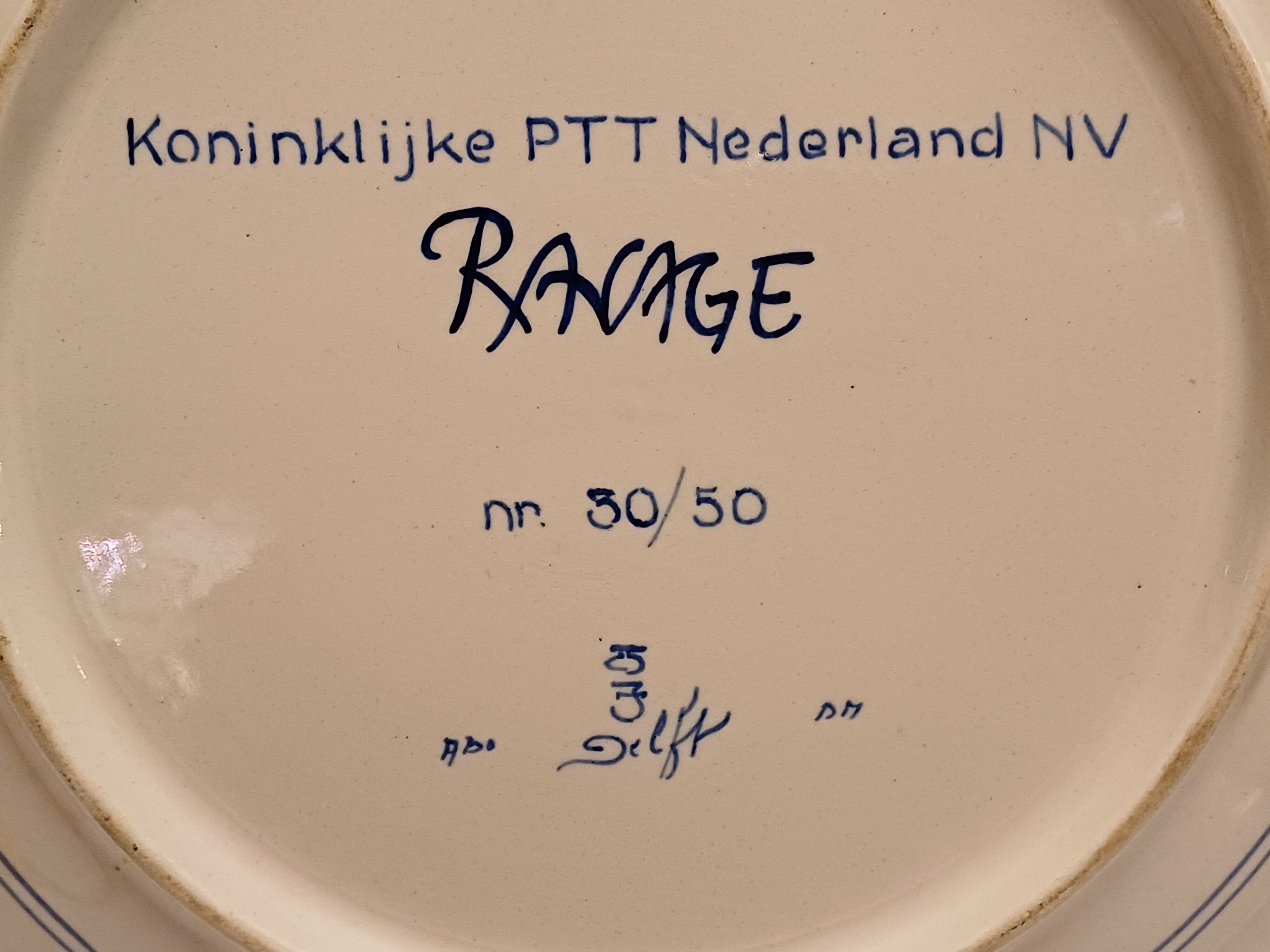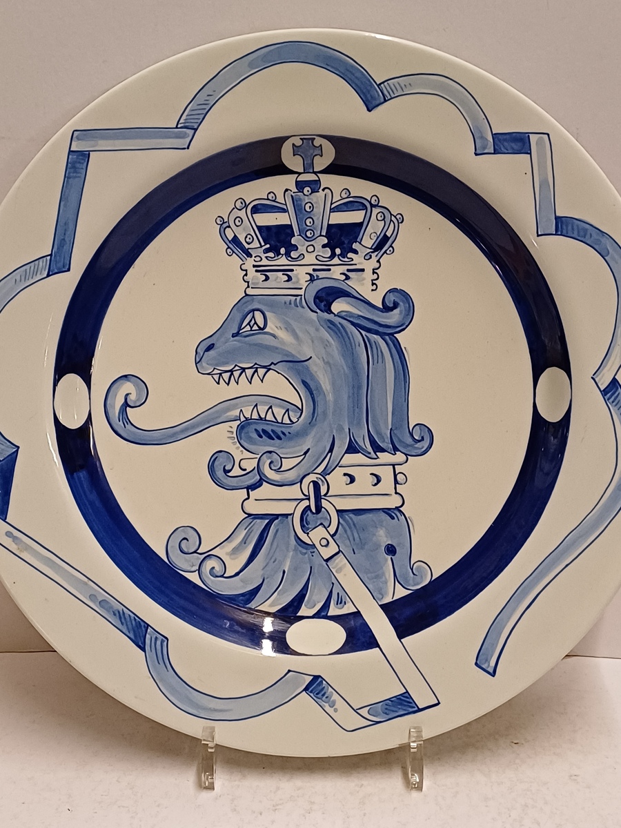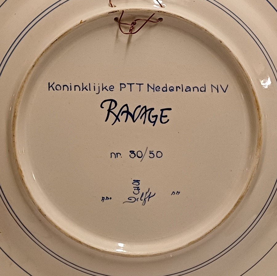 Delfts blauw gedecoreerd bord met afbeelding van een gekroonde leeuw. Ontworpen voor de PTT in een oplage van 50 stuks. Ontwerp Ravage ( is een Nederlands ontwerpersduo. Opgericht in 1972 door Arnold van Geuns en Clemens Rameckers )