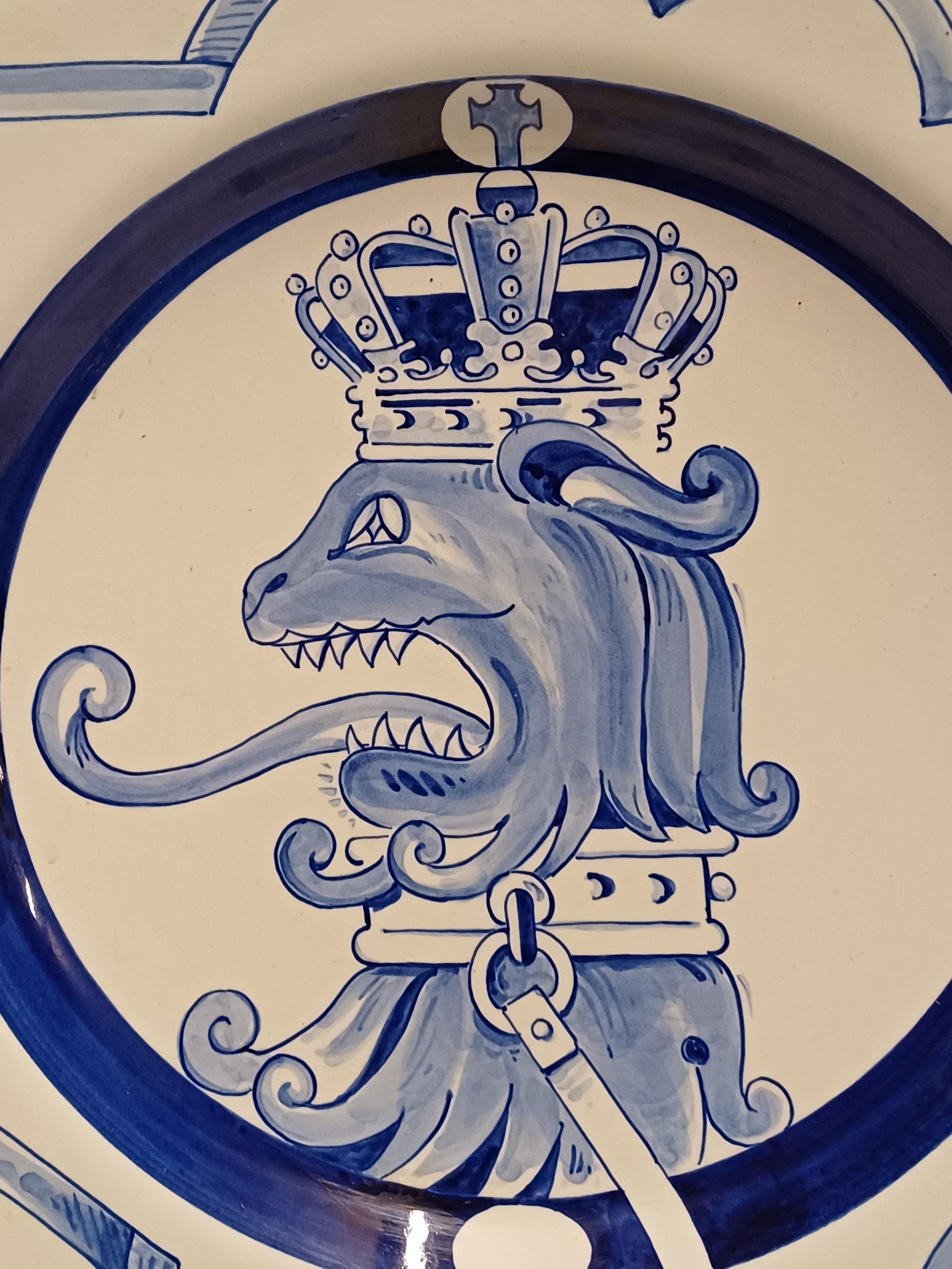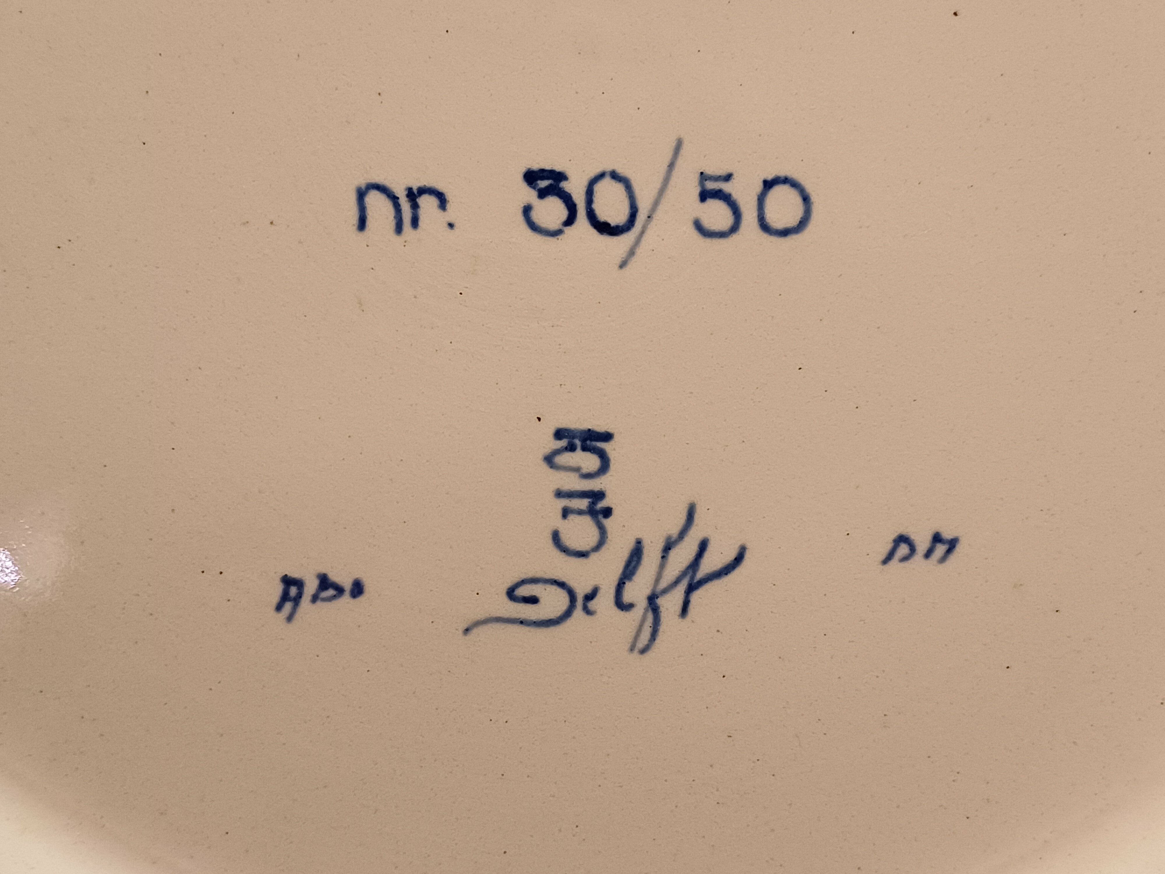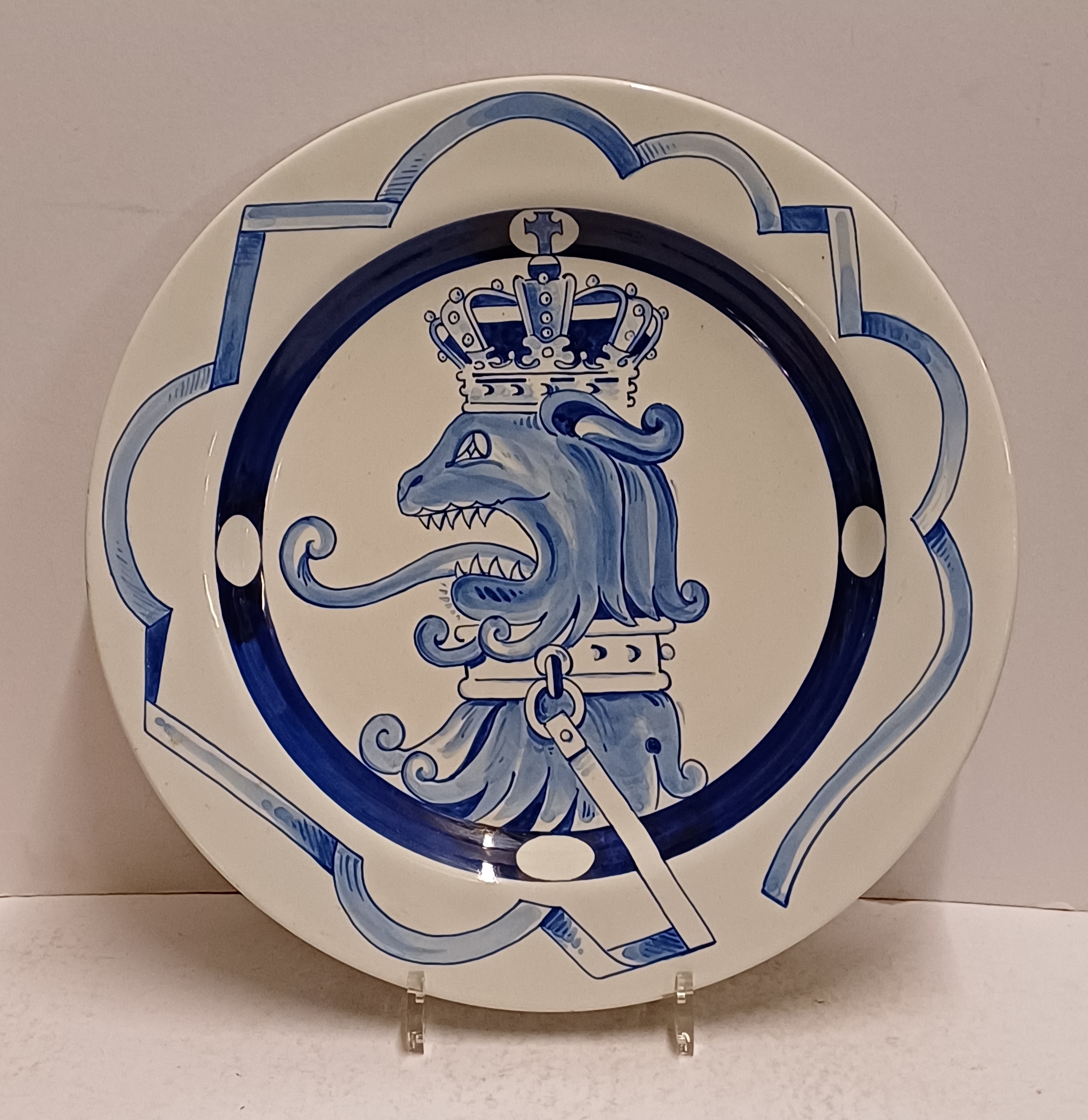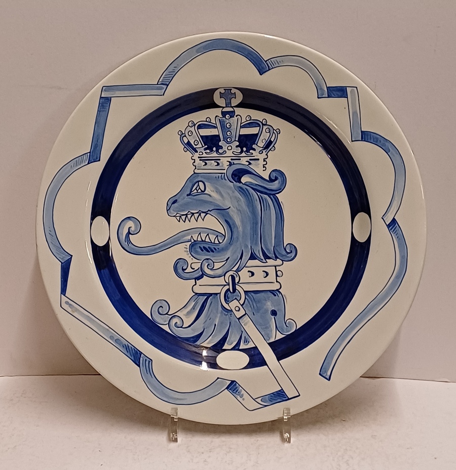 Delfts blauw gedecoreerd bord met afbeelding van een gekroonde leeuw. Ontworpen voor de PTT in een oplage van 50 stuks. Ontwerp Ravage ( is een Nederlands ontwerpersduo. Opgericht in 1972 door Arnold van Geuns en Clemens Rameckers )