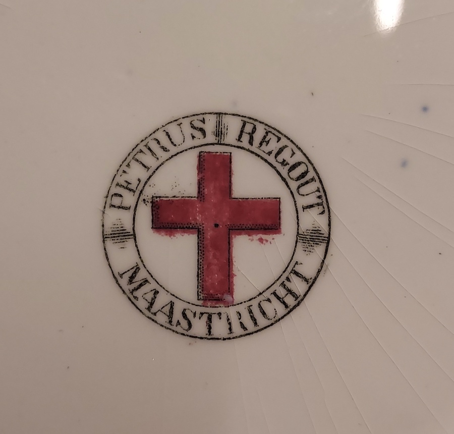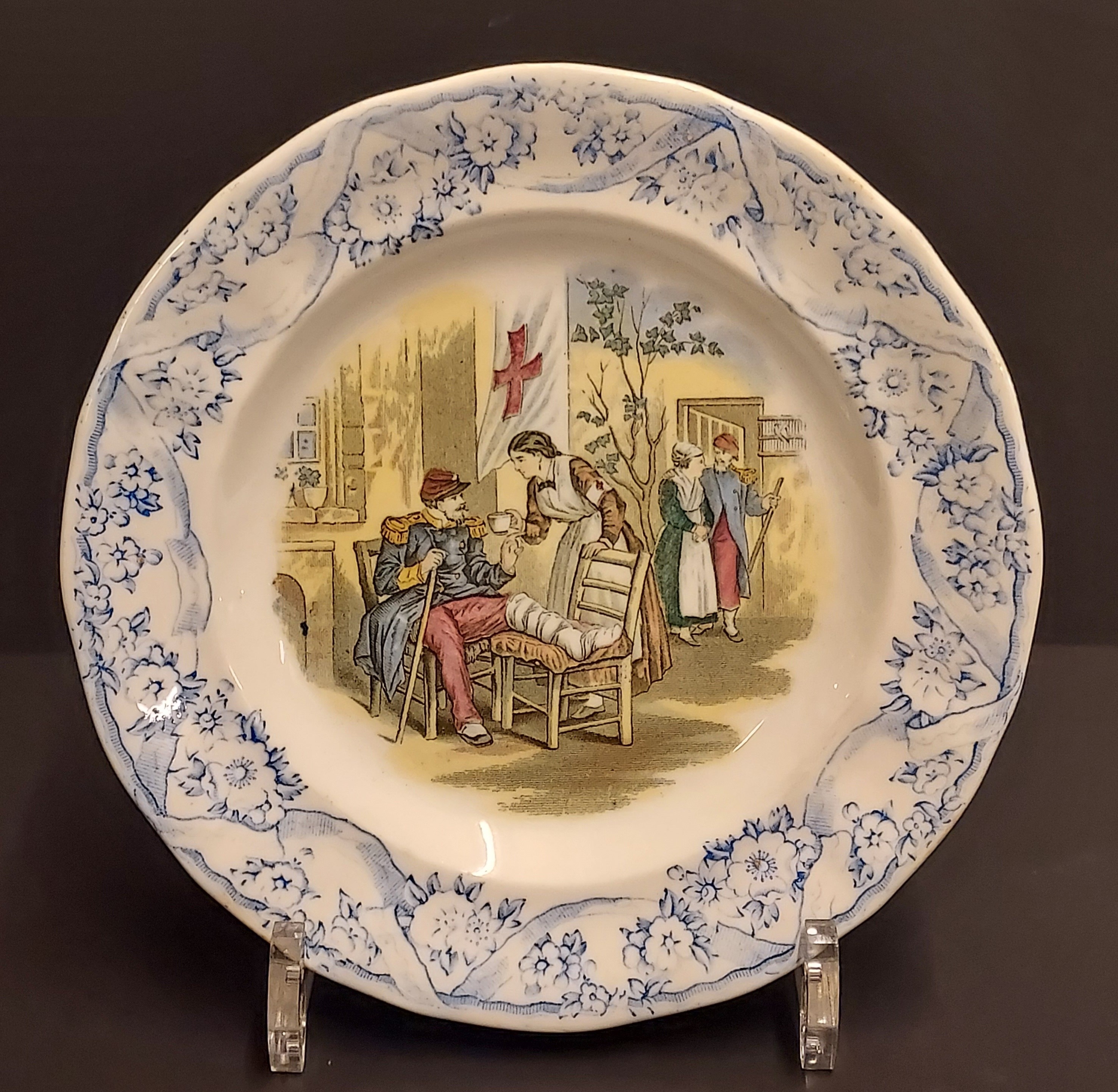 Decor depicting the care of a wounded soldier on the flat surface, the rim with a blue monochrome decor. The reverse side features a specially designed Red Cross mark, execution 1871.