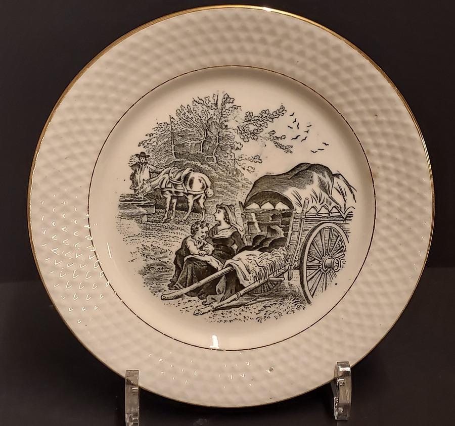 Monochrome black decor of a couple in love by a farmer's cart. Reverse side with factory mark and peat dating.