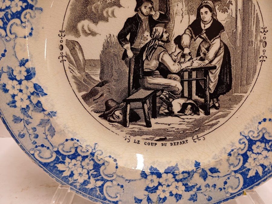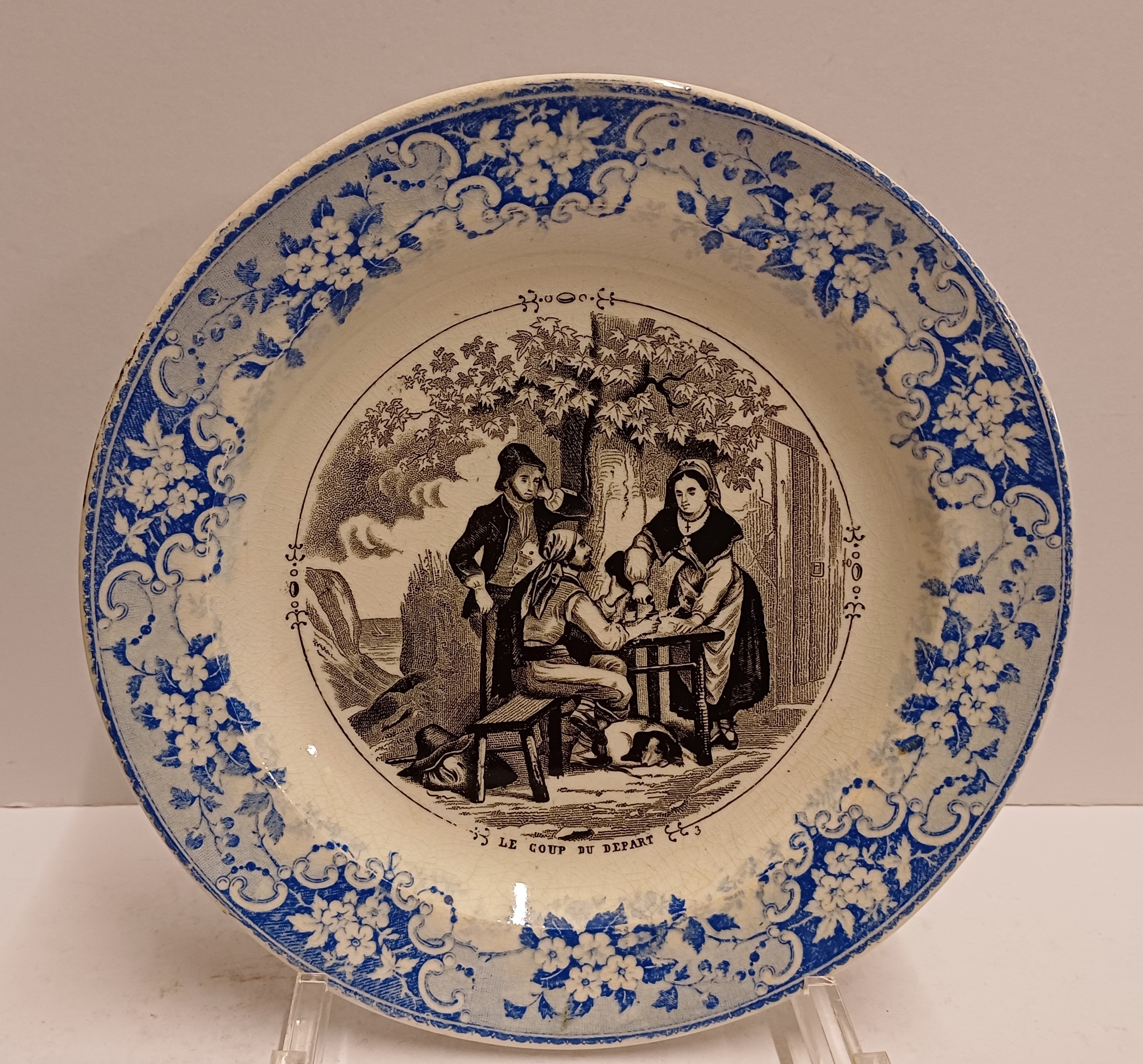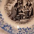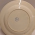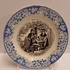 Black transfer decor on the base with a blue floral decorated rim. Reverse side with factory mark.