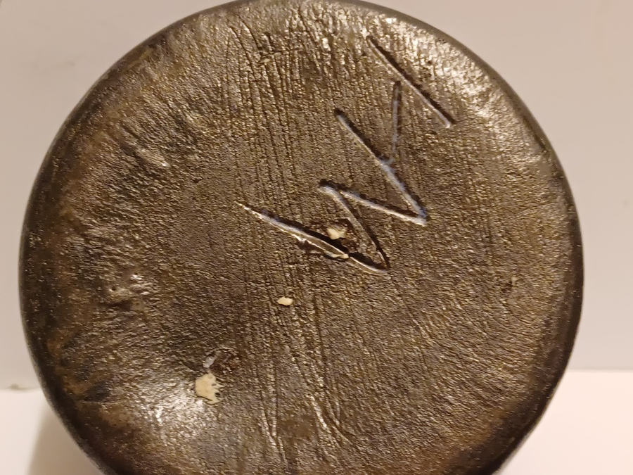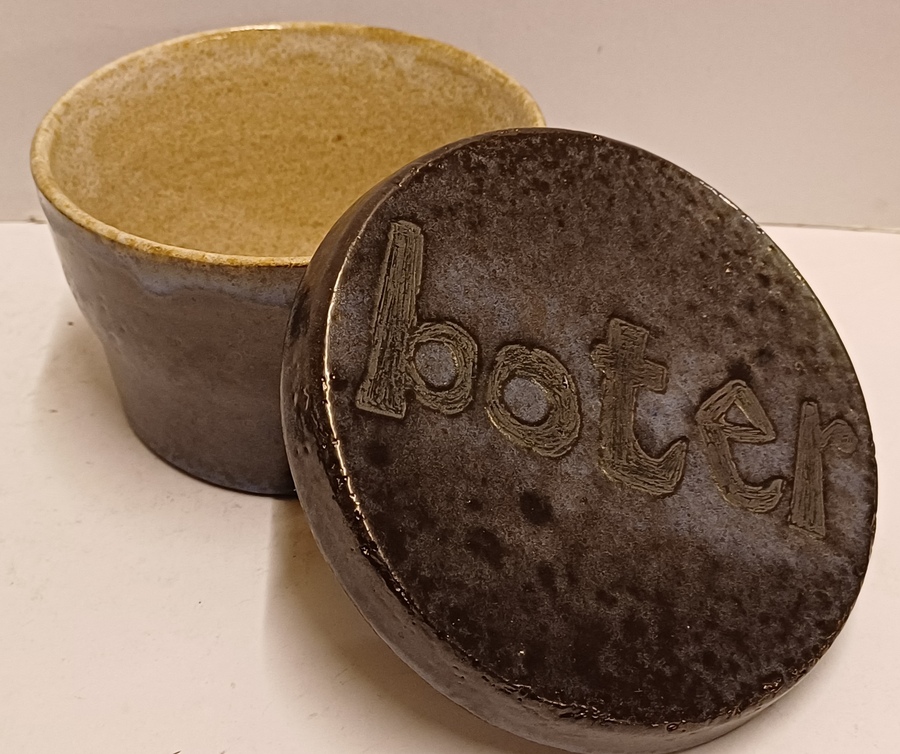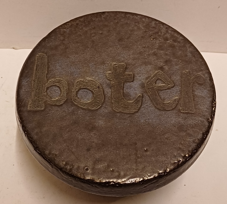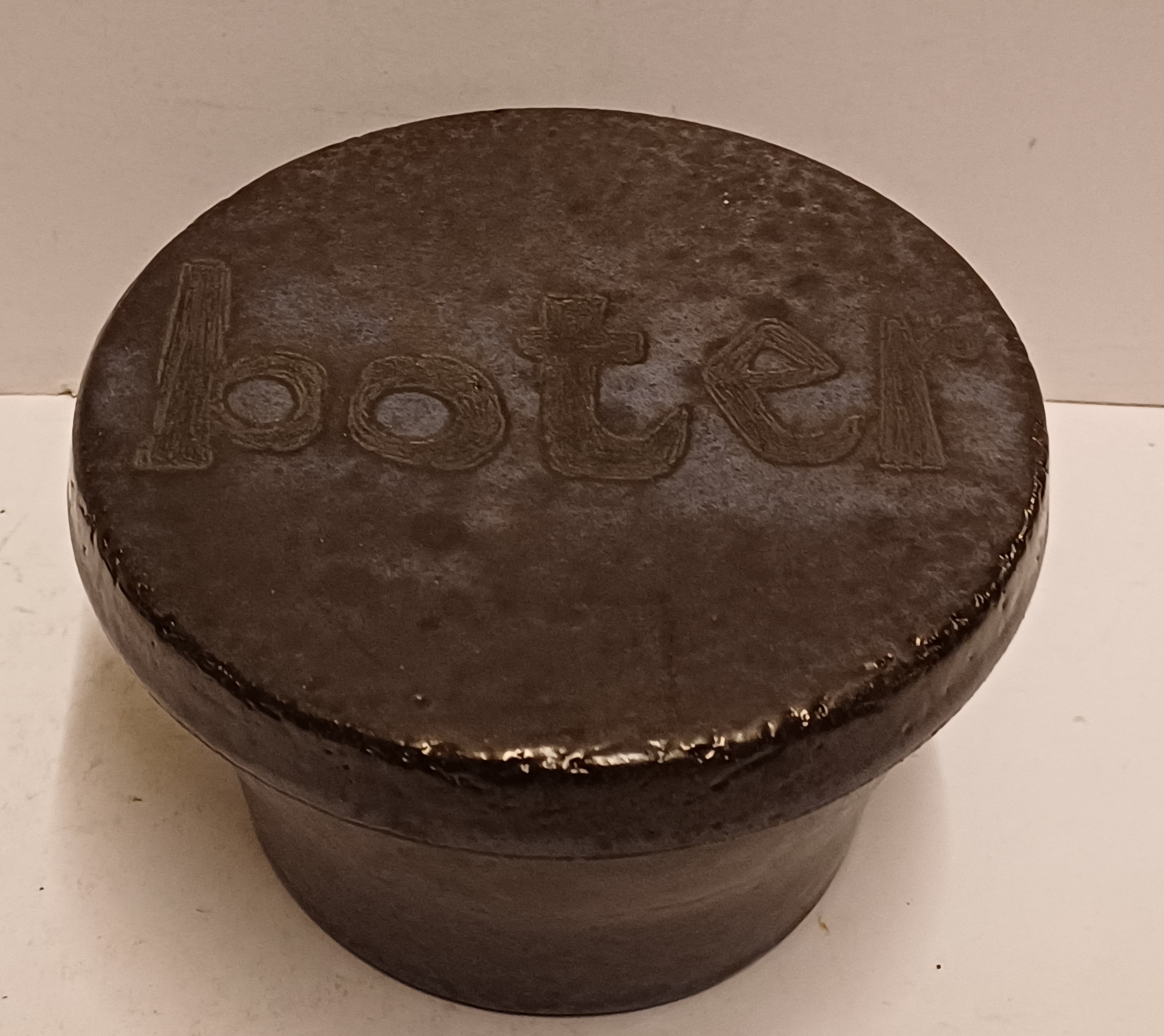 Earthenware round lidded box with the word "Boter" on the lid. Bottom with monogram.