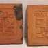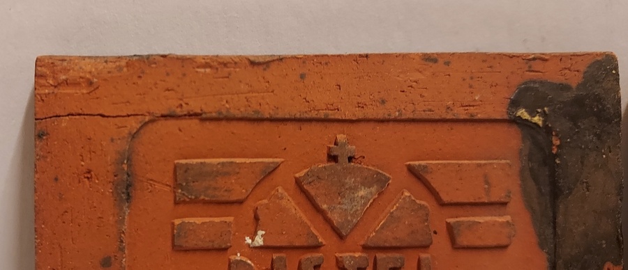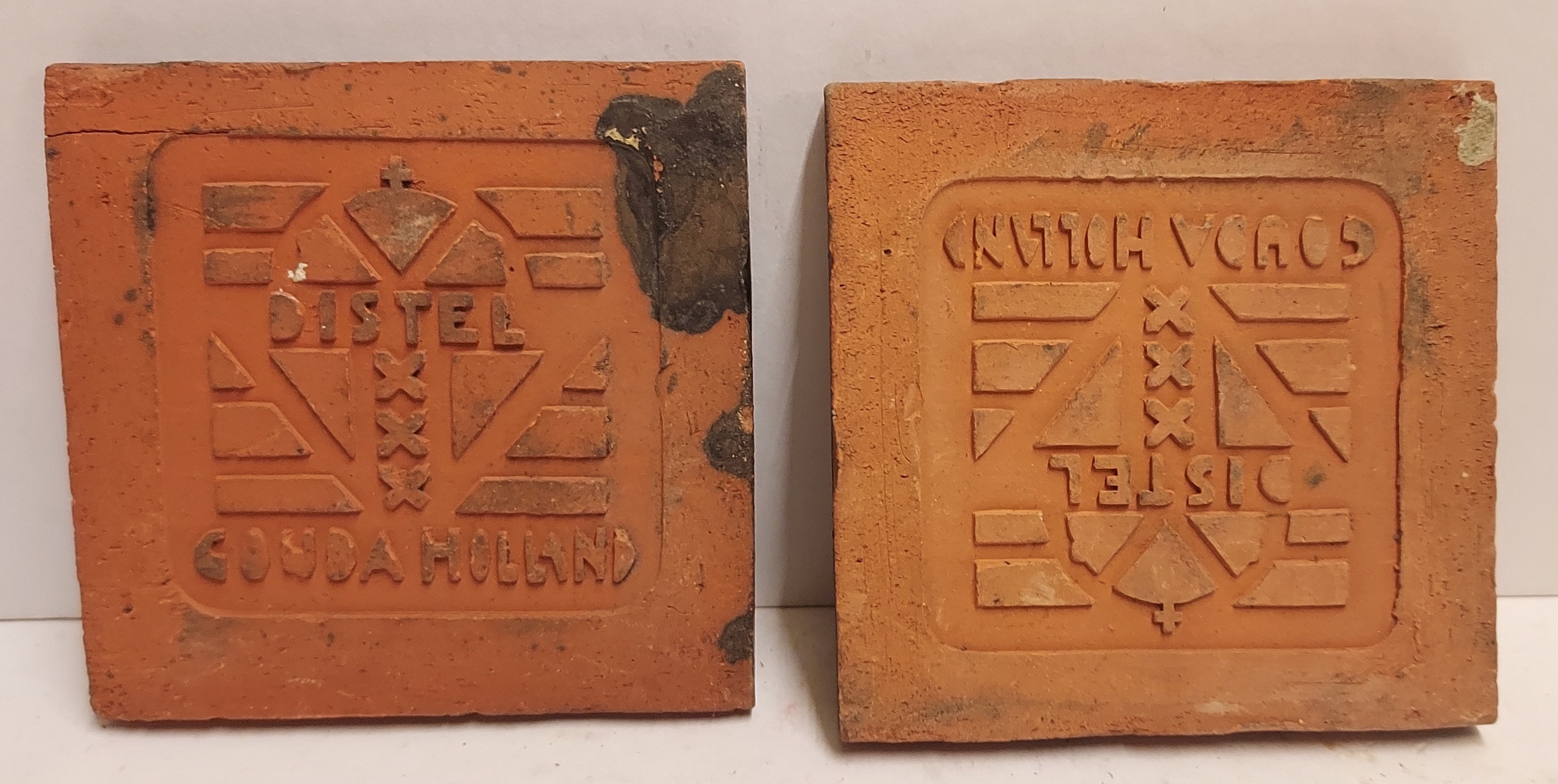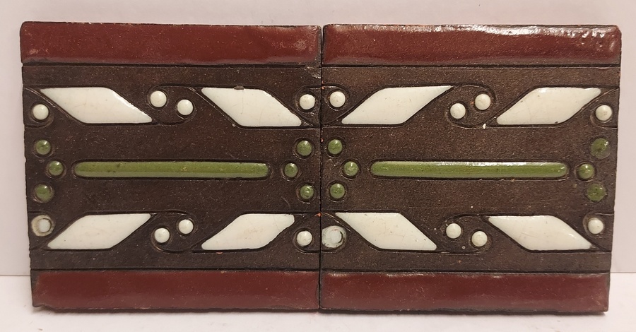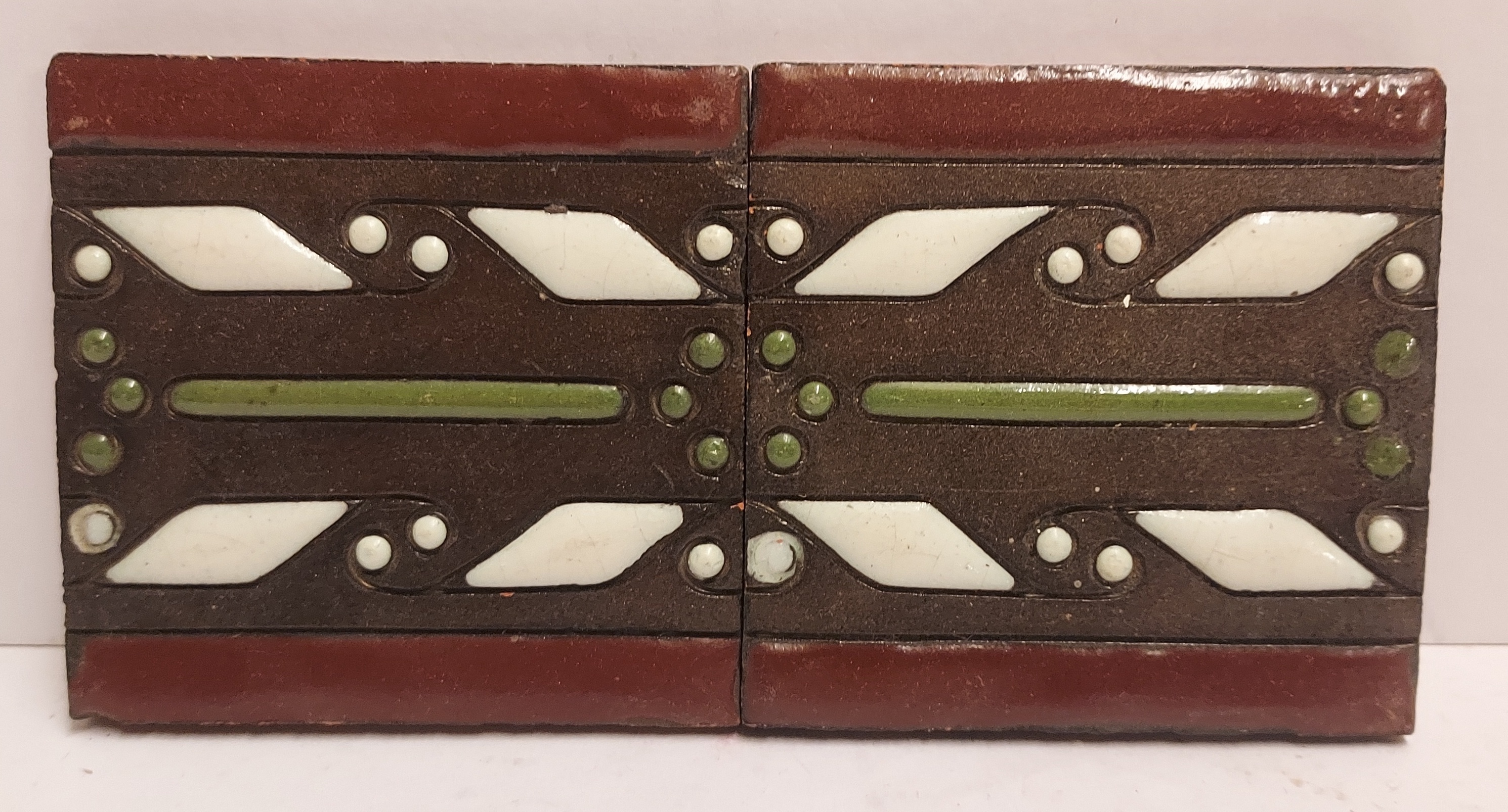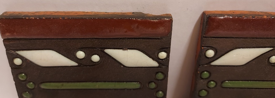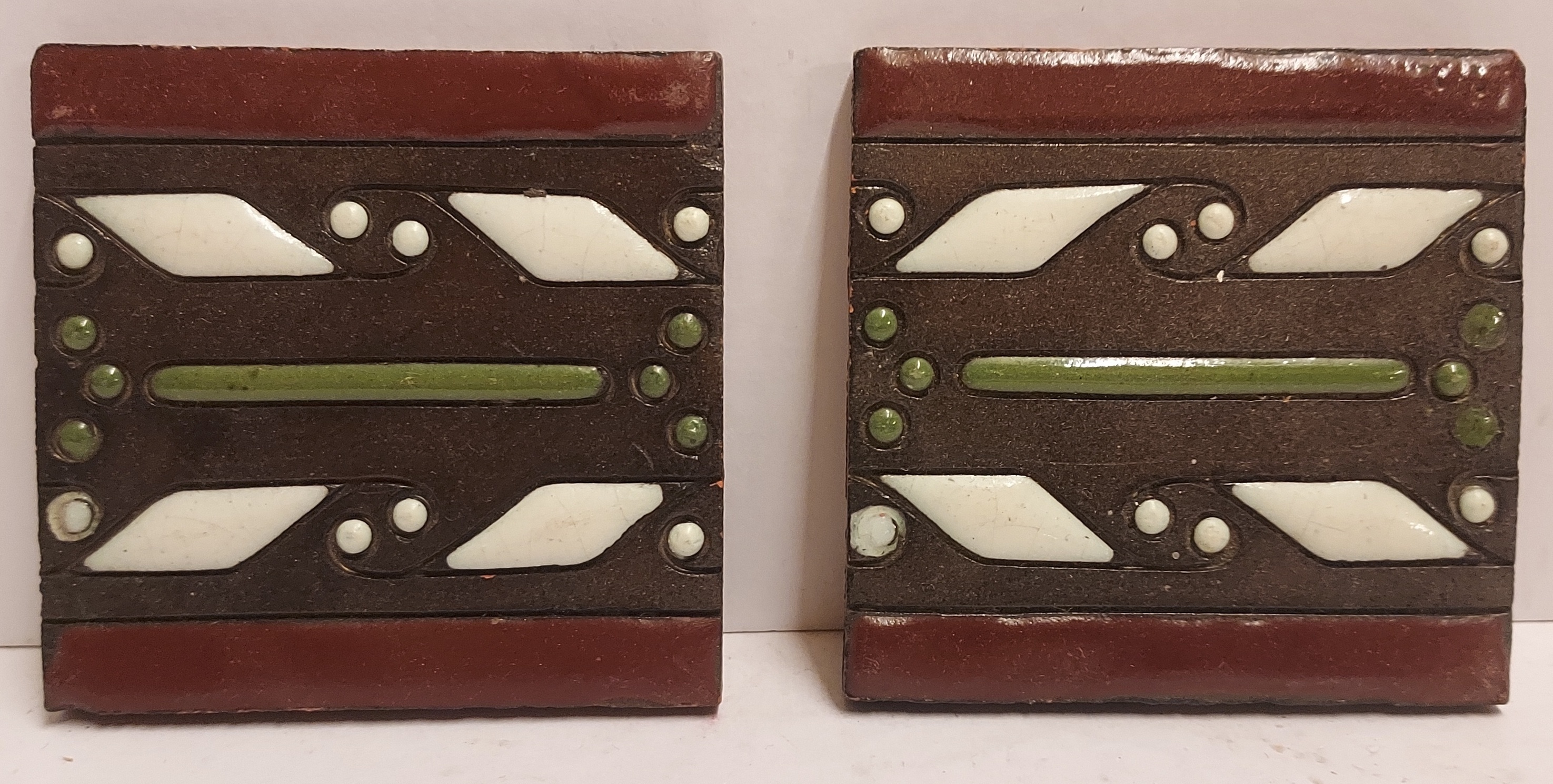 A set of Carduus tiles with green and white decor on a brown background. Reverse side with pressed factory mark.