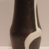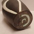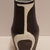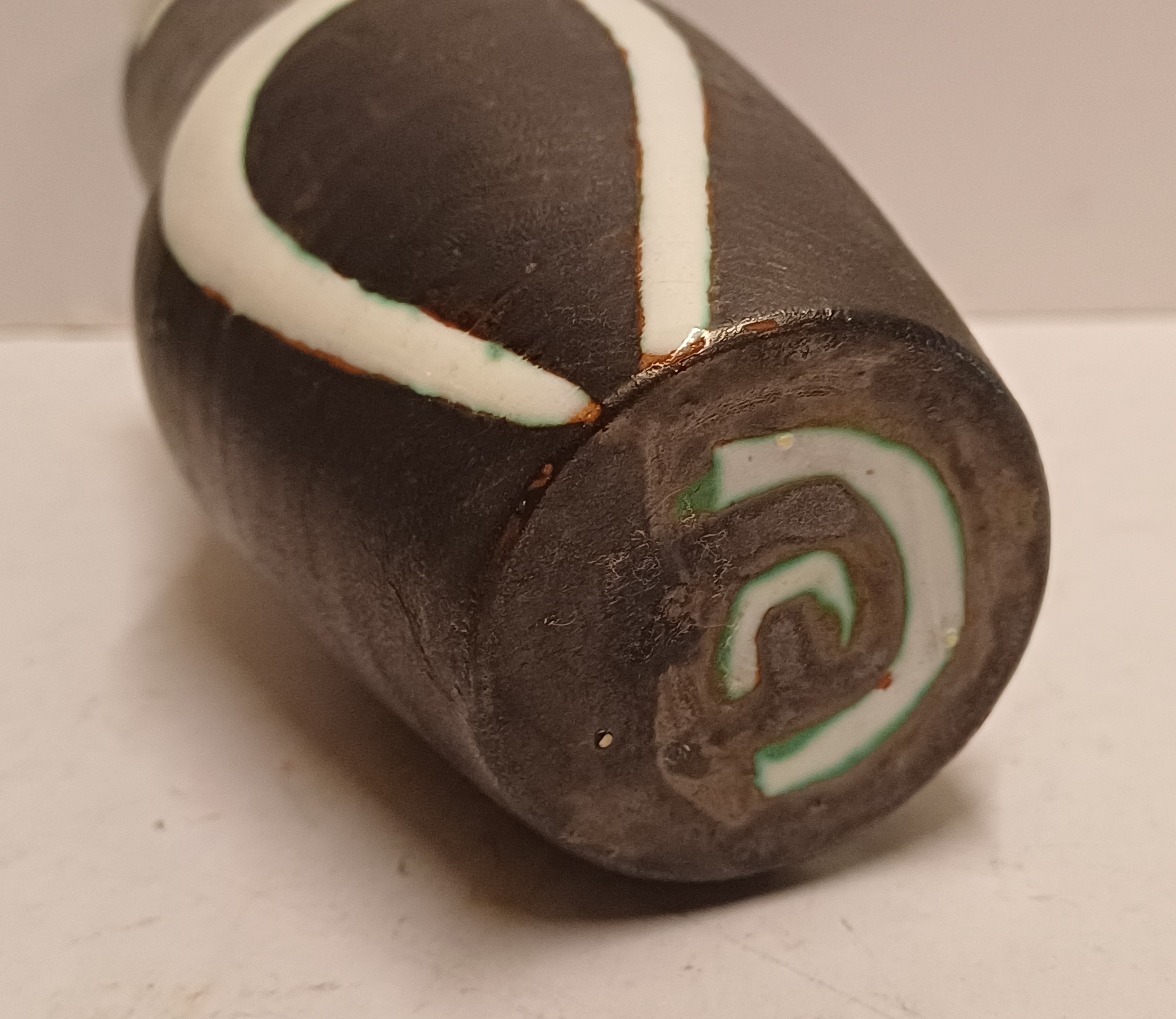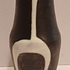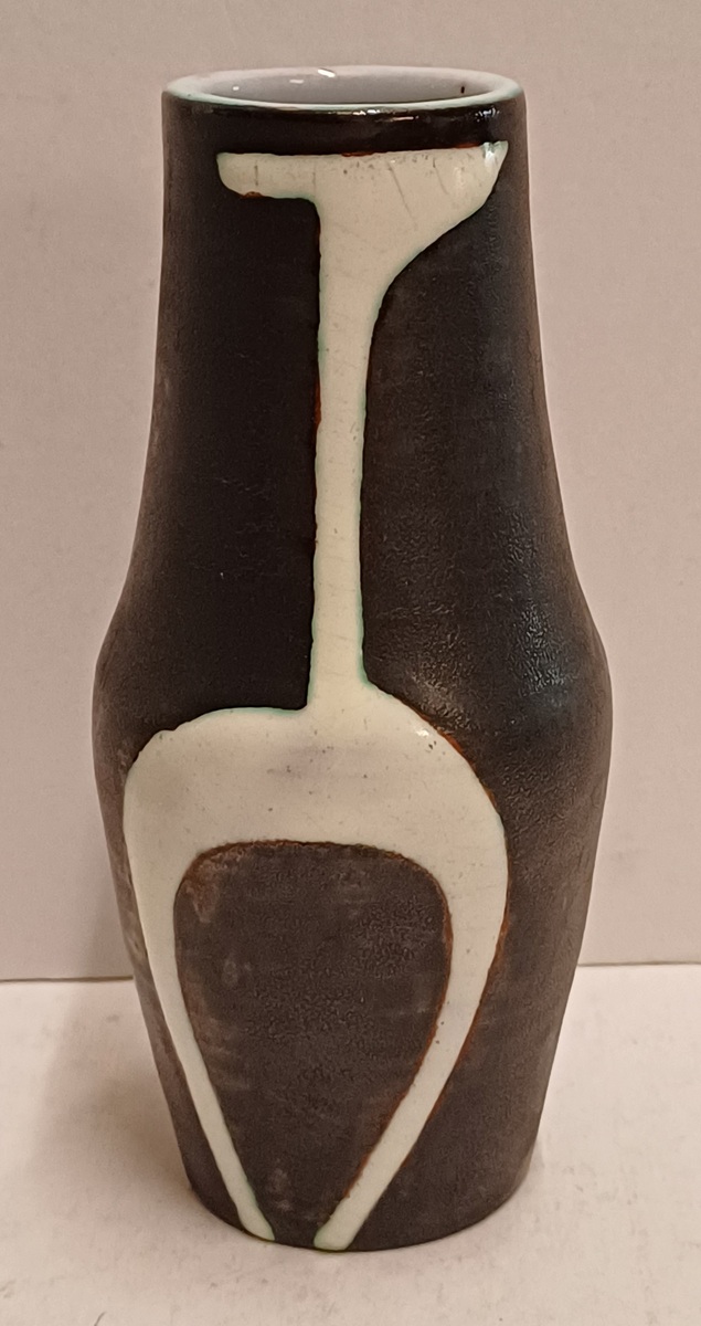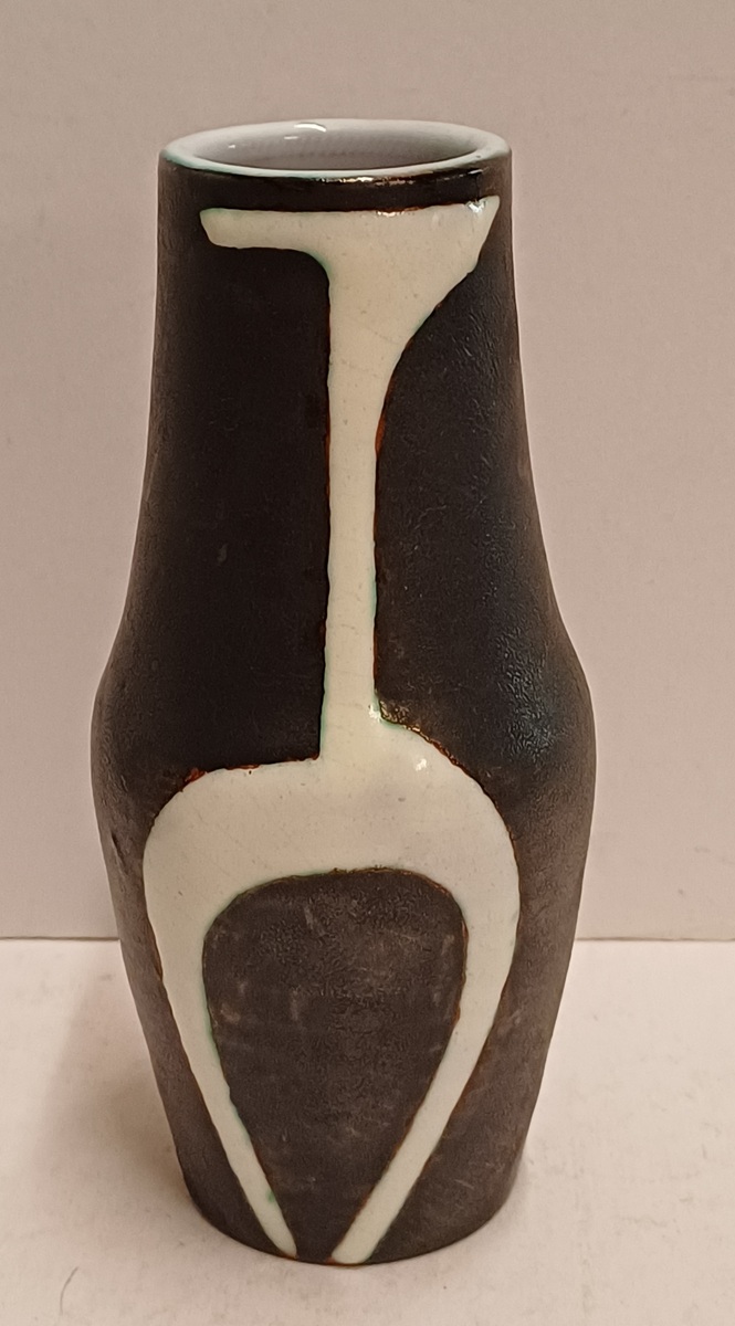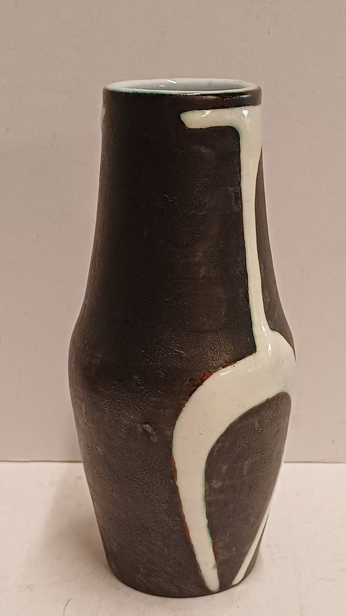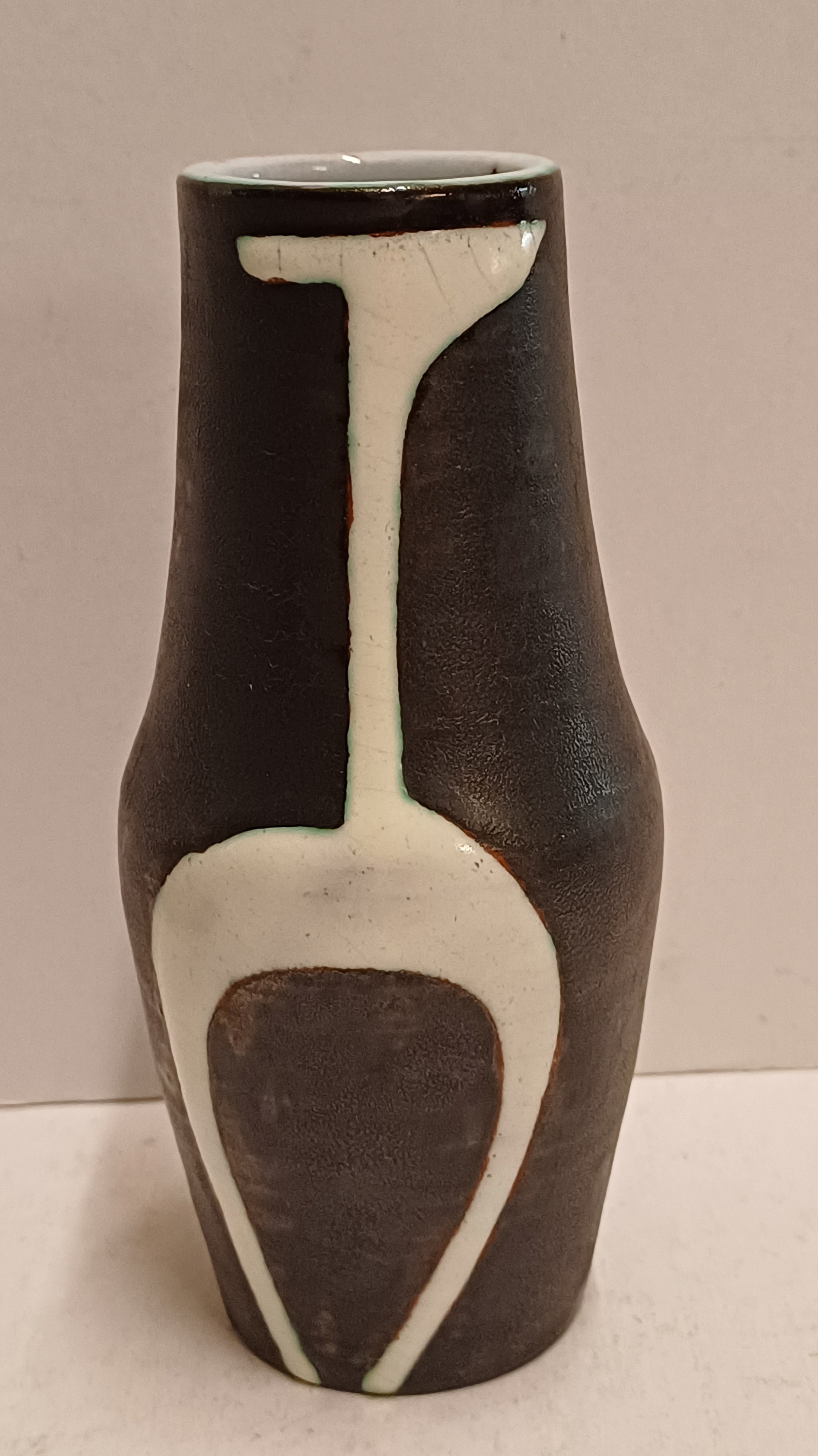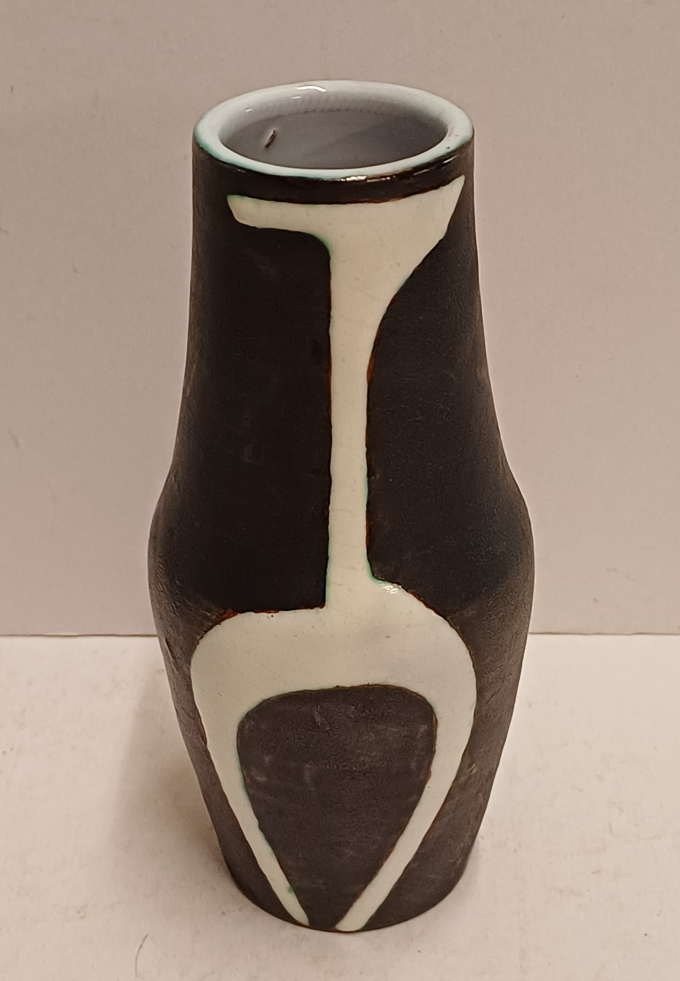 Terracotta vase with black engobe and white glazed decoration of a stylized figure. Bottom marked with CU brand in green, designed by Jan Schuurkes.