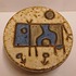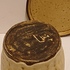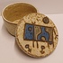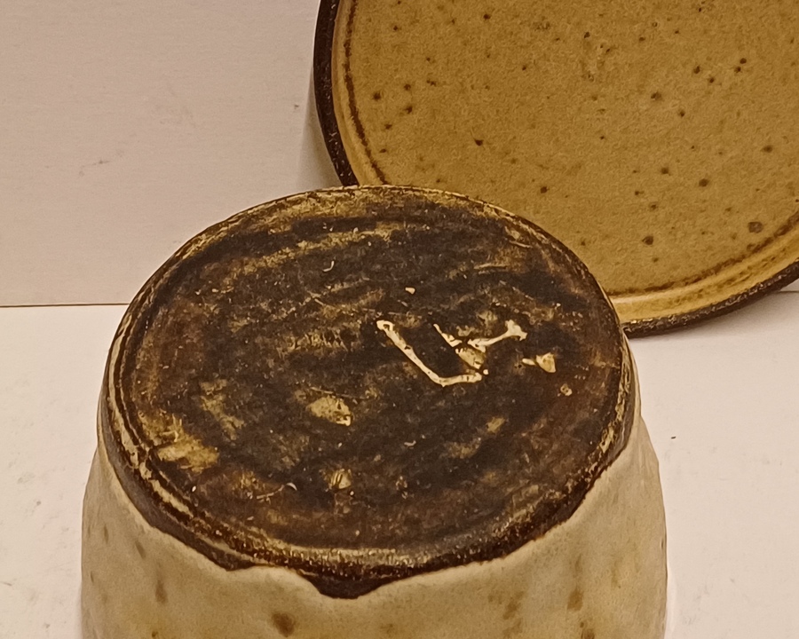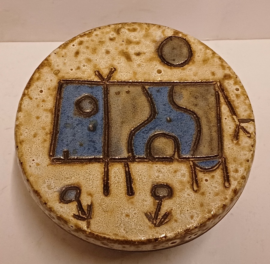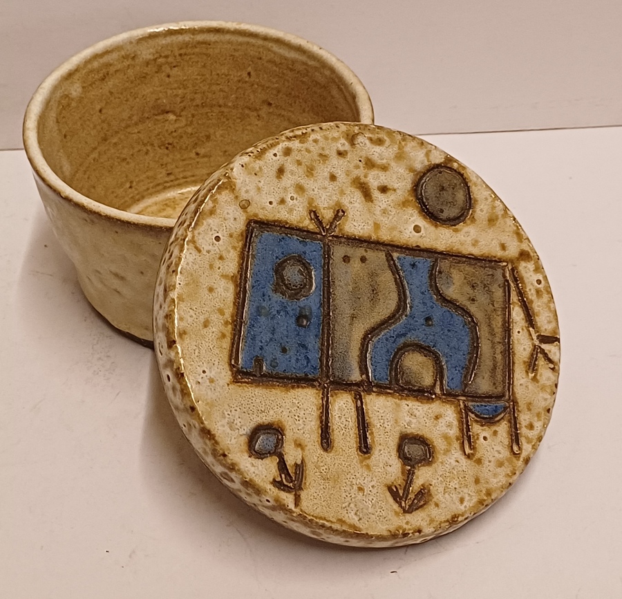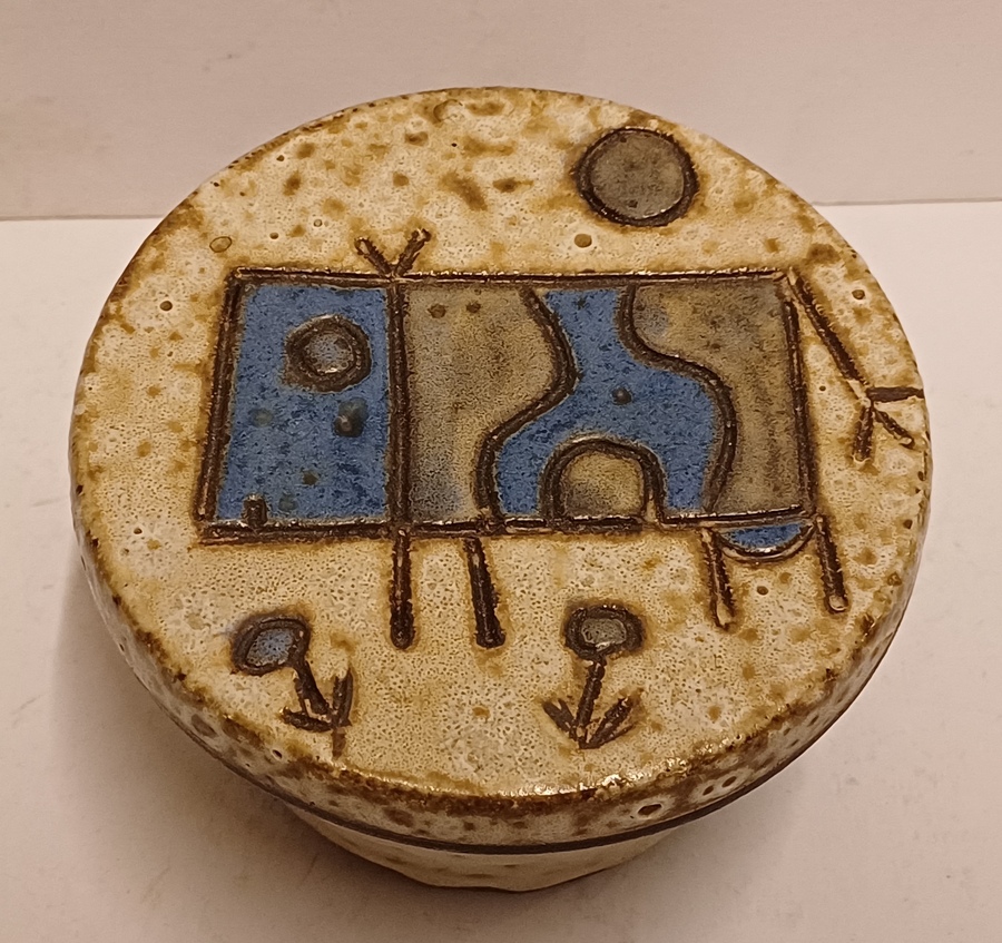 Earthenware round lidded box with an abstracted cow decoration on the lid. Bottom with monogram.