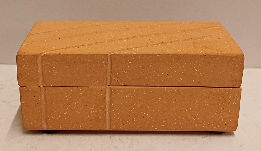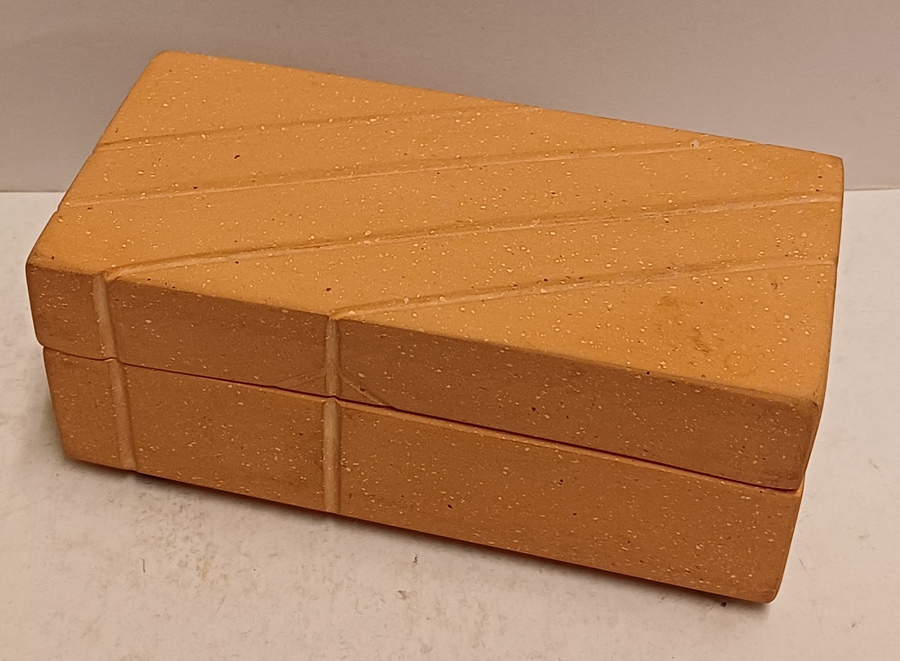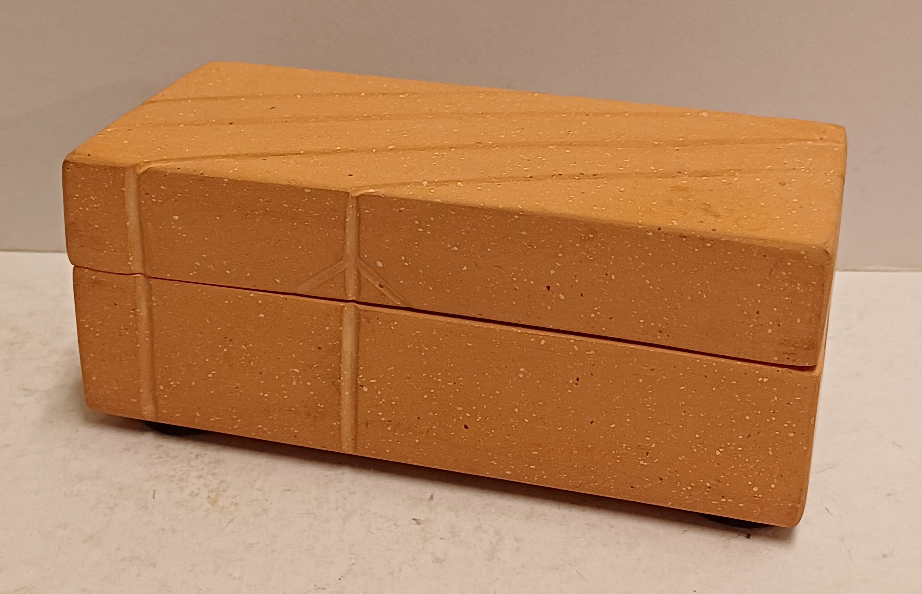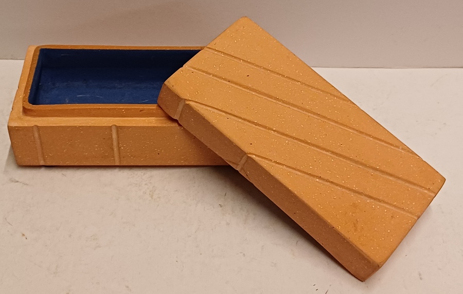 Rechthoekige aardewerken dekseldoos met lineair decor, met blauwe binnenzijde. Onderzijde gesigneerd
