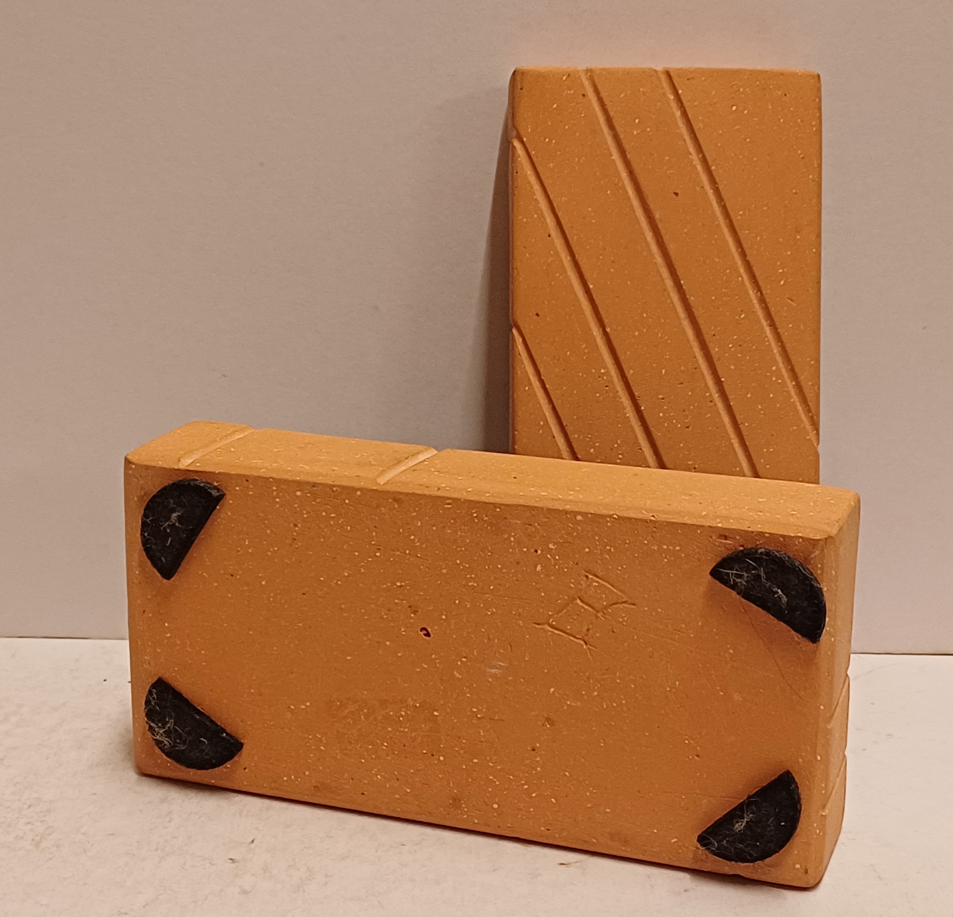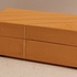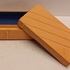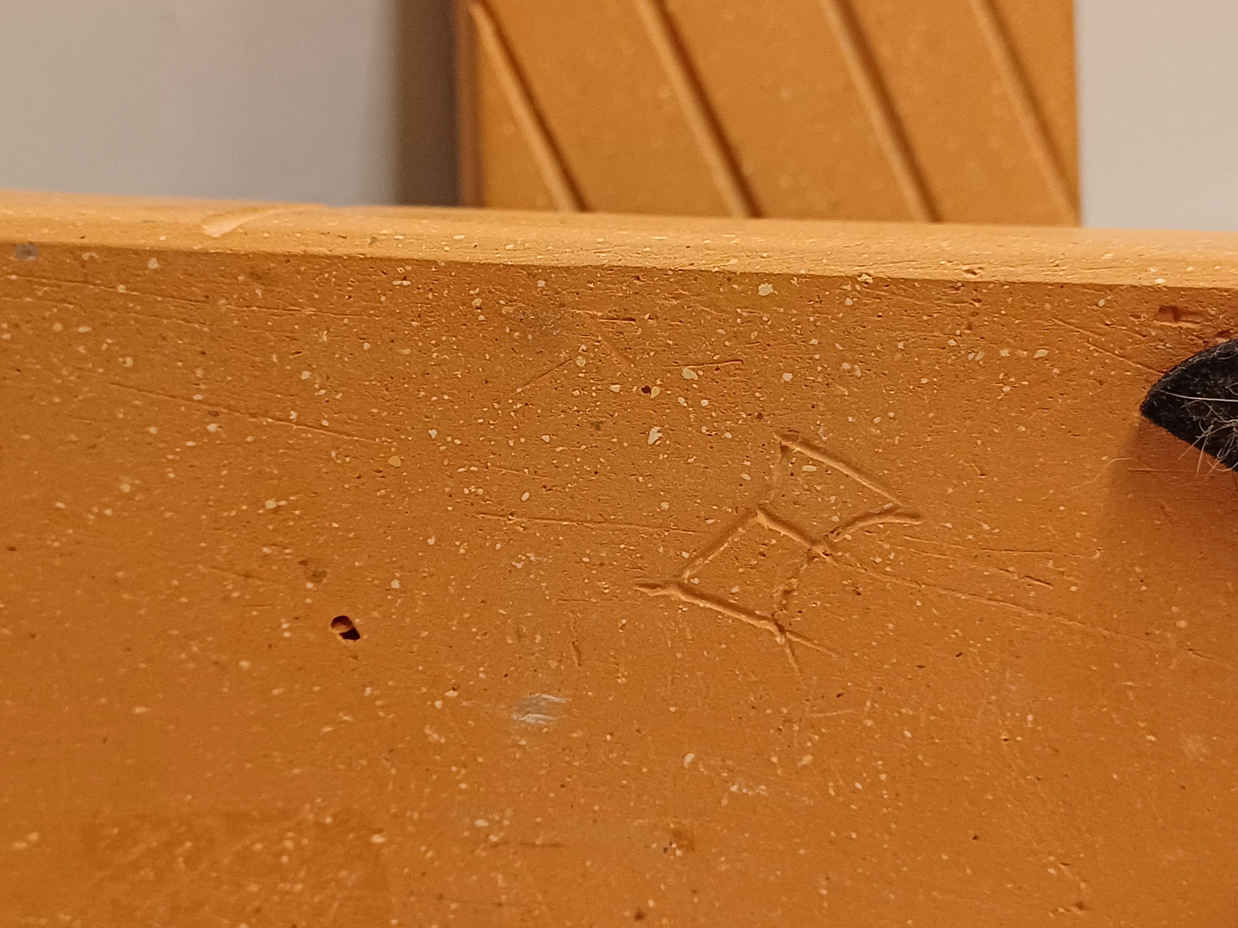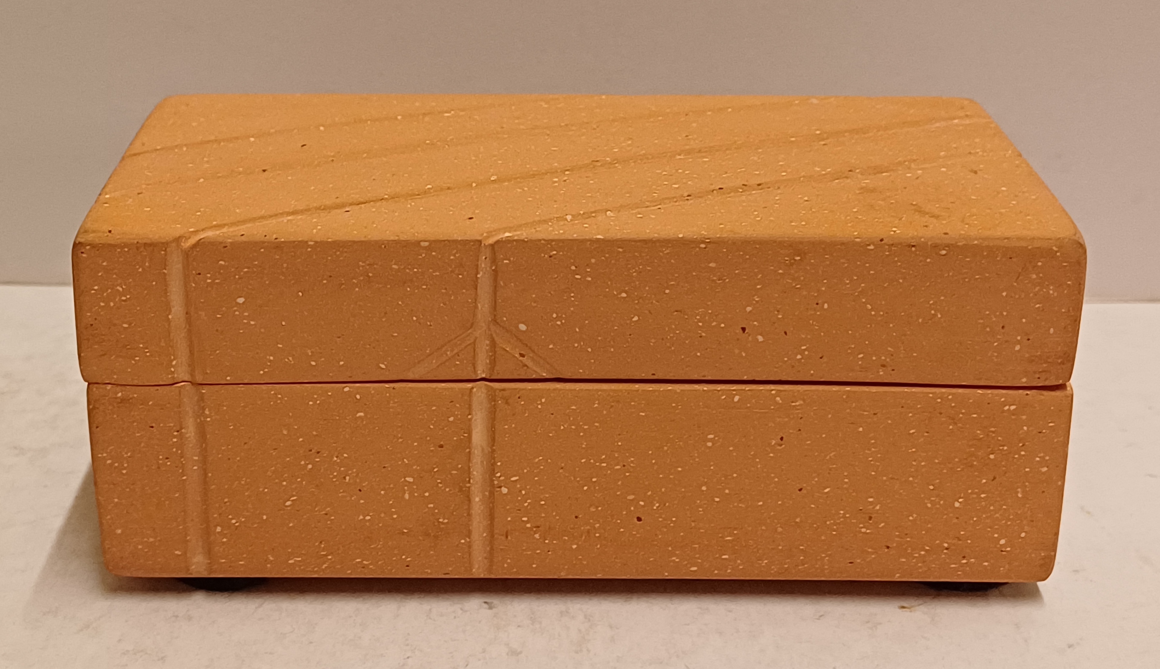 Rechthoekige aardewerken dekseldoos met lineair decor, met blauwe binnenzijde. Onderzijde gesigneerd