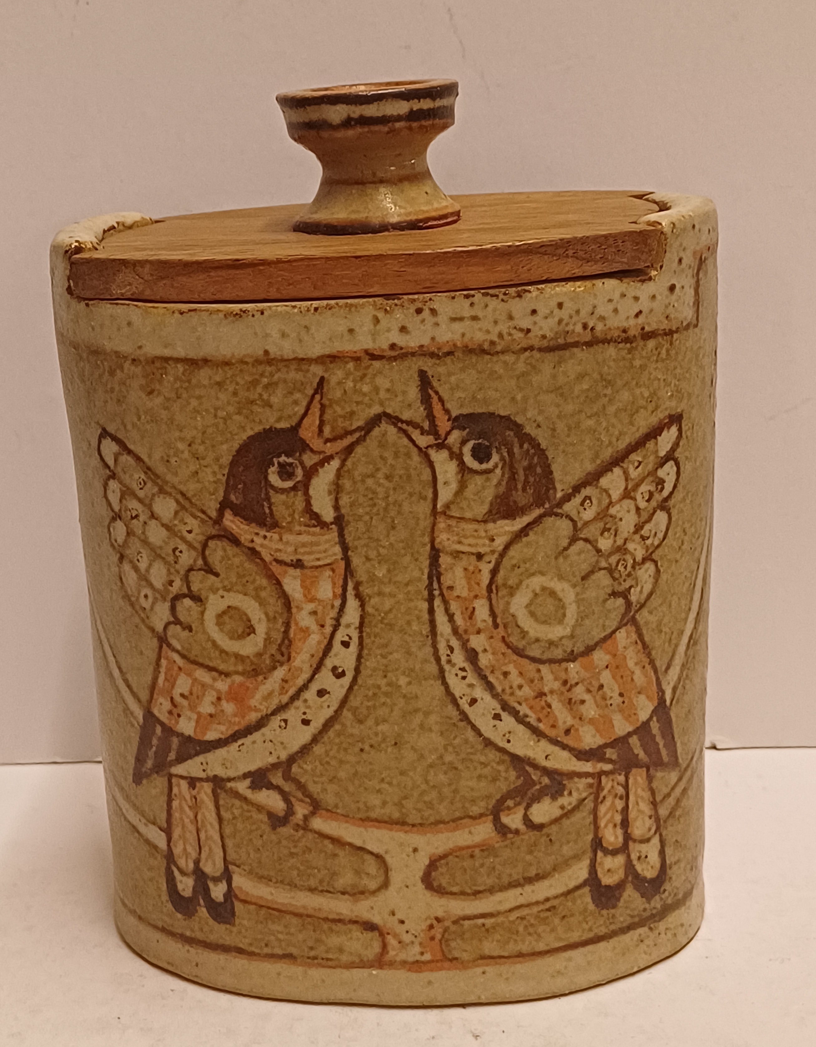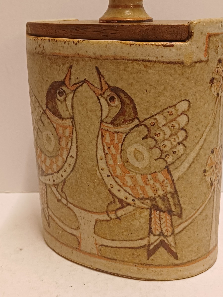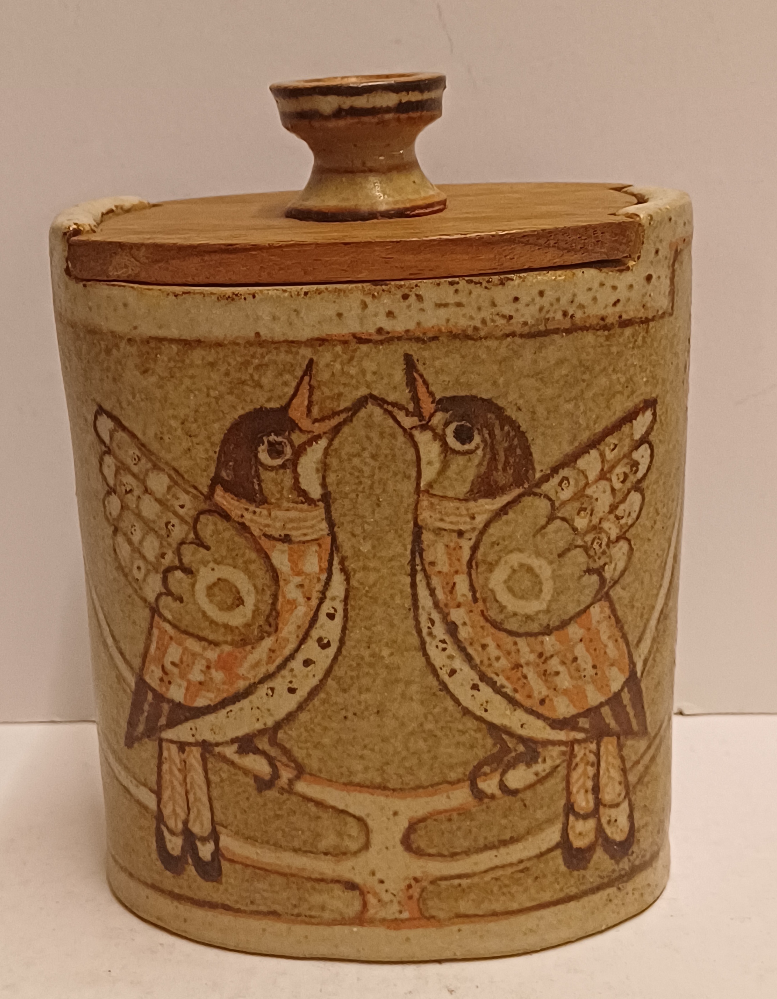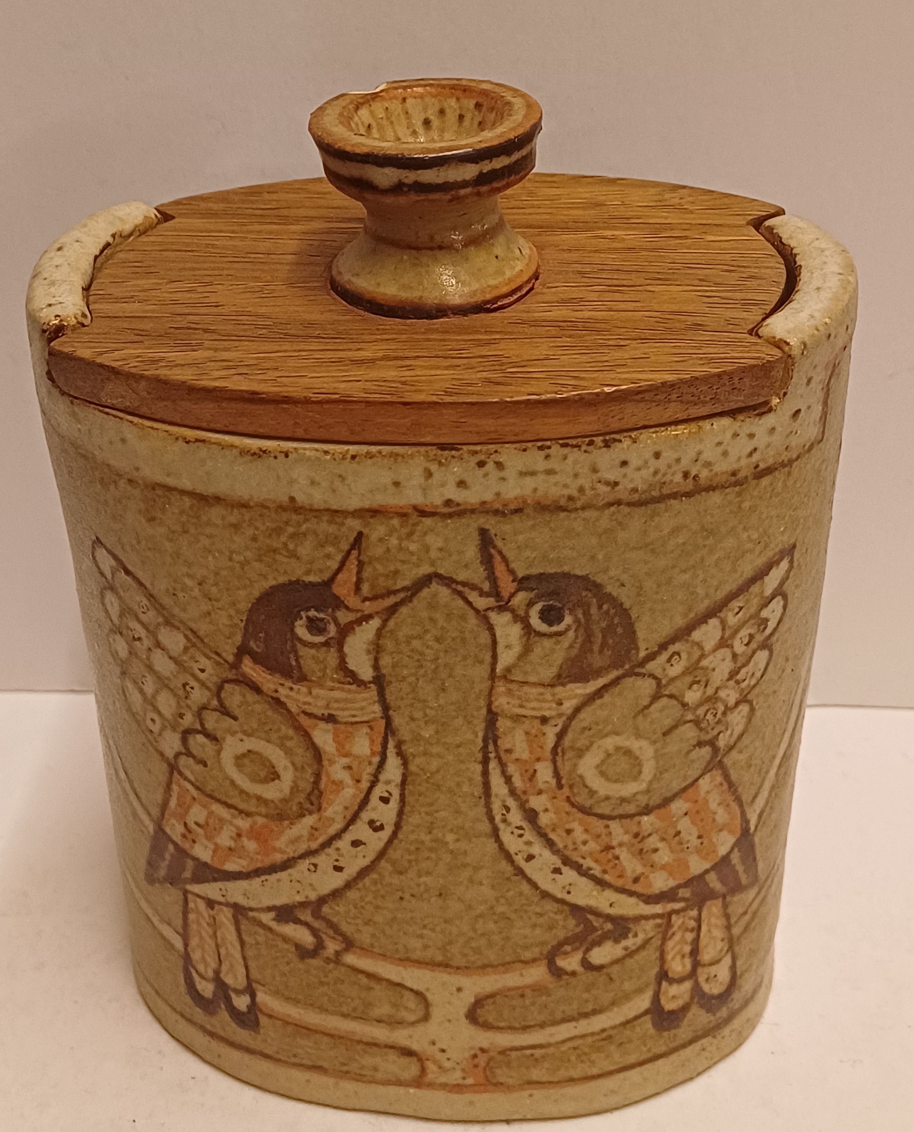 Brown glazed lidded box with bird decoration. Bottom marked LTK and dated '78.