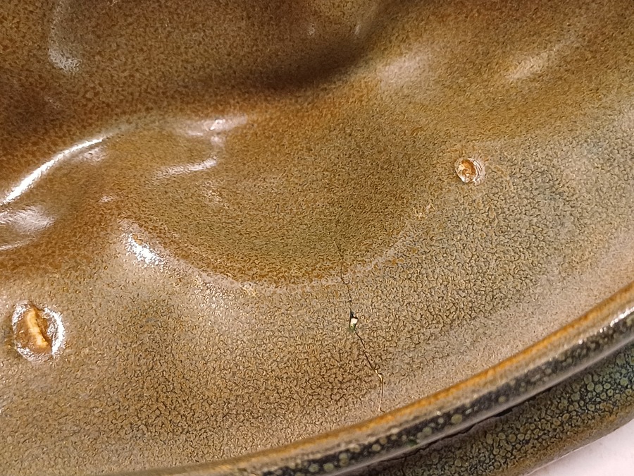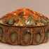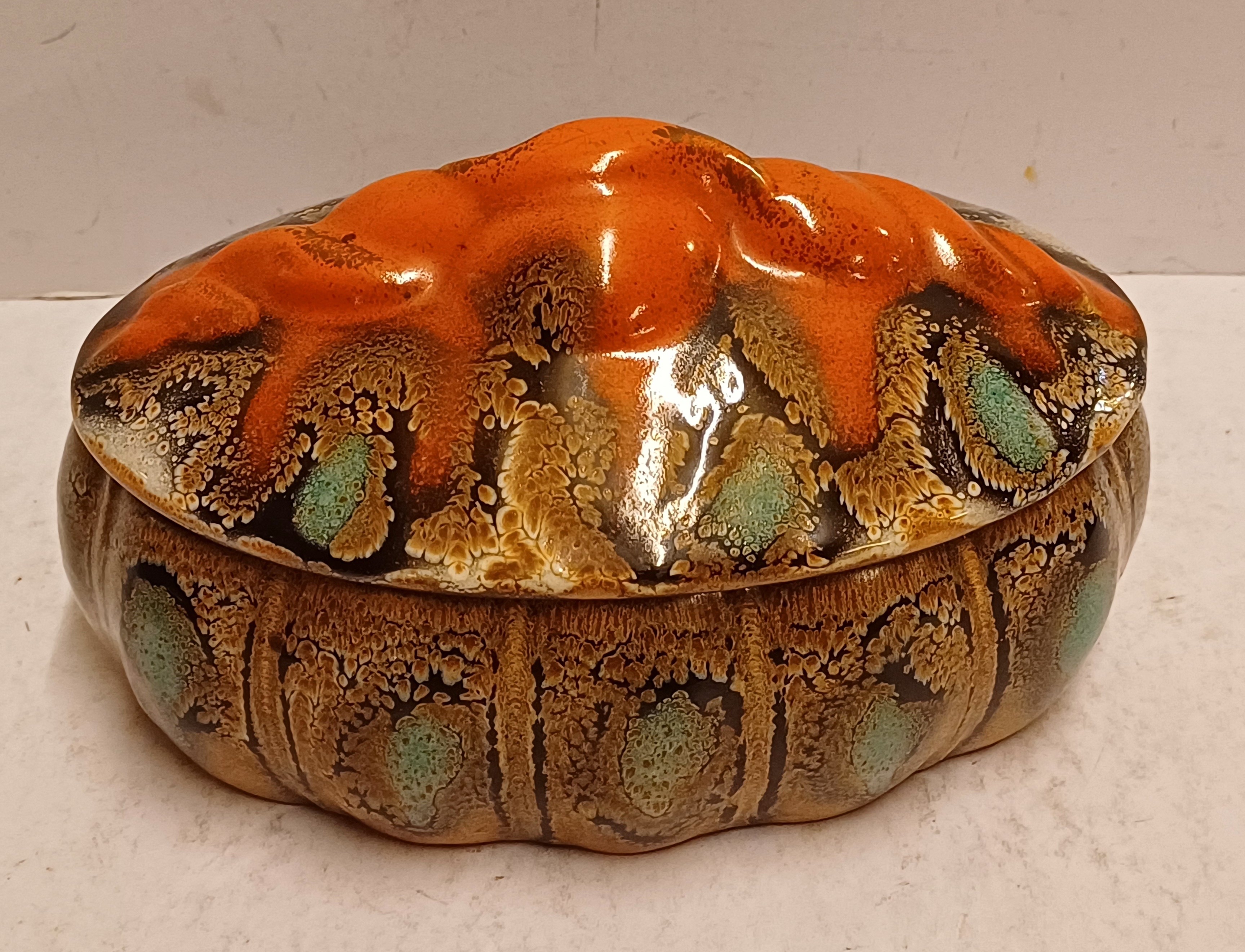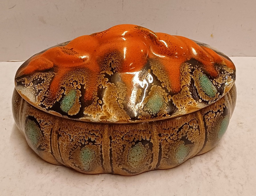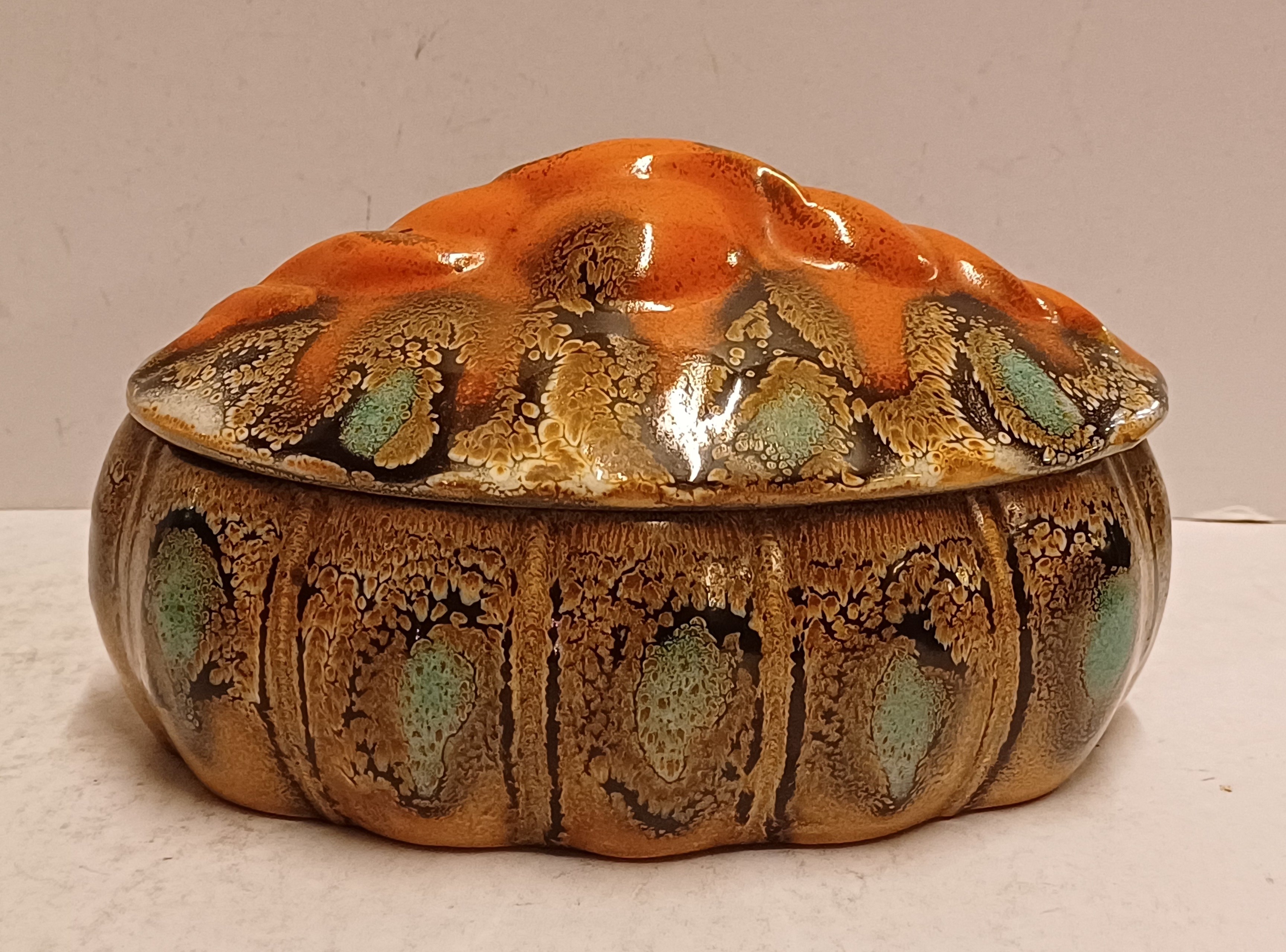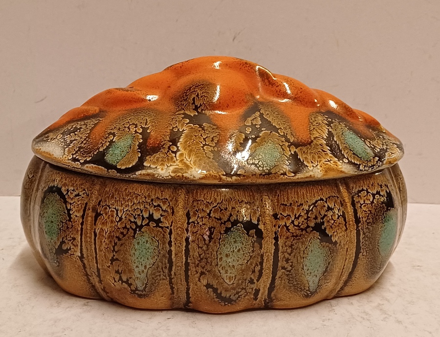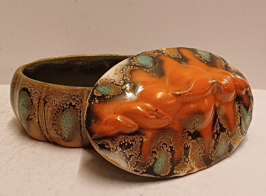 Platelen dekseldoos met grillige greep en Muvelee decor. Onderzijde met fabrieksmerk en modelnummer.