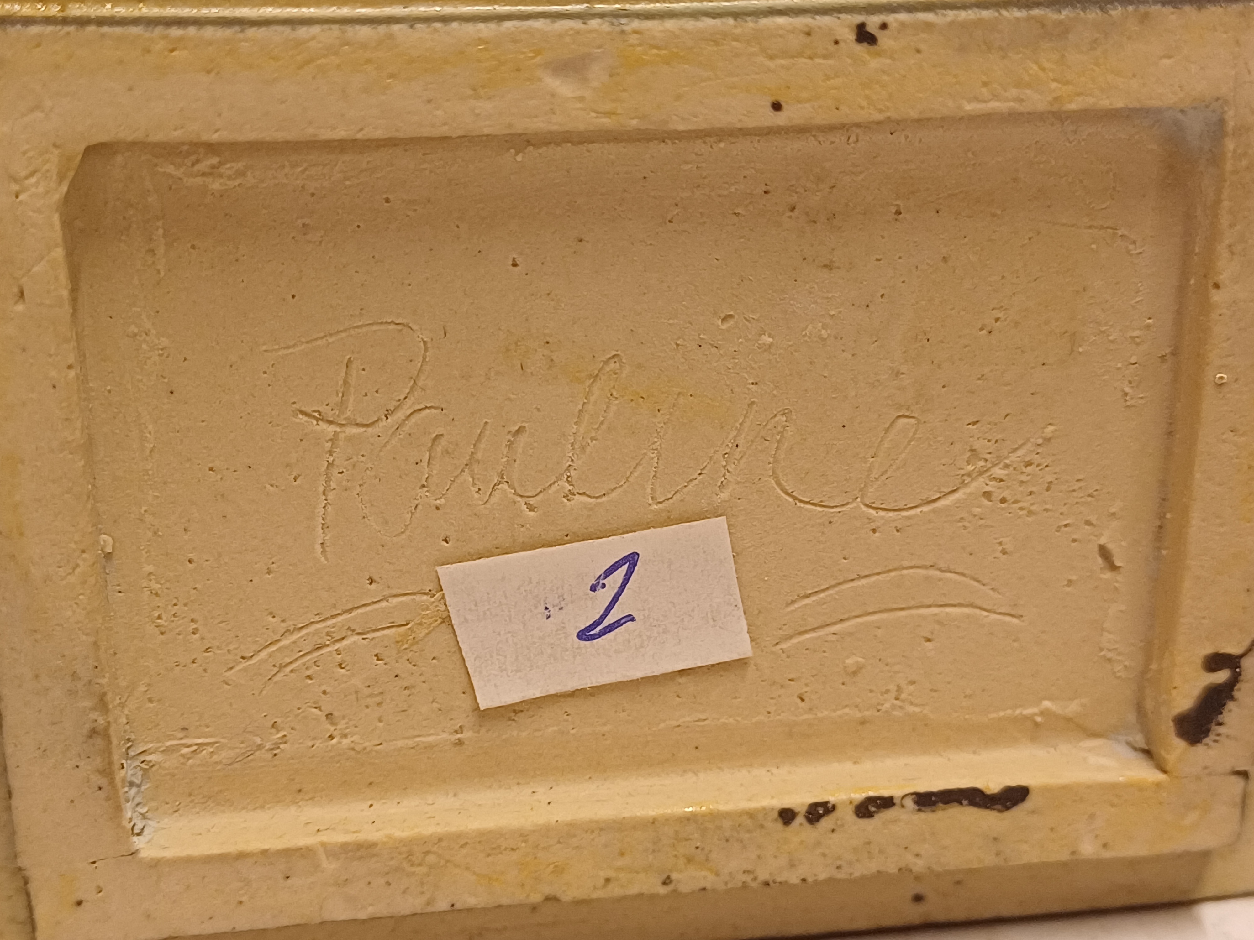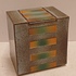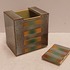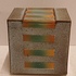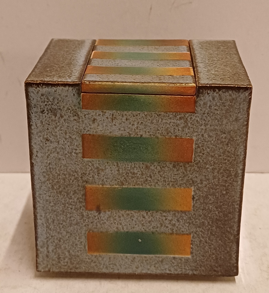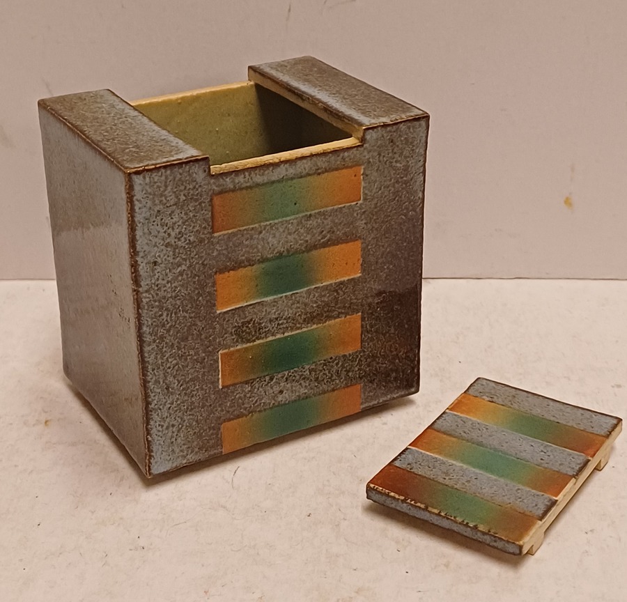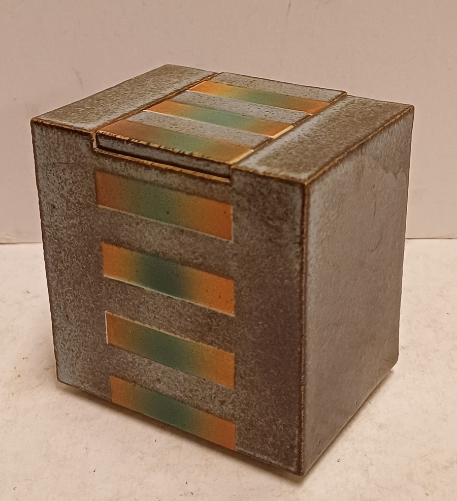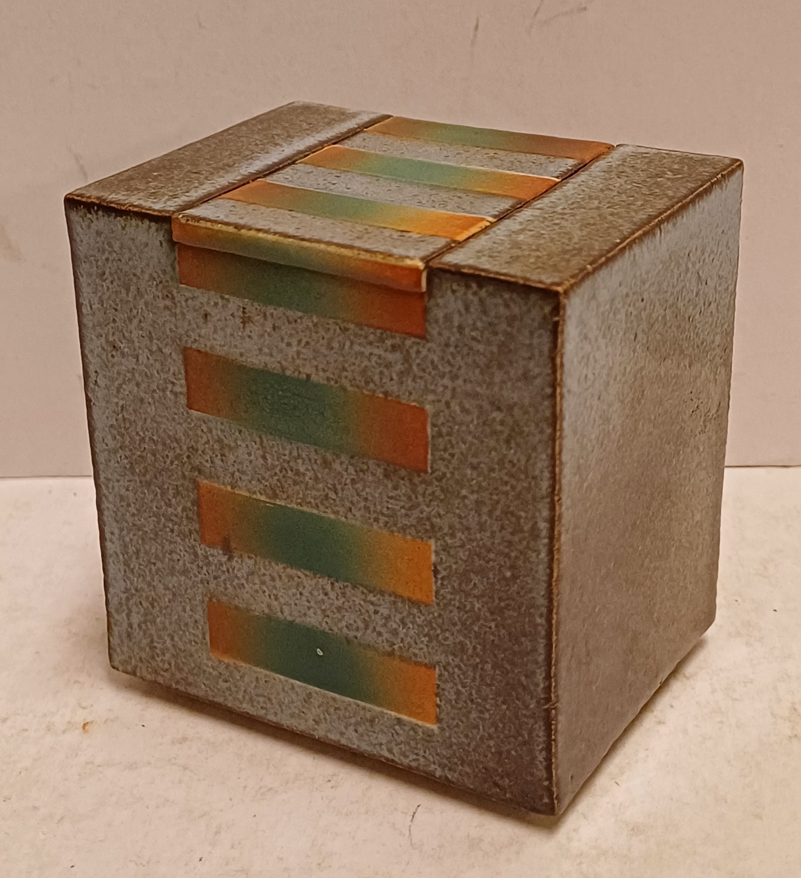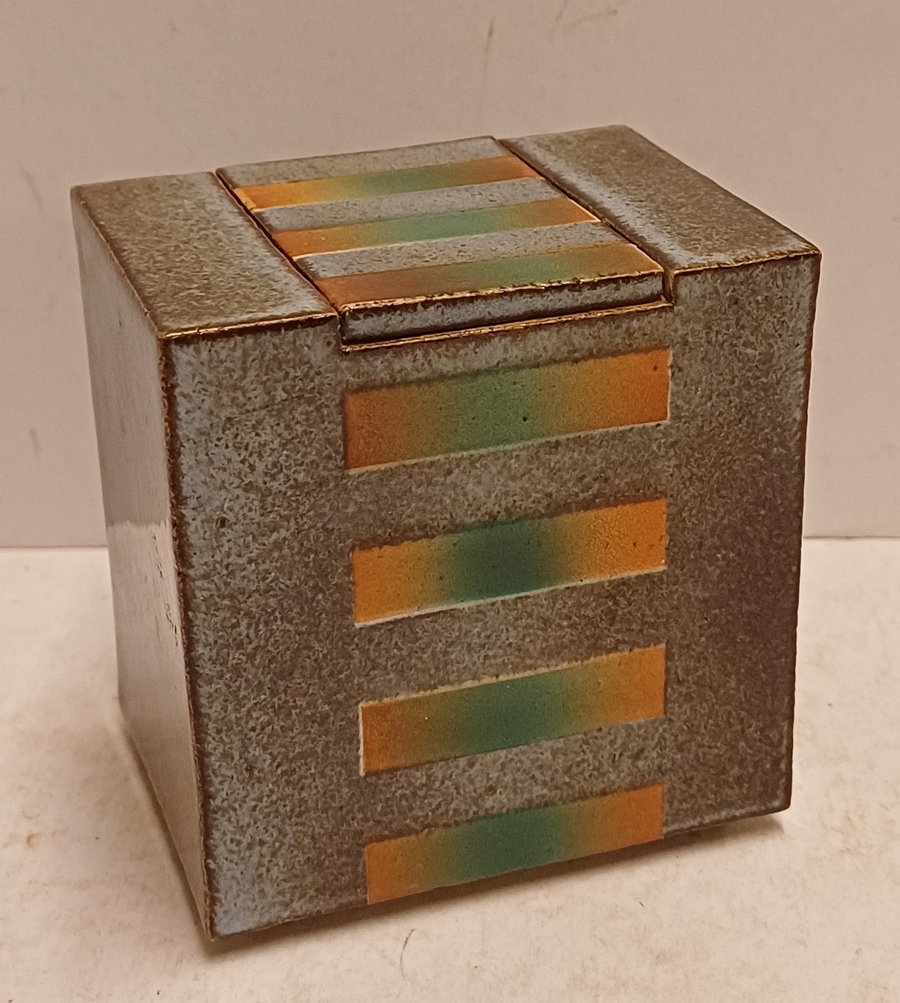 Earthenware rectangular lidded box with stripe decoration on a gray background. Signed on the bottom.