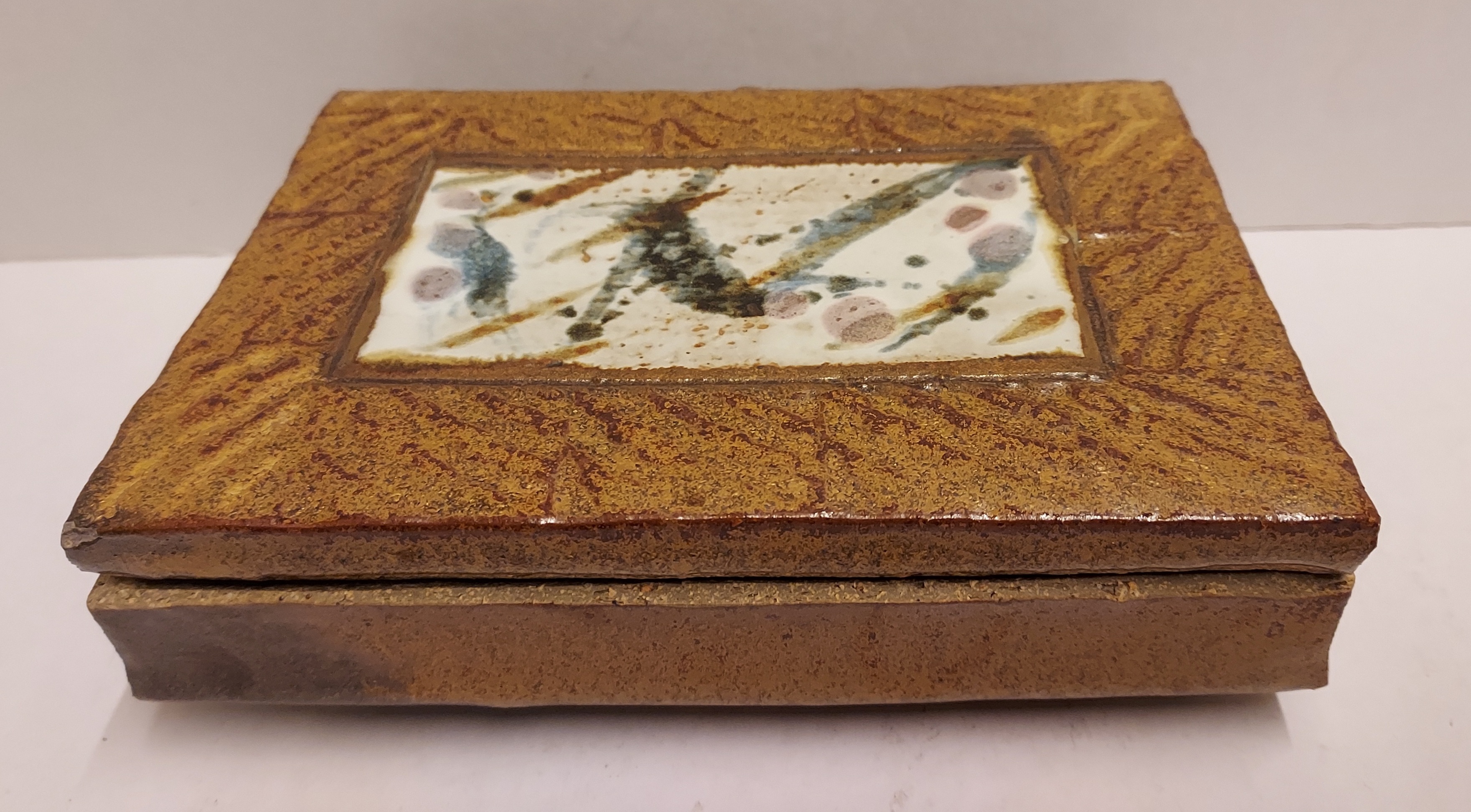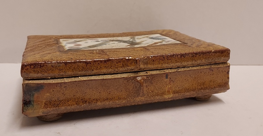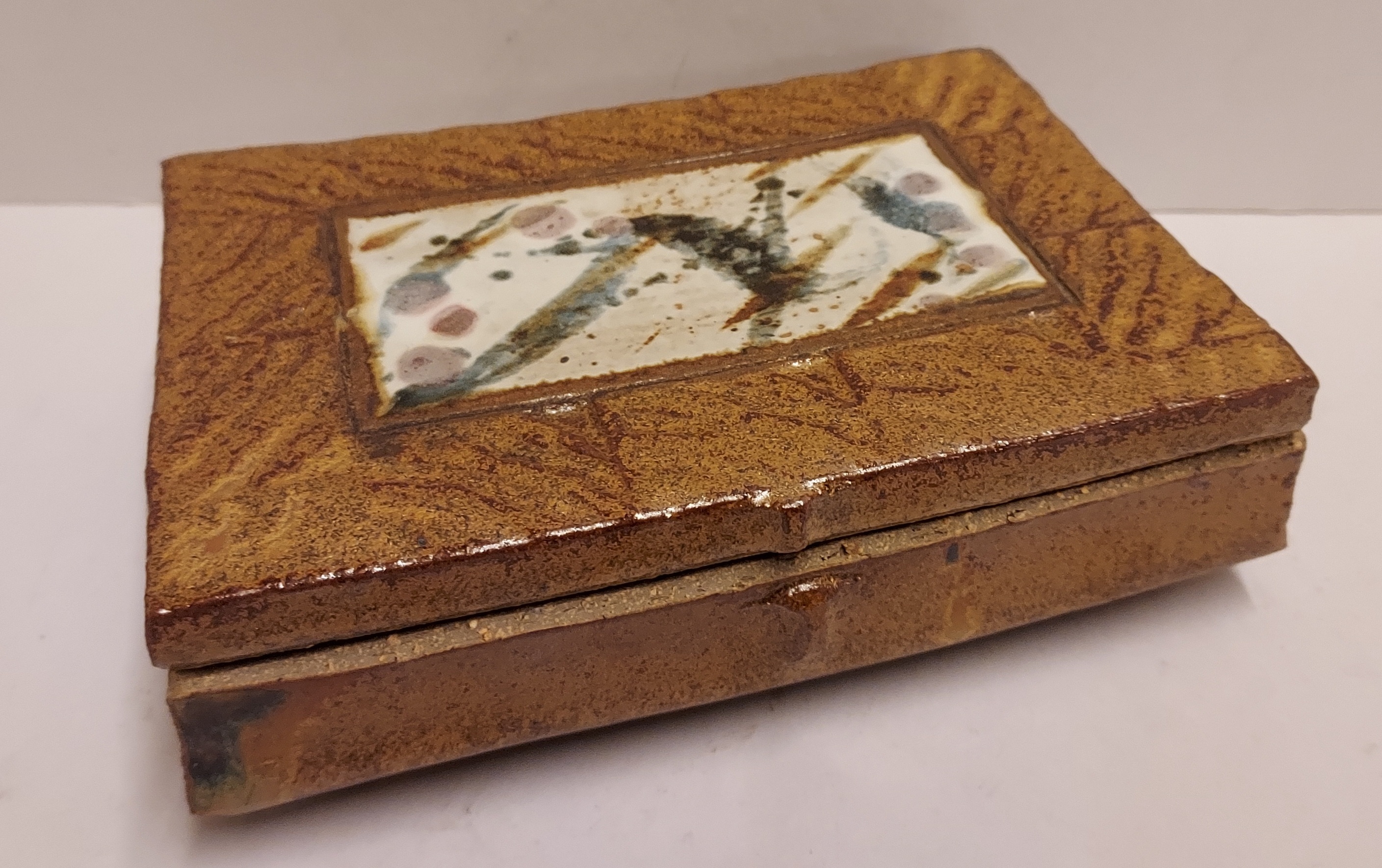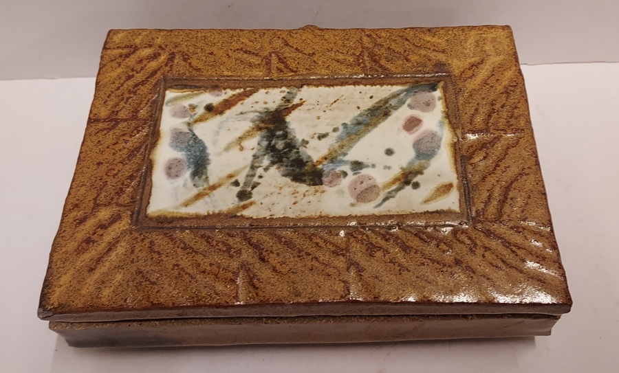 Stoneware lidded box with polychrome glaze. Signed on the bottom.