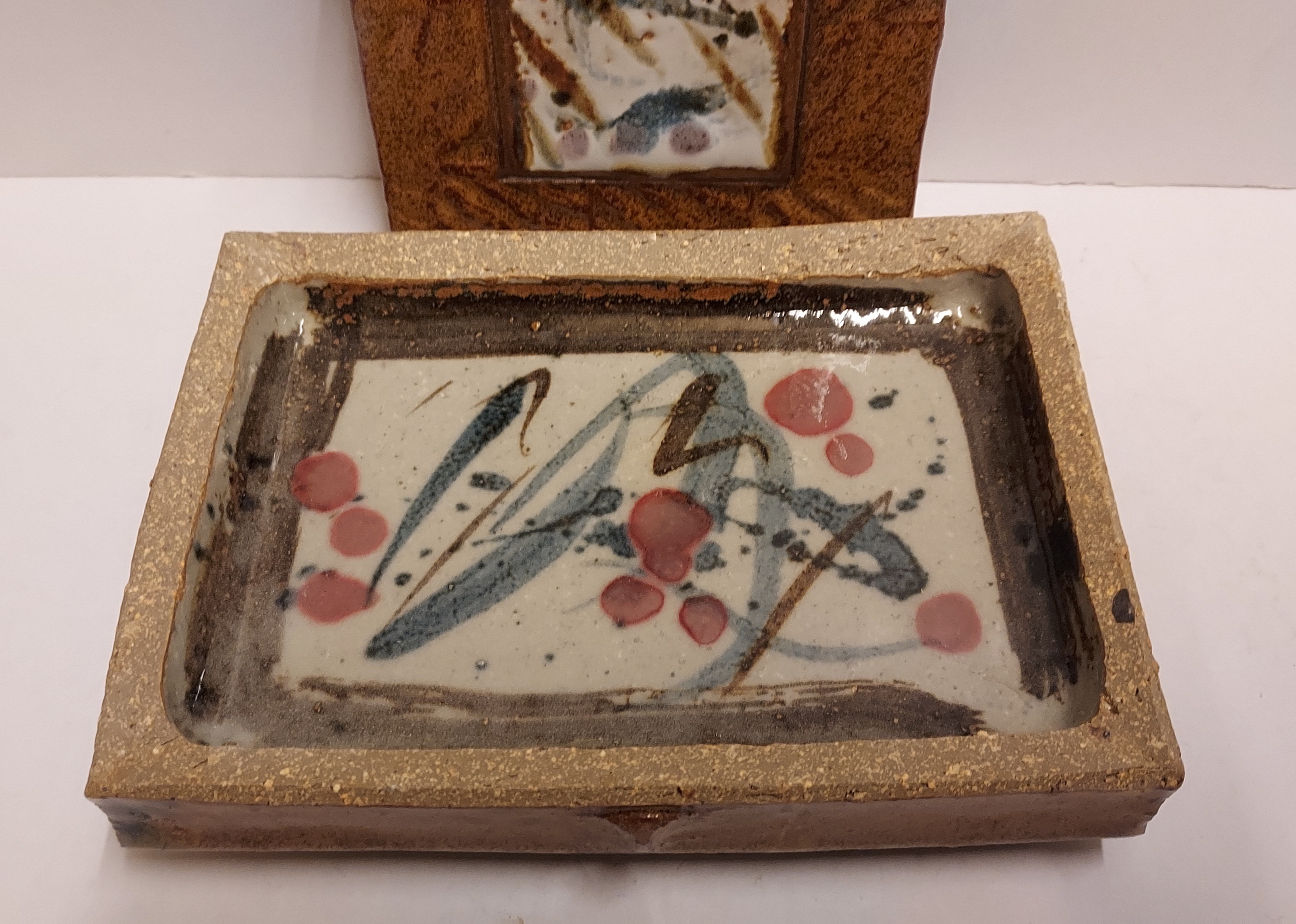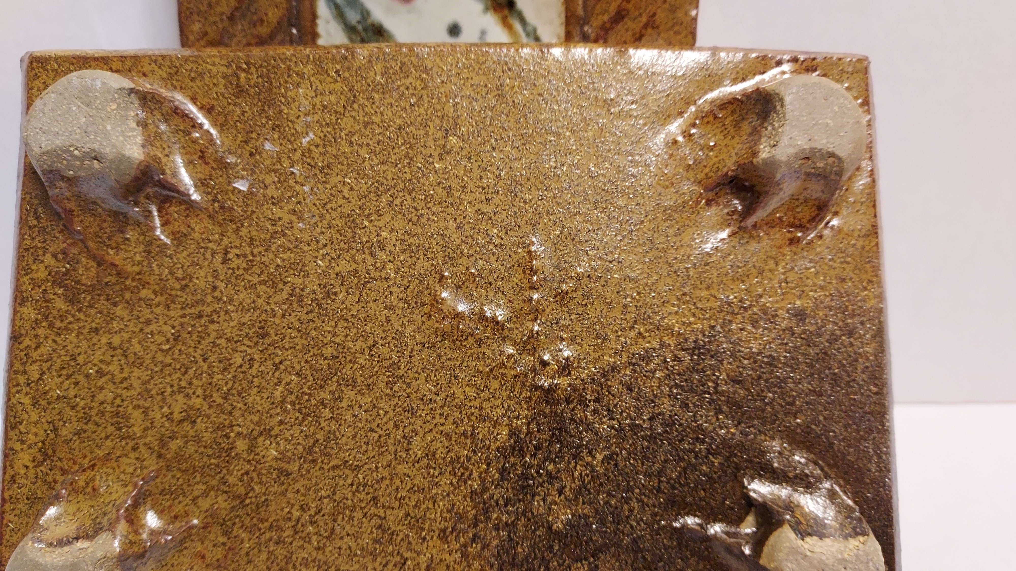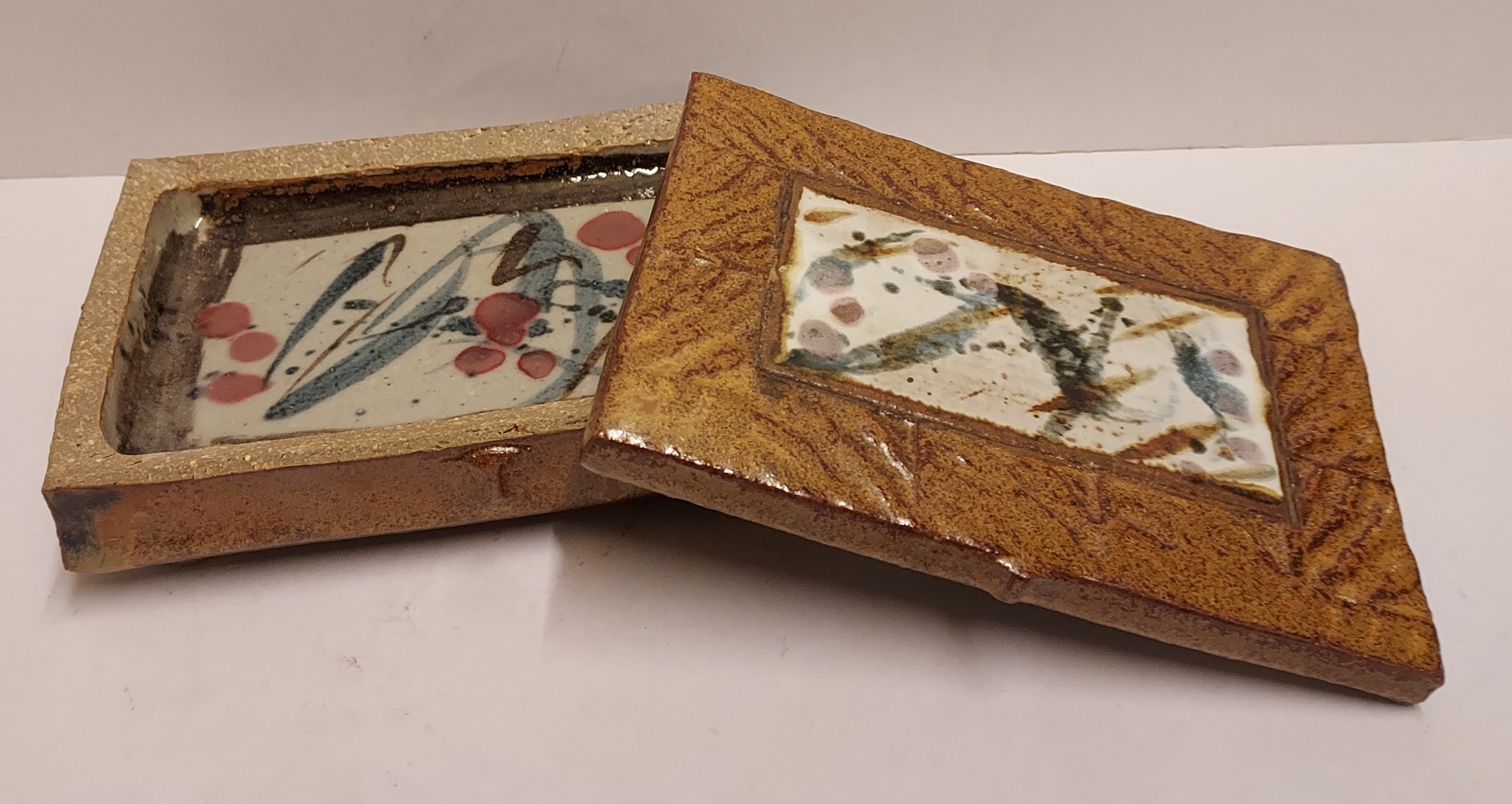 Stoneware lidded box with polychrome glaze. Signed on the bottom.