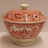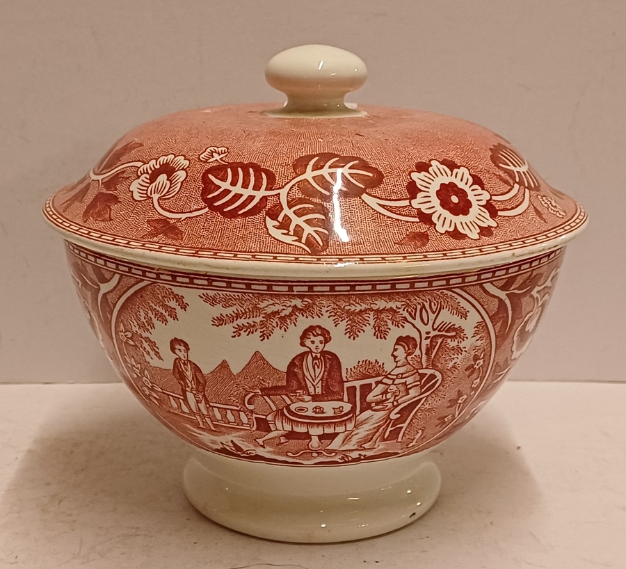 Earthenware lidded bowl with red transfer decor "Tea Drinker." Produced by Societe Ceramique Maastricht.