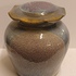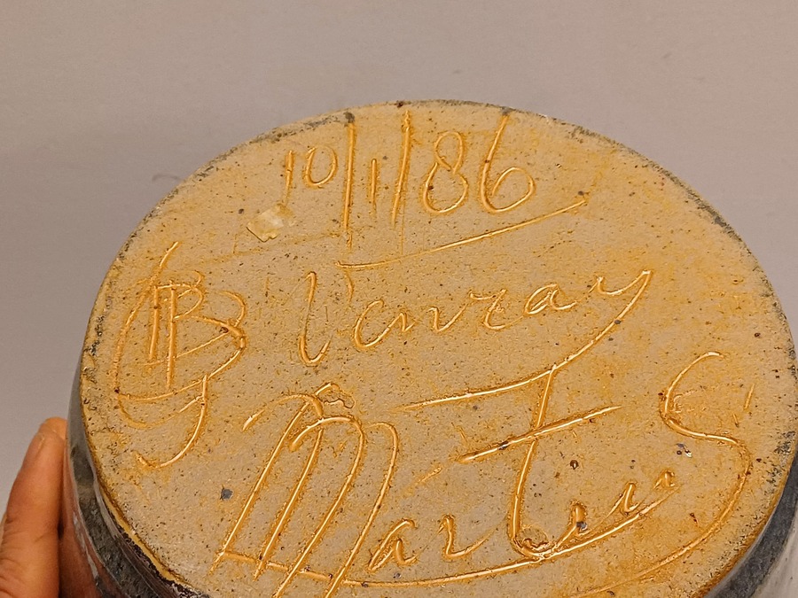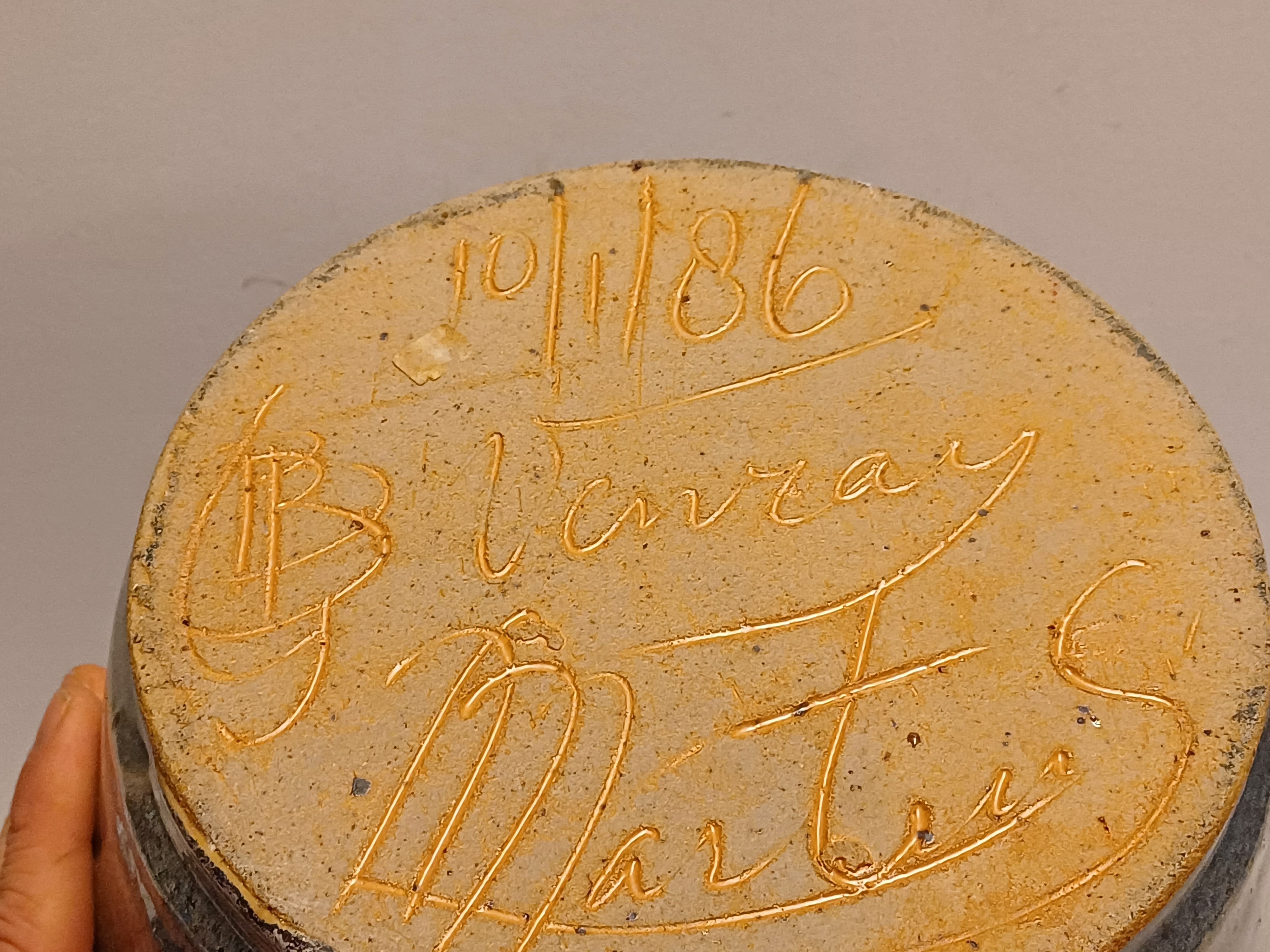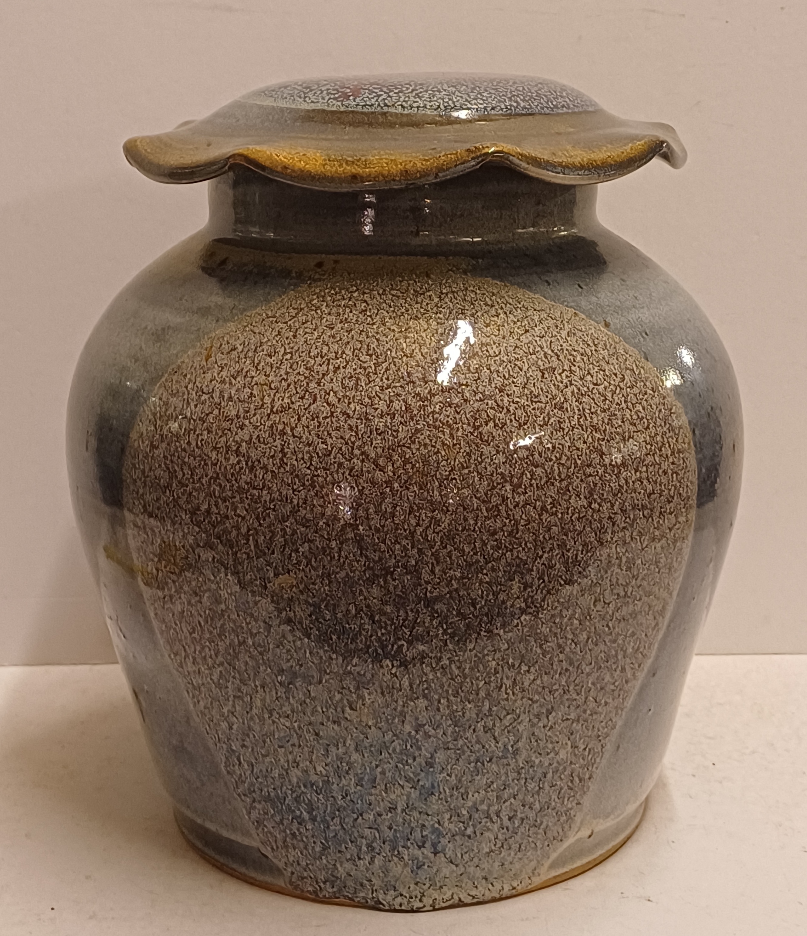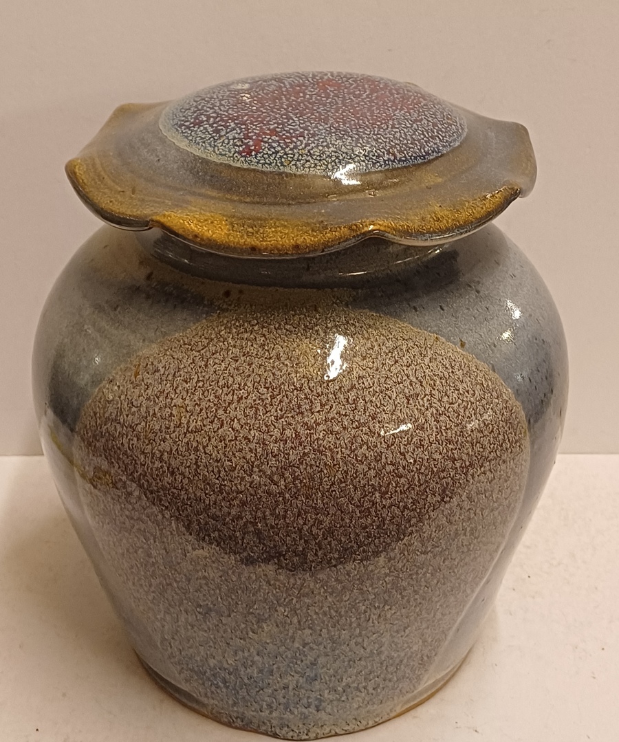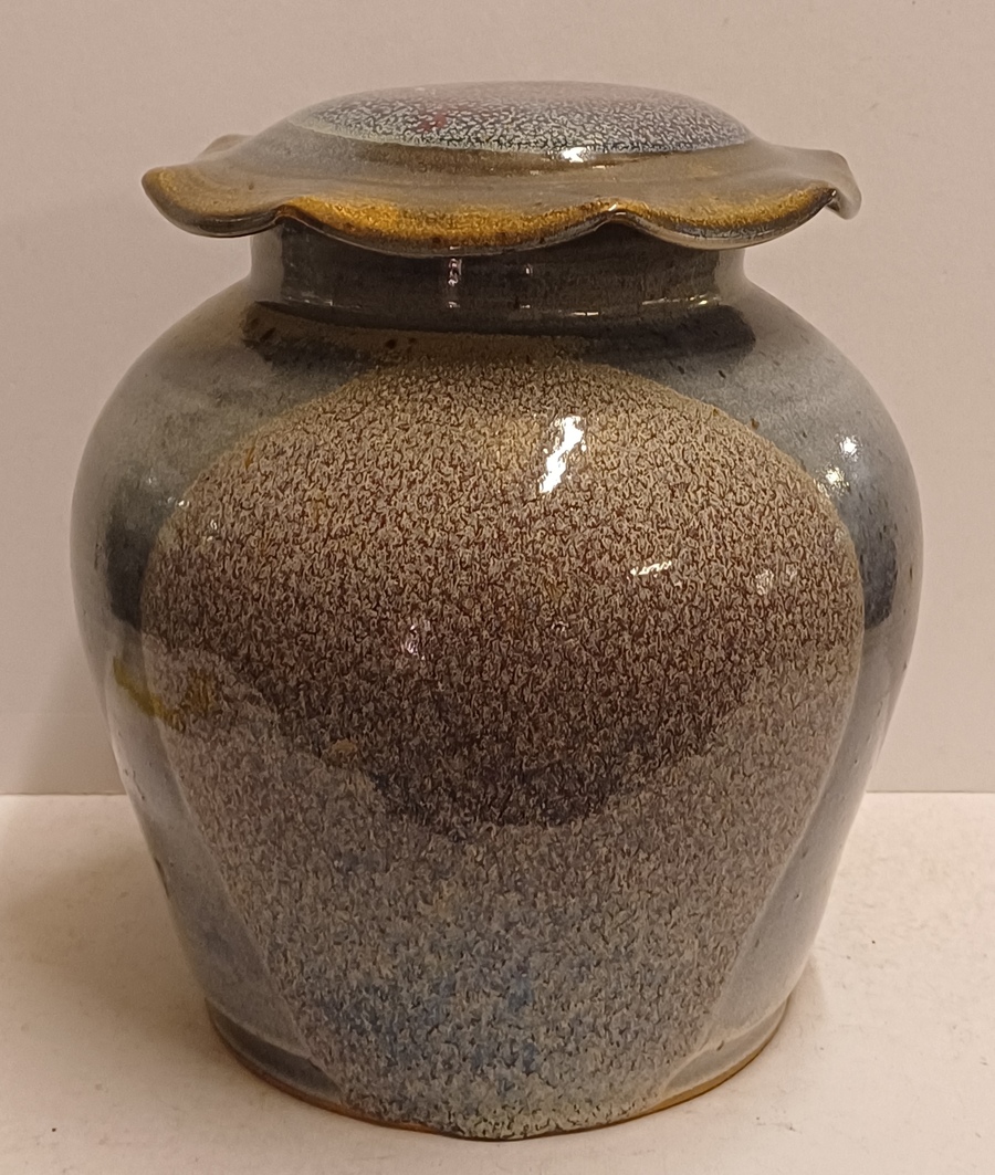 Large stoneware lidded pot with purple glaze and hare's fur glaze on the front. Fully signed on the bottom and dated '86.
