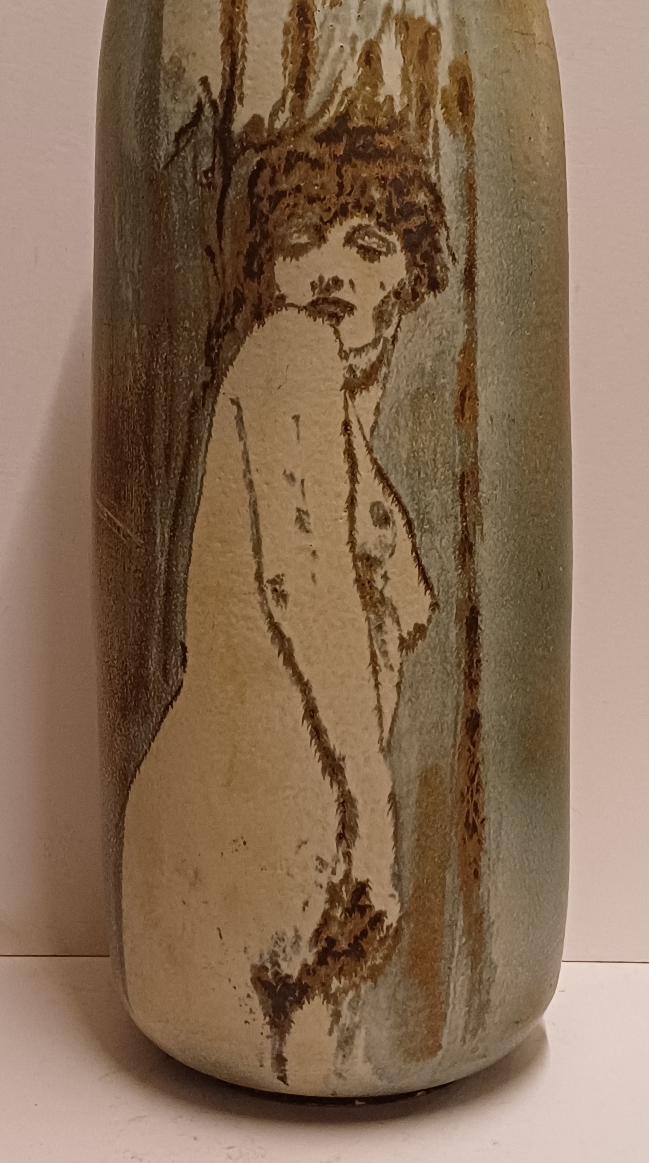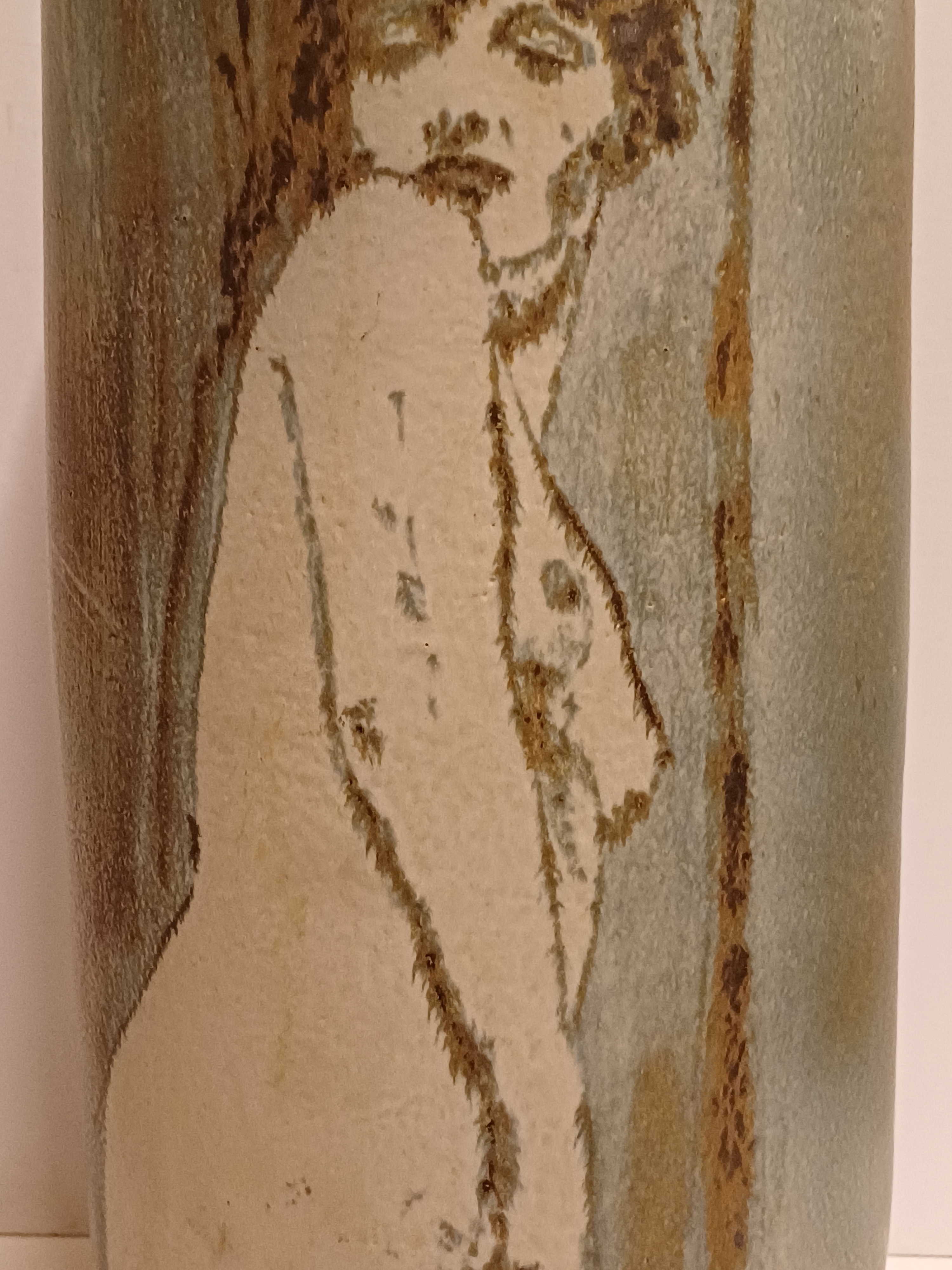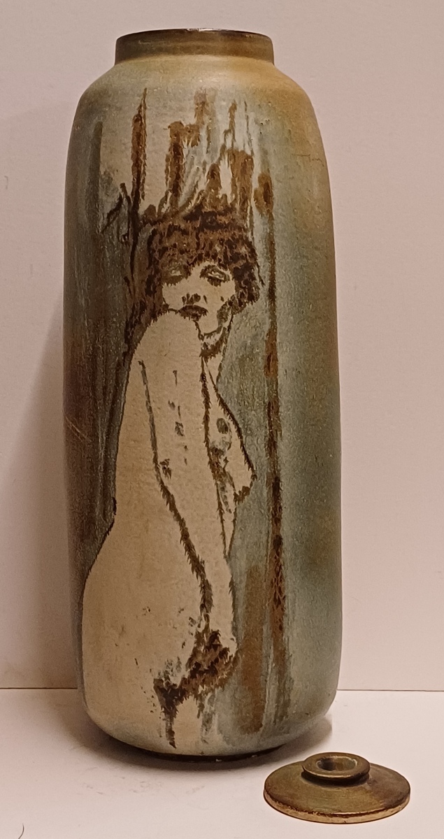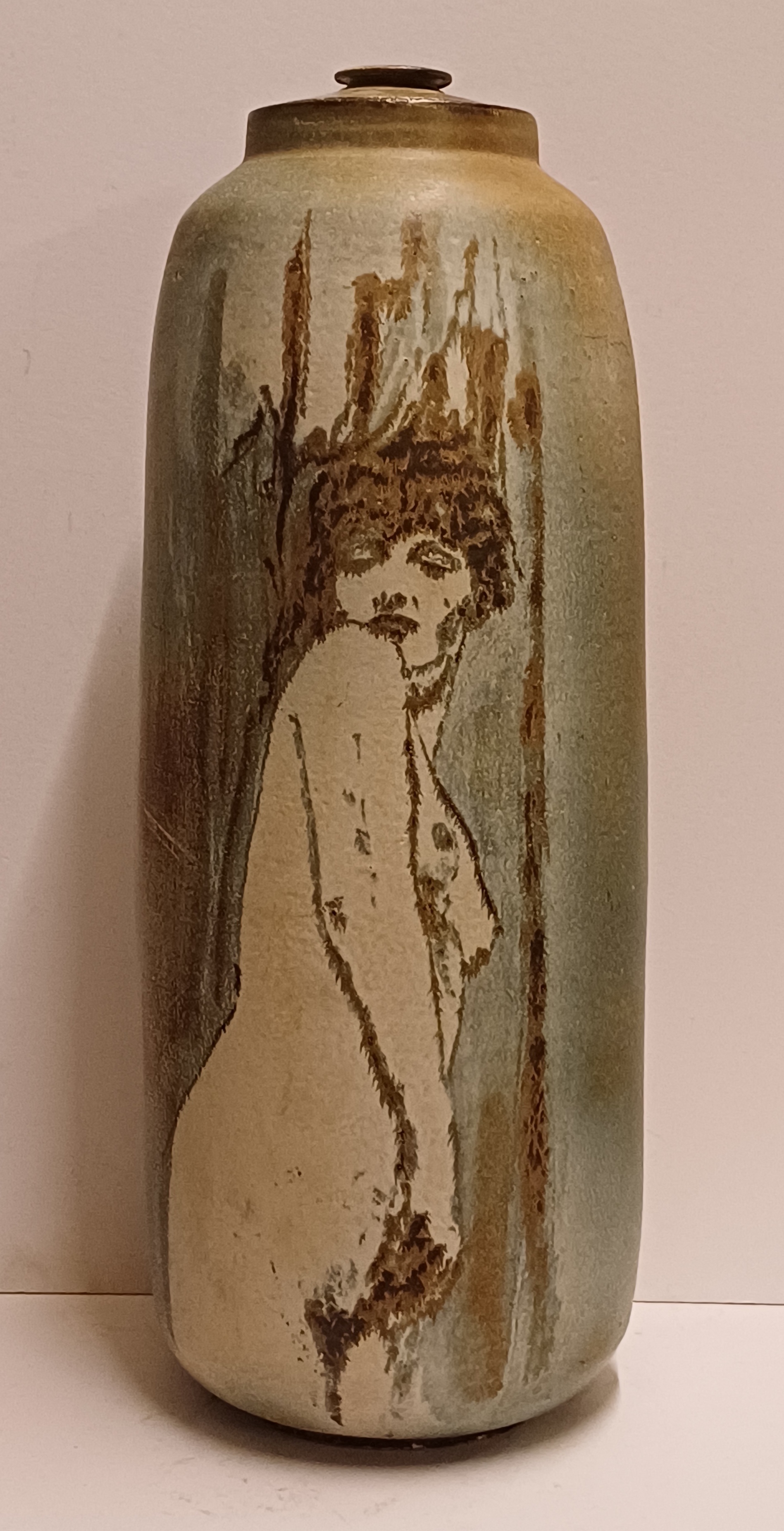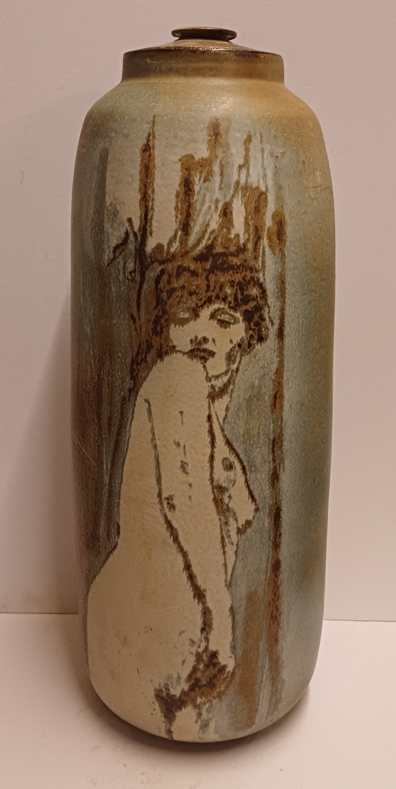 Grote aardewerken dekselpot met decoratie van een naakte dame, achterzijde met abstracte decoratie. Niet gesigneerd.