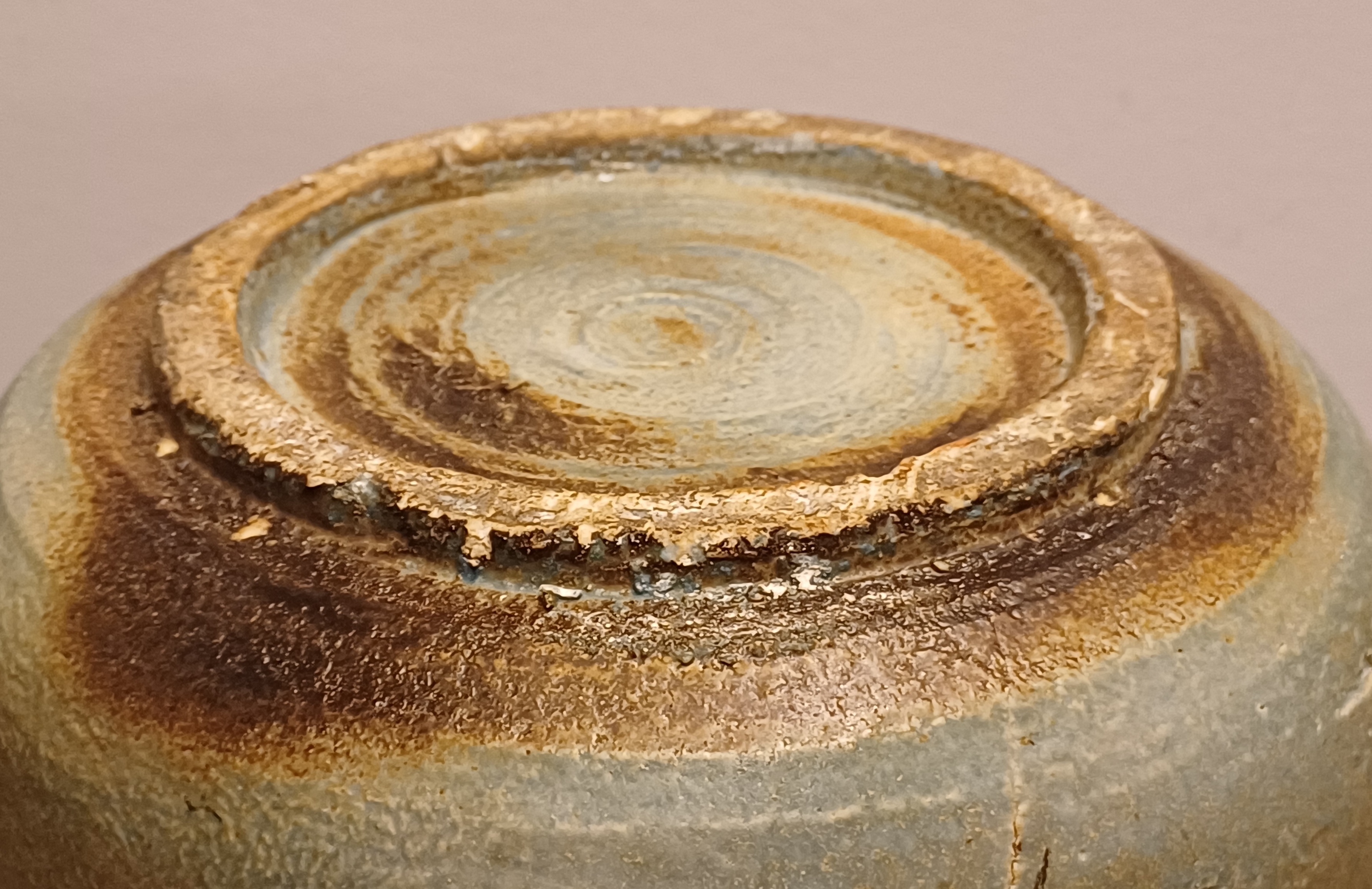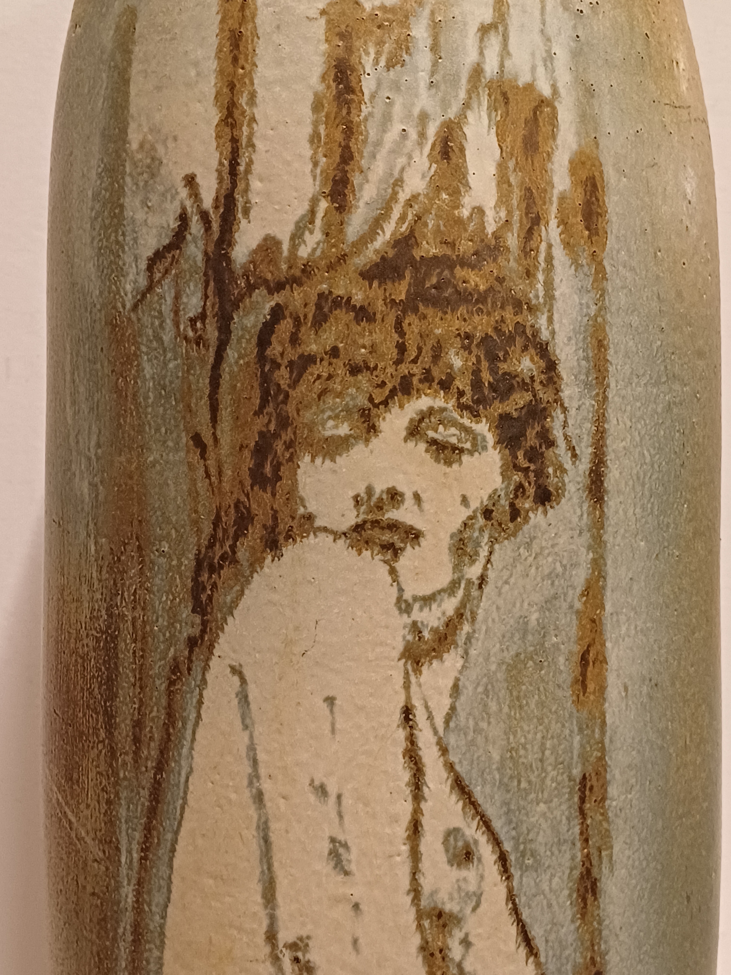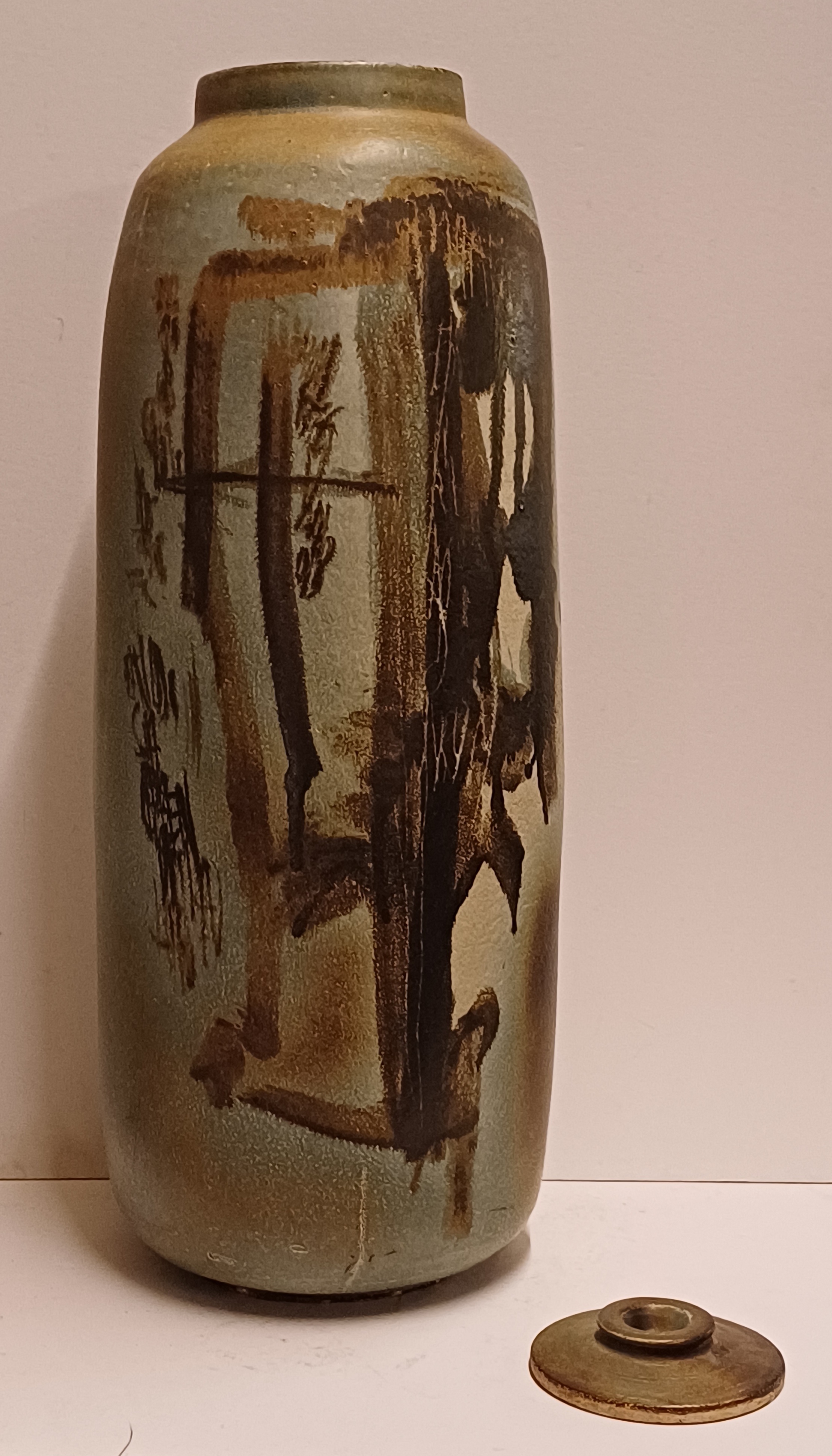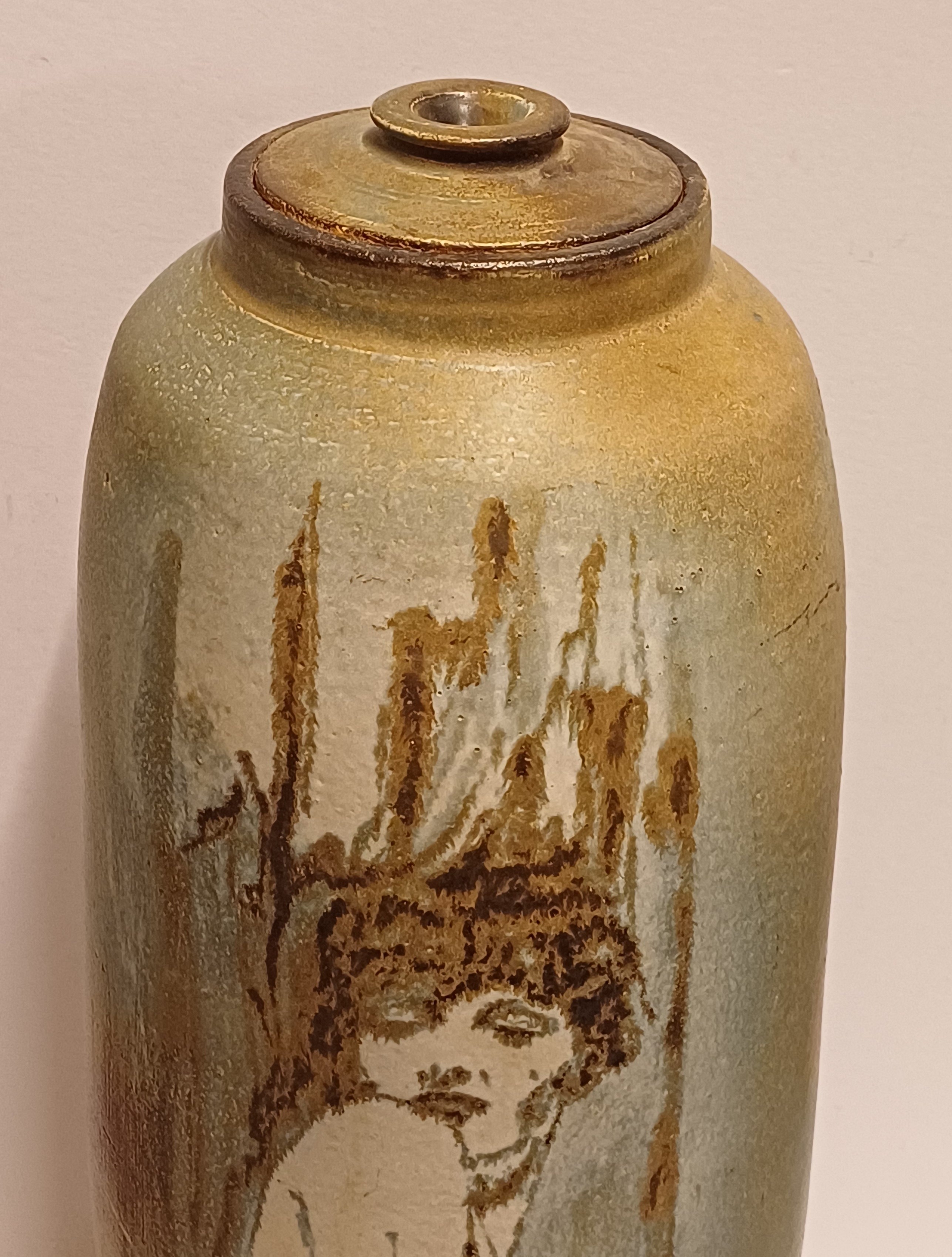 Grote aardewerken dekselpot met decoratie van een naakte dame, achterzijde met abstracte decoratie. Niet gesigneerd.