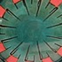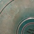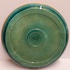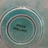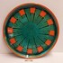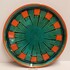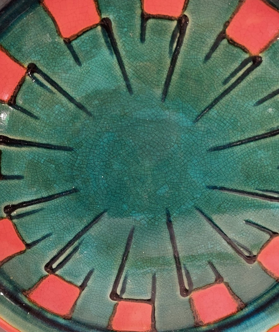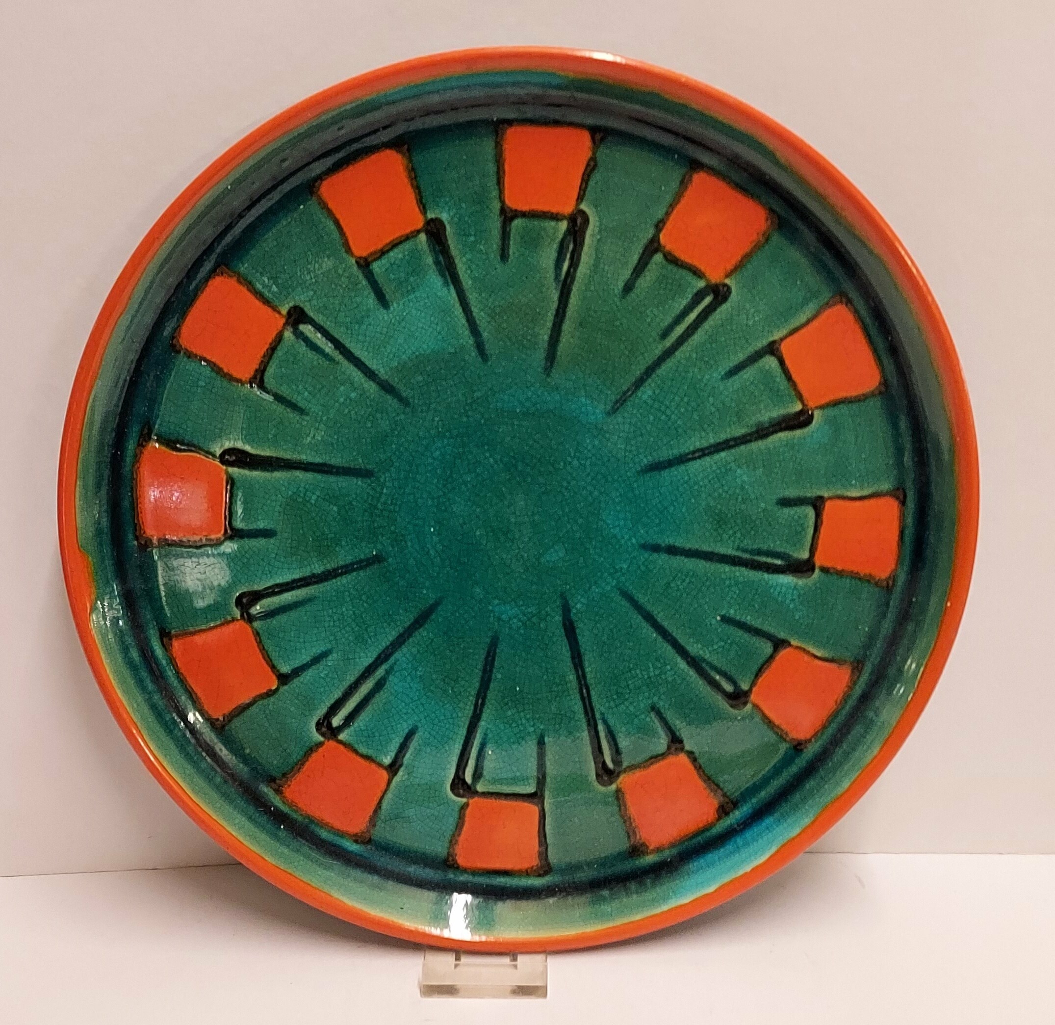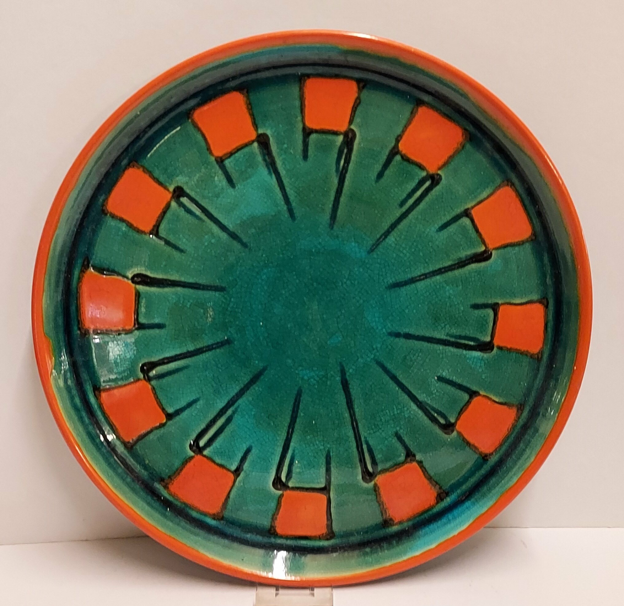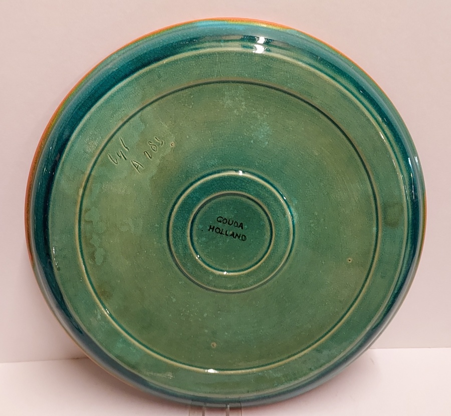 Tray with green glaze and orange squares along the edge. Design by Leen Muller. Bottom marked Gouda Holland.