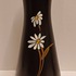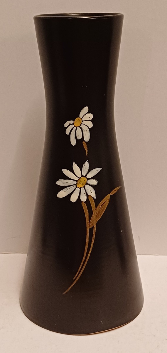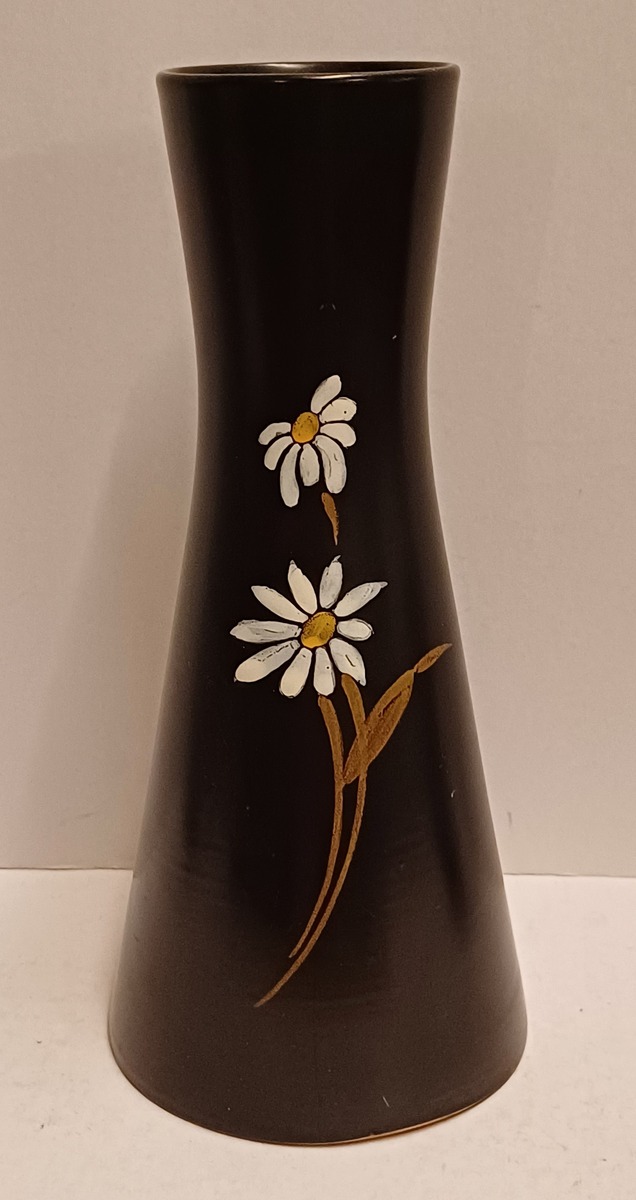Black glazed earthenware vase with daisy decor. Produced by Plateelbakkerij Zuid Holland. Bottom with factory stamp.