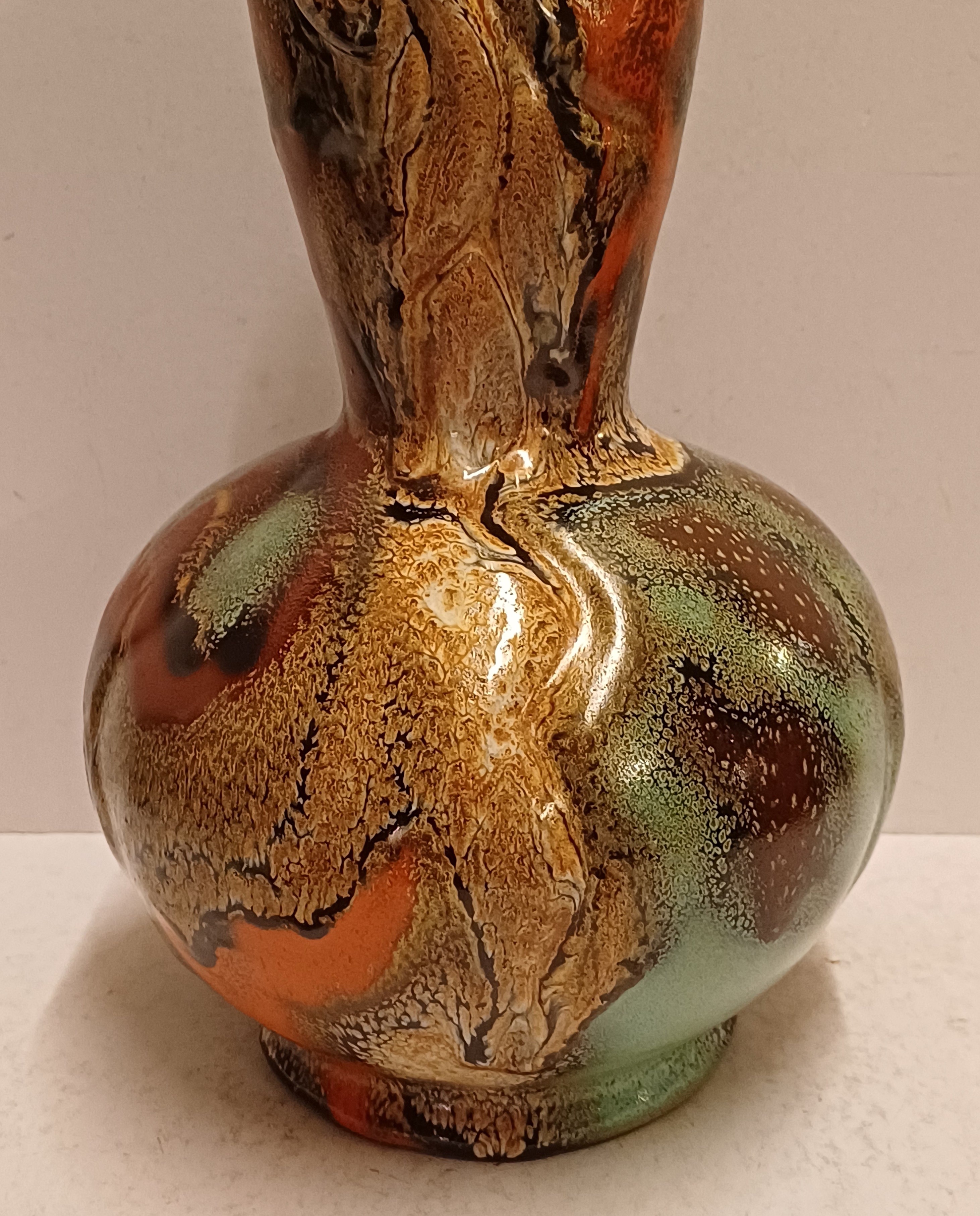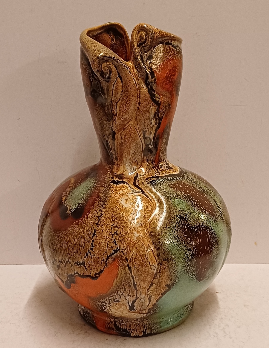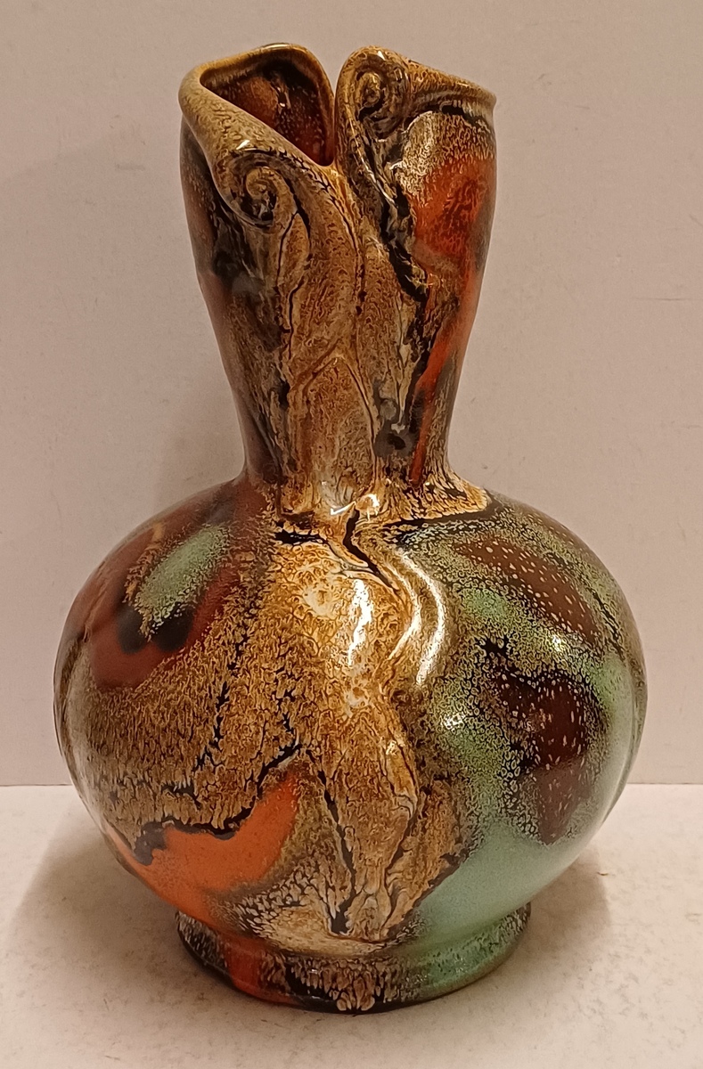 Gemeleerde Muvelee glazuur op grillige gesneden vaas. Ontwerp Fons Decker voor Plateelbakkerij Zuid Holland. Onderzijde gemerkt