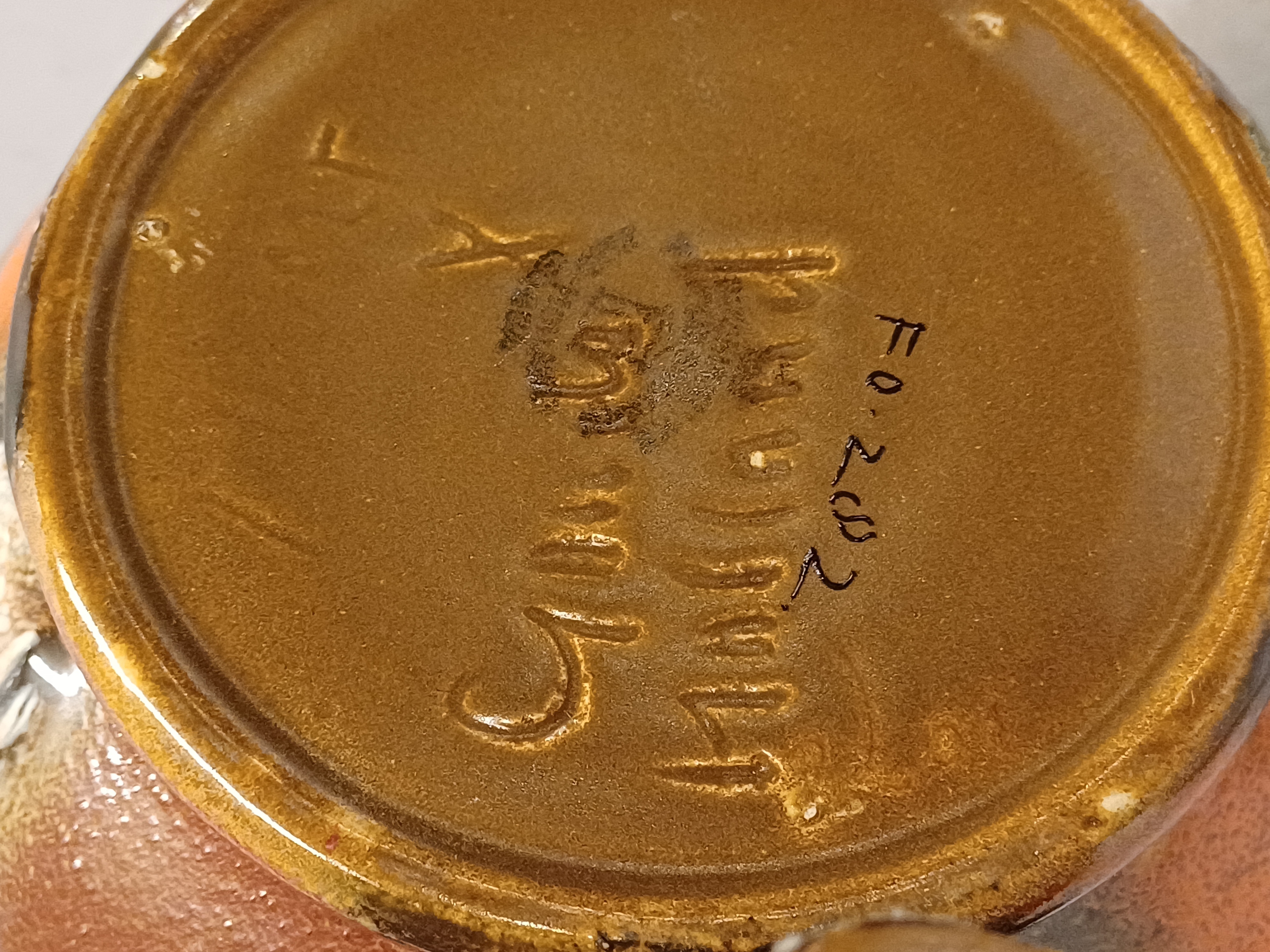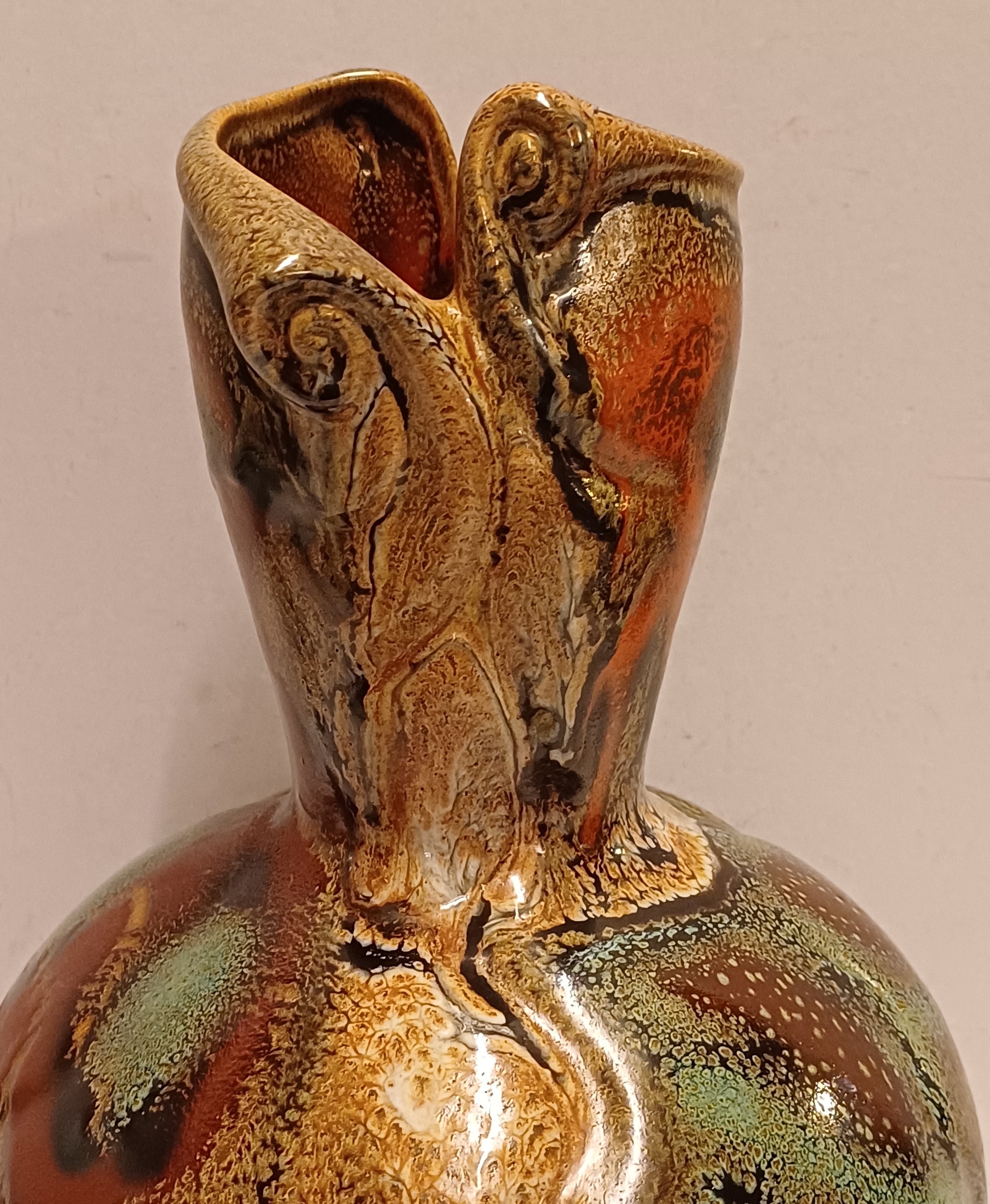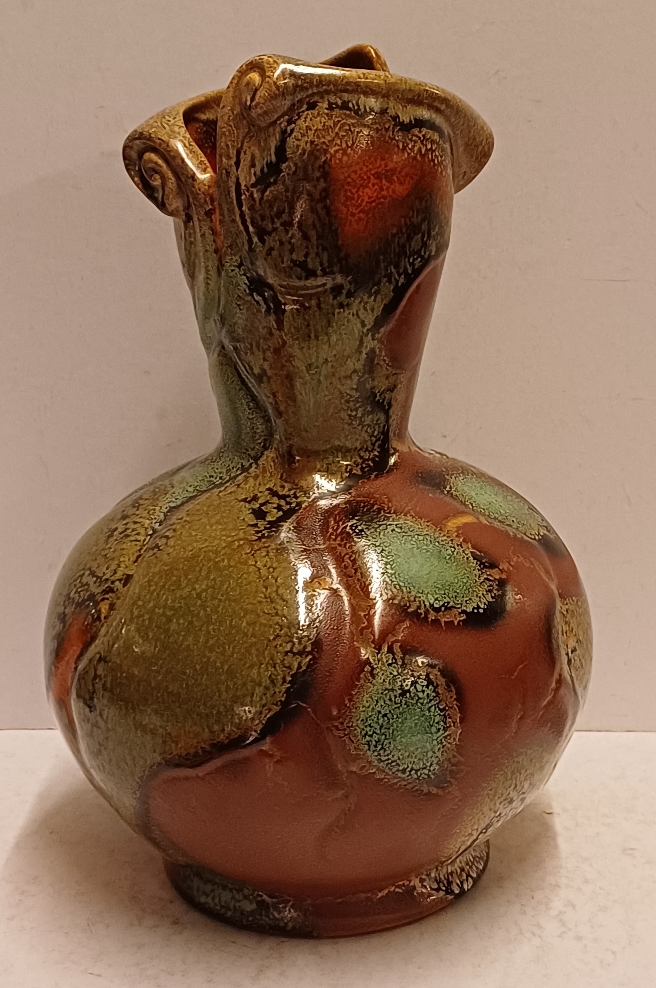 Gemeleerde Muvelee glazuur op grillige gesneden vaas. Ontwerp Fons Decker voor Plateelbakkerij Zuid Holland. Onderzijde gemerkt