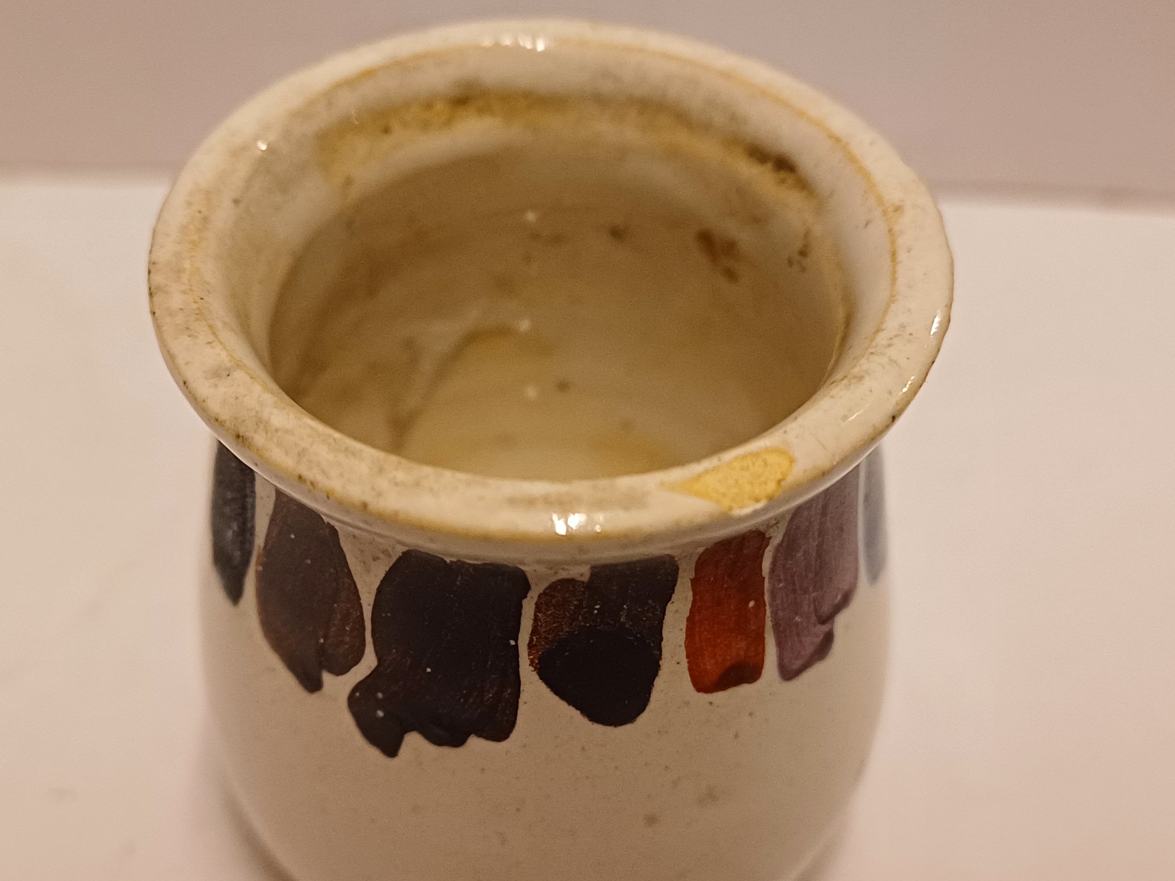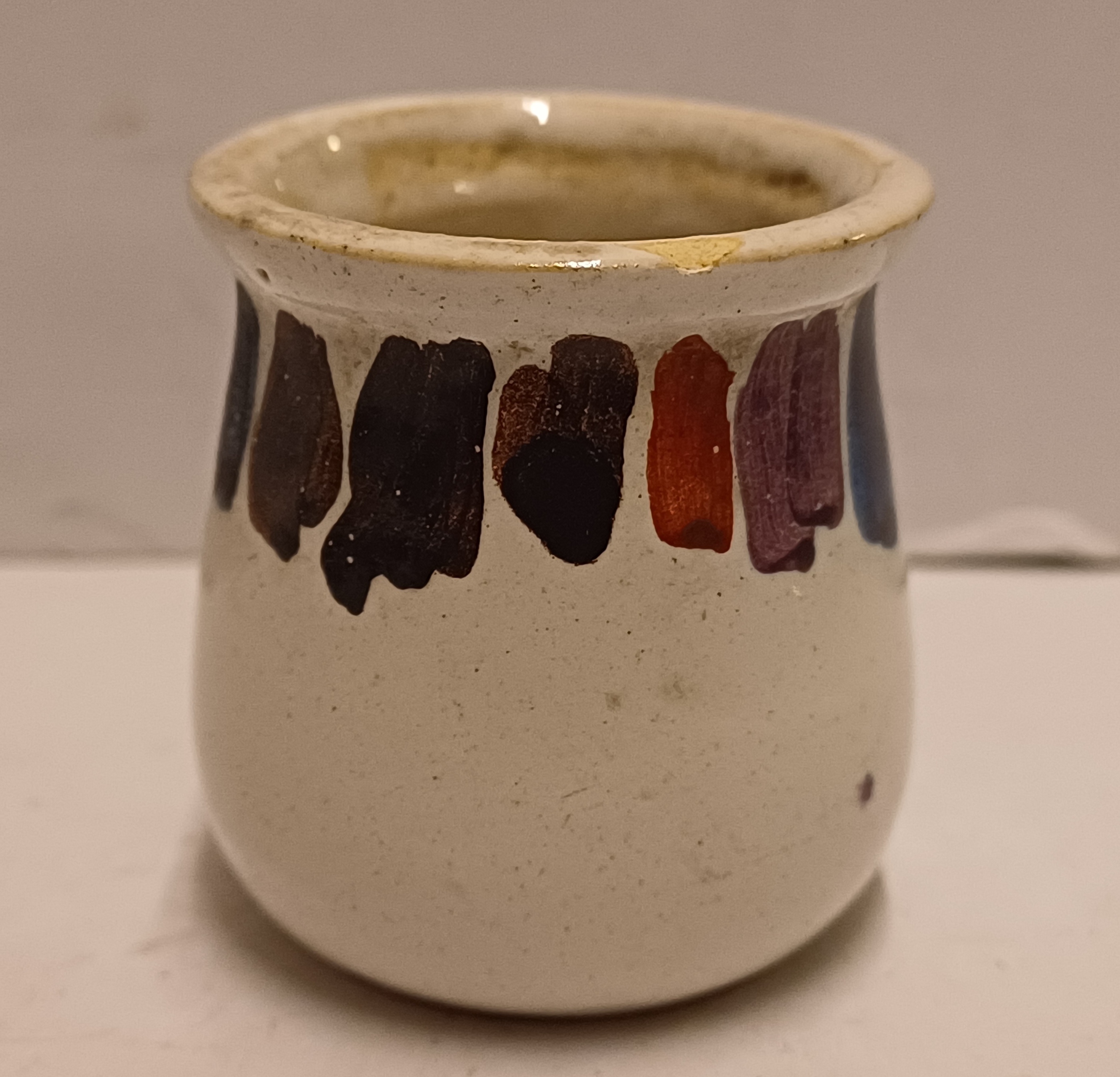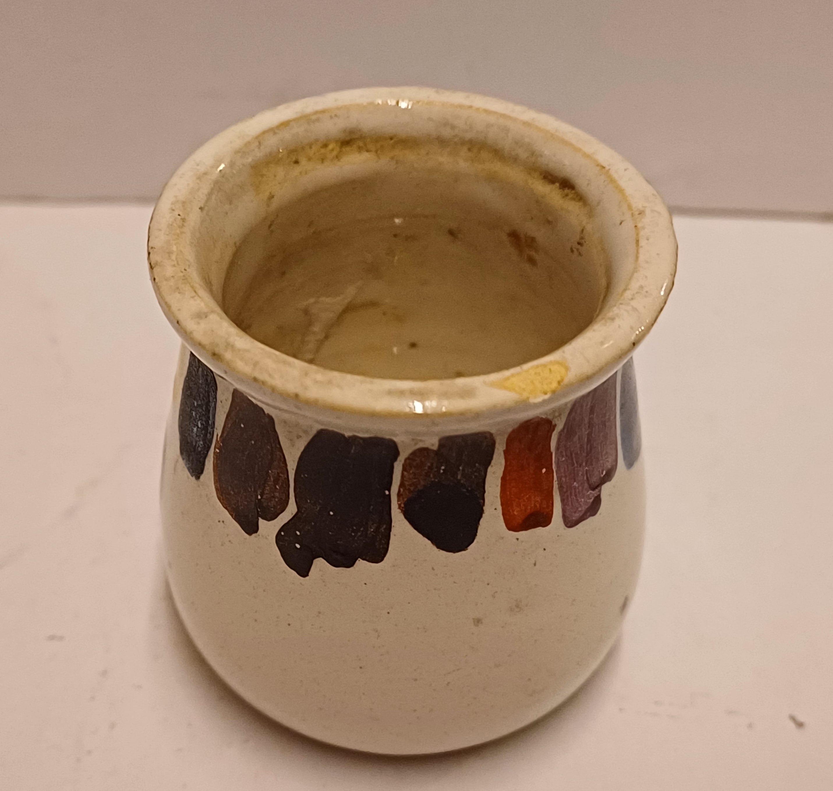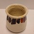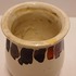 Small white glazed pot with various stripes of different glazes. Bottom with scratched number and painted number.