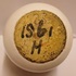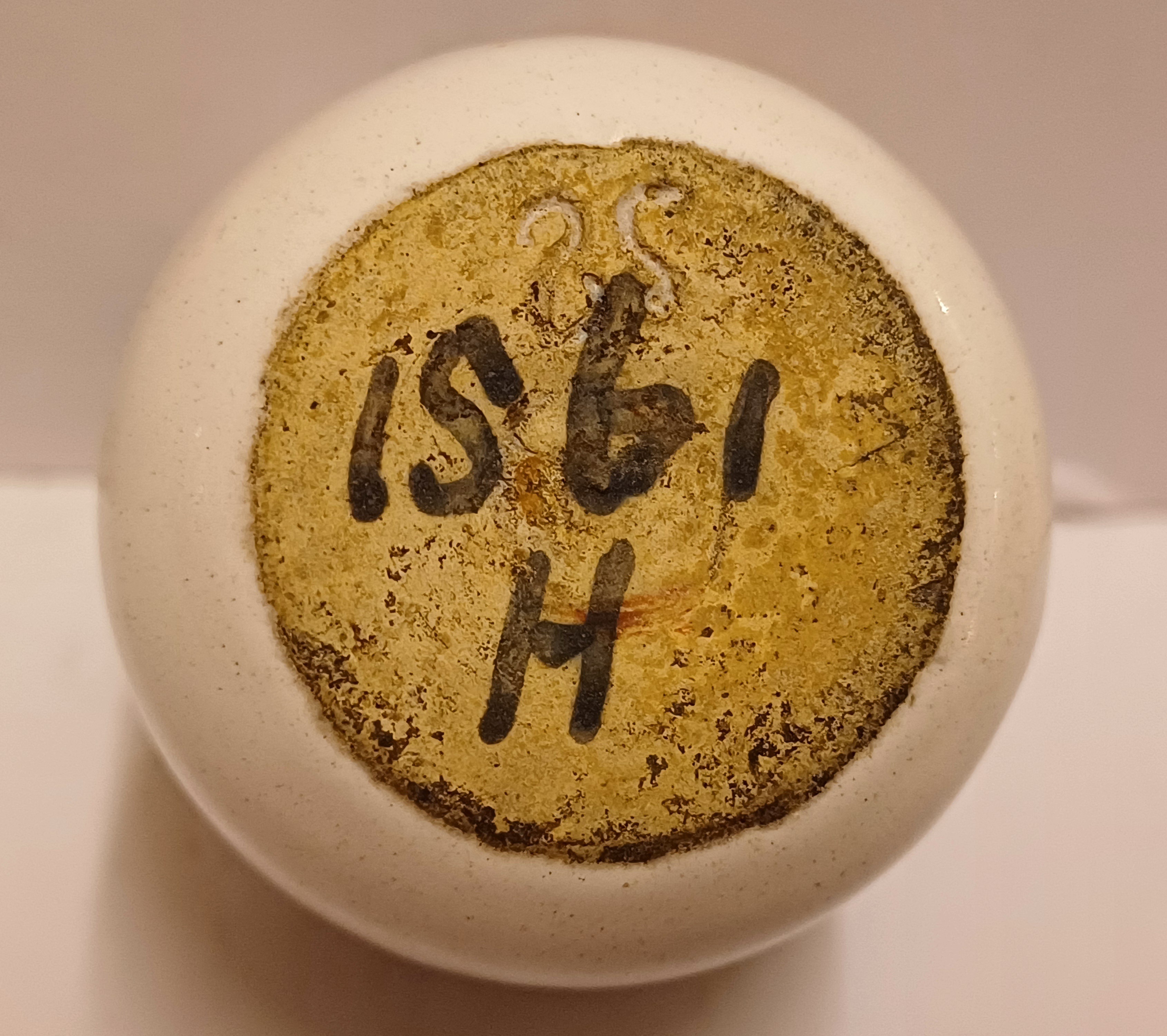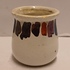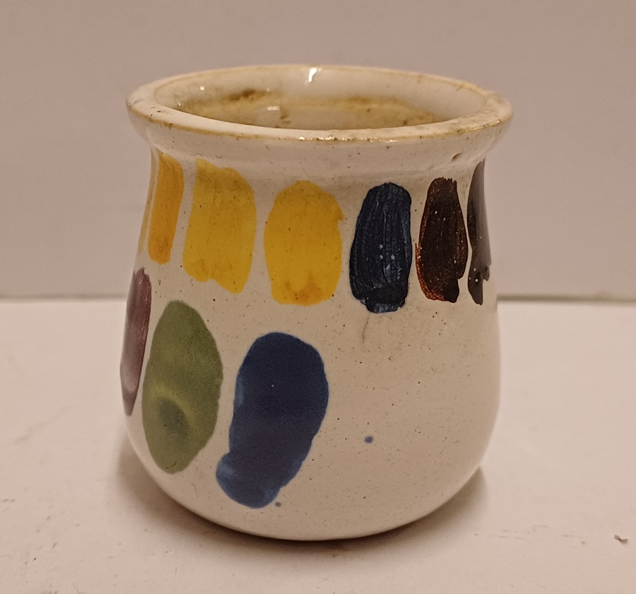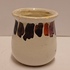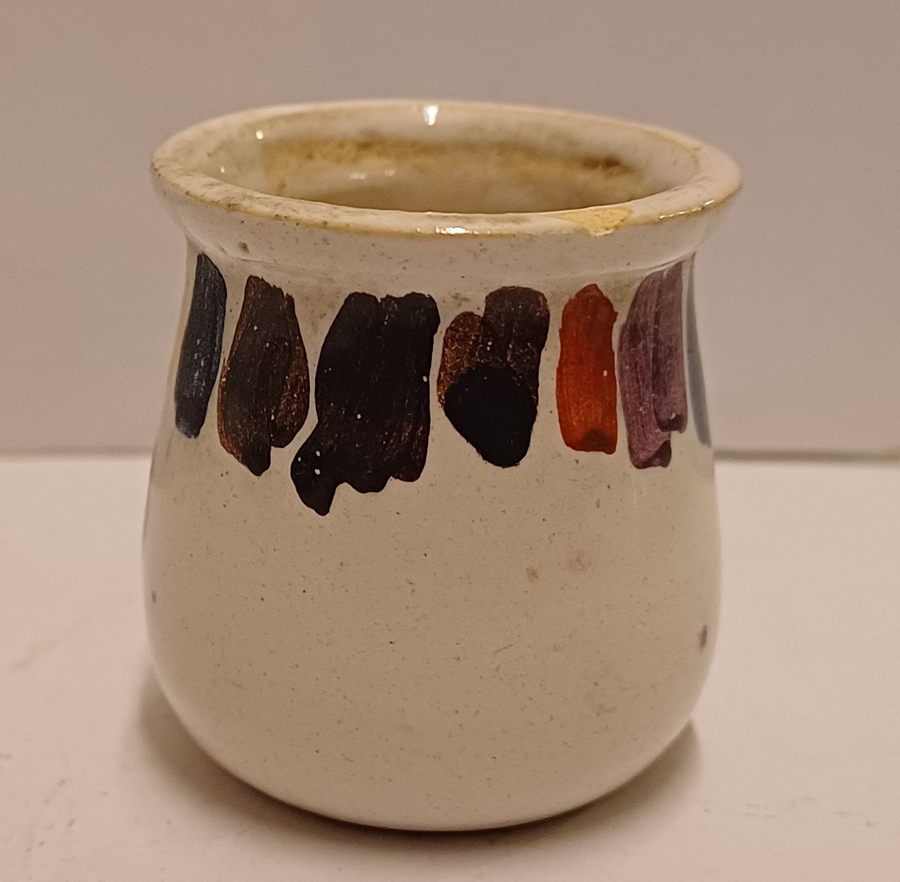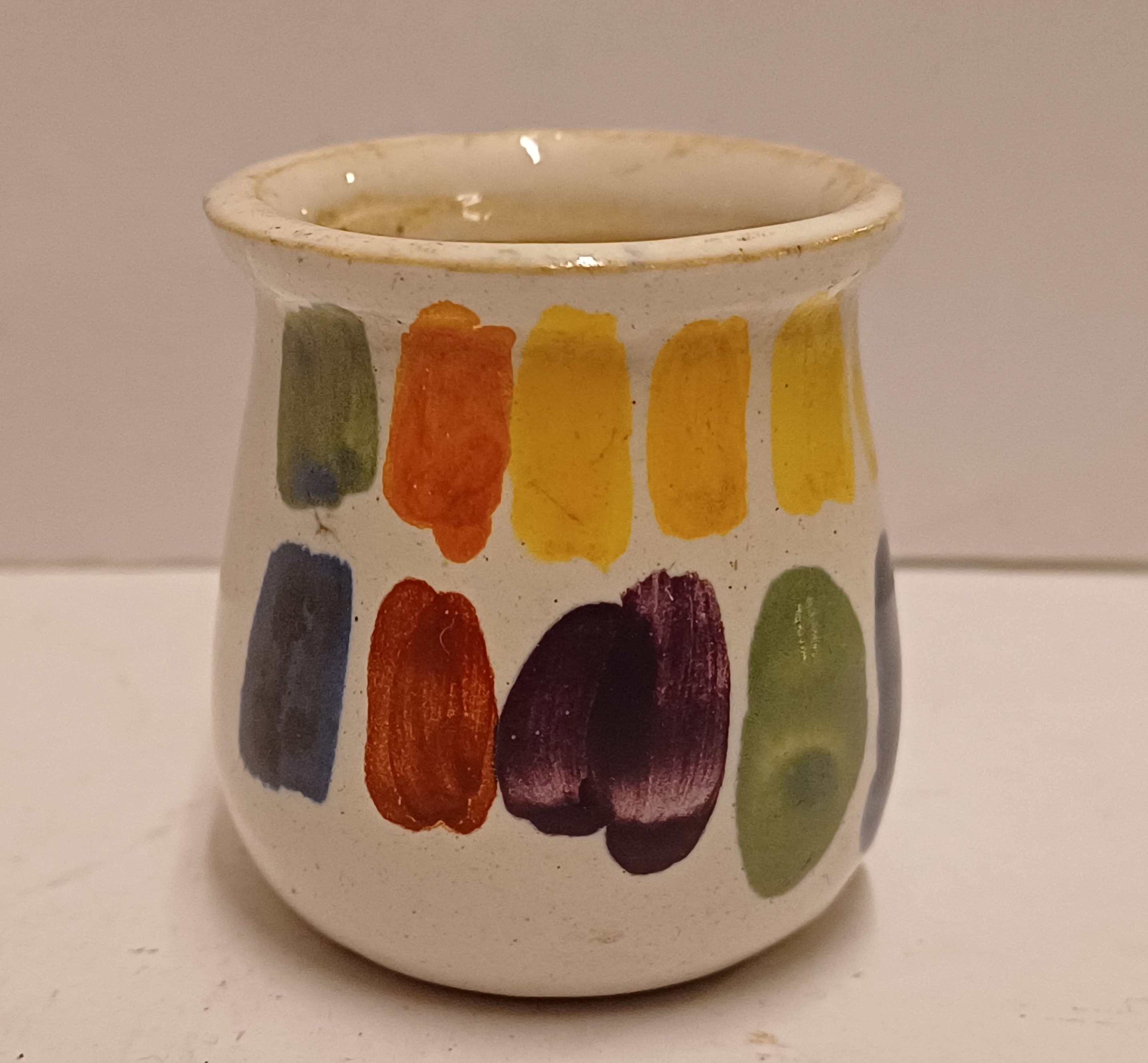 Small white glazed pot with various stripes of different glazes. Bottom with scratched number and painted number.