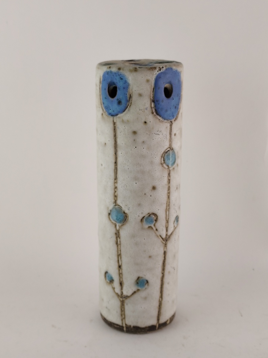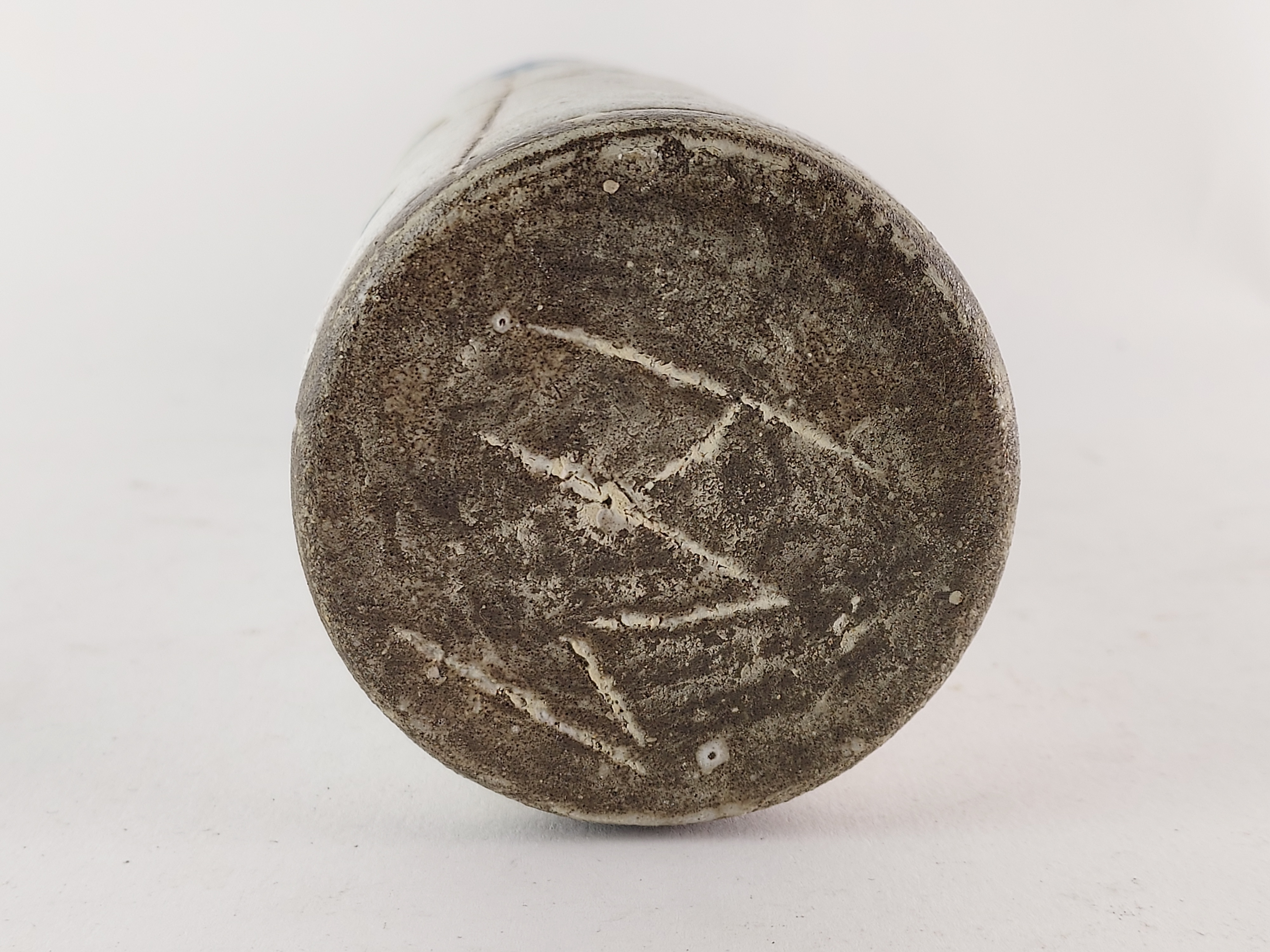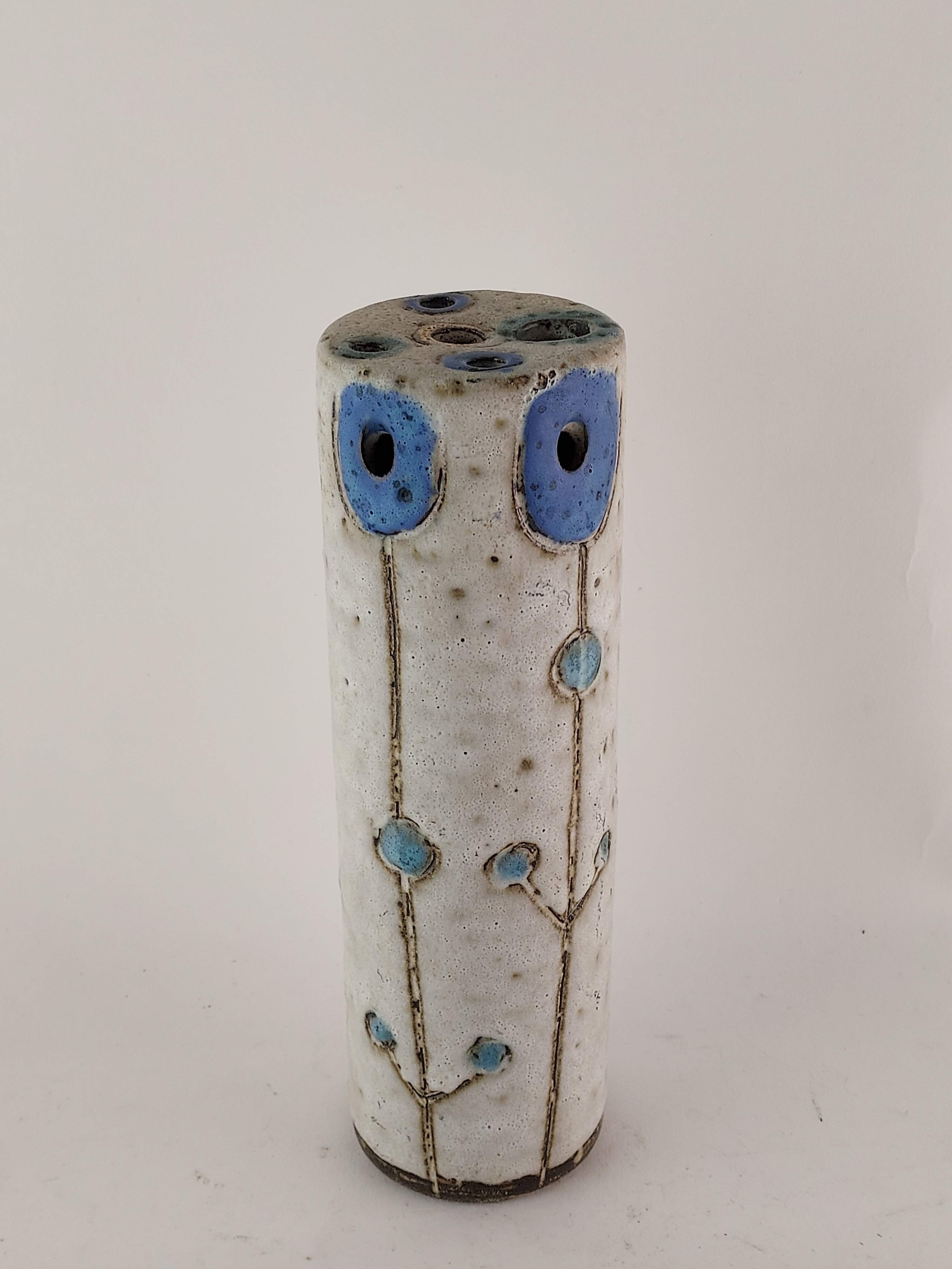 Earthenware cylindrical flower frog with decorations. Bottom with monogram.