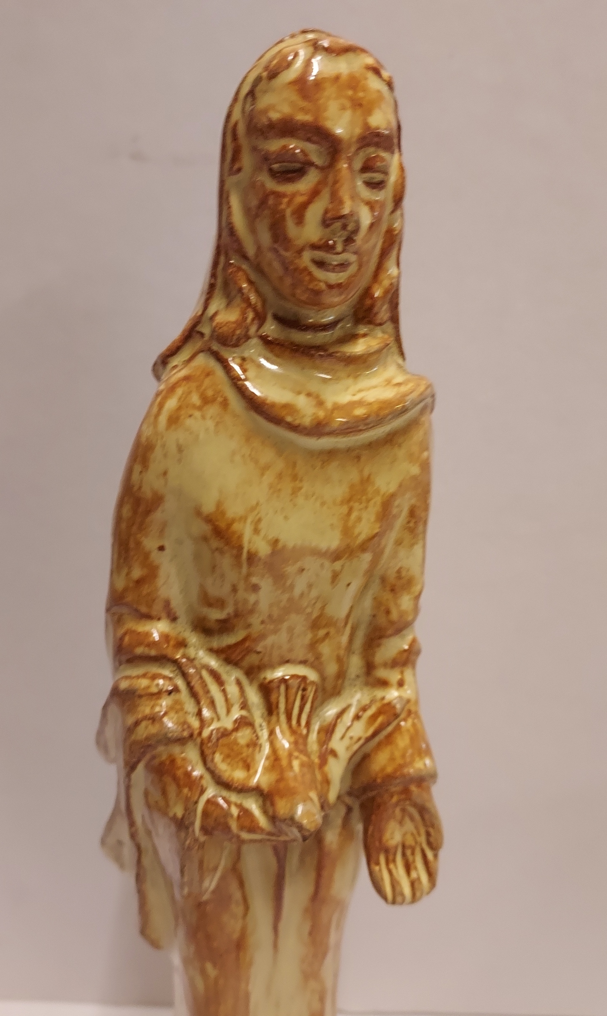 Terracotta statue of Saint Francis with a bird in his hand. Bottom with stamped brand mark.
