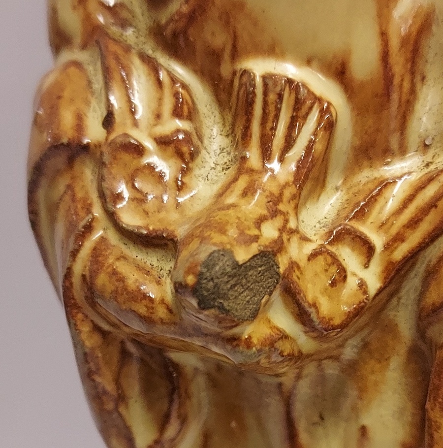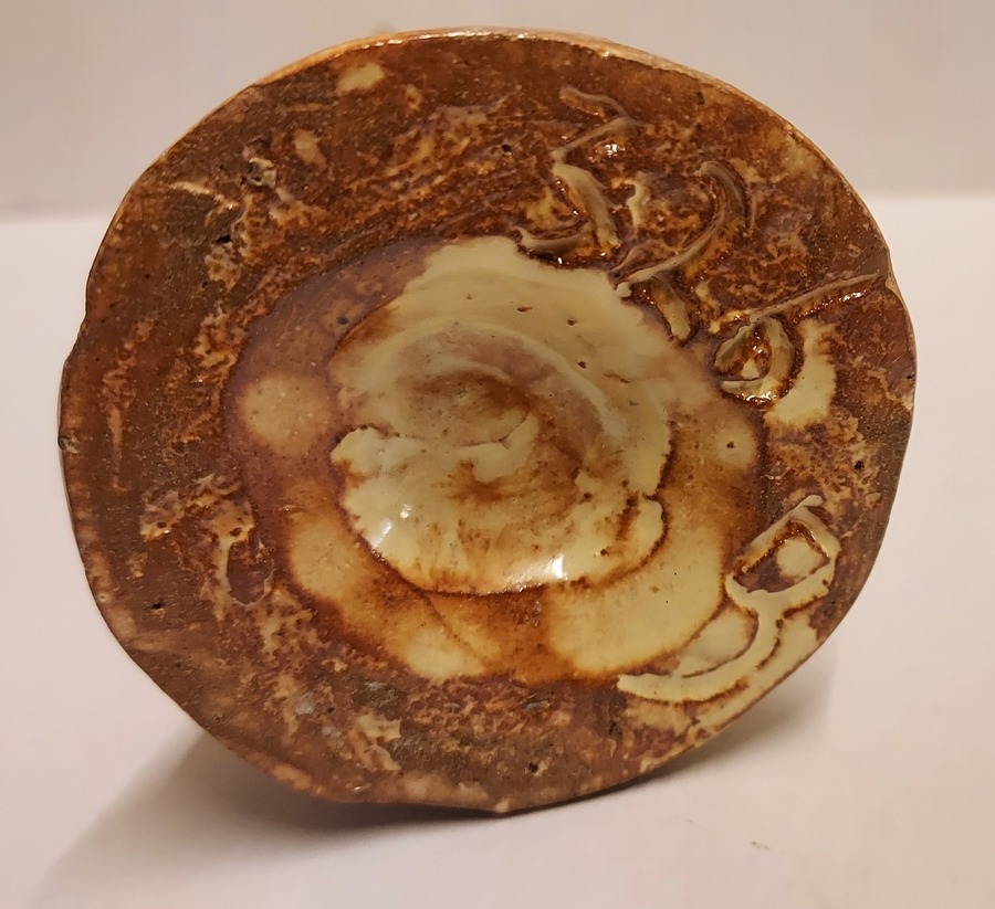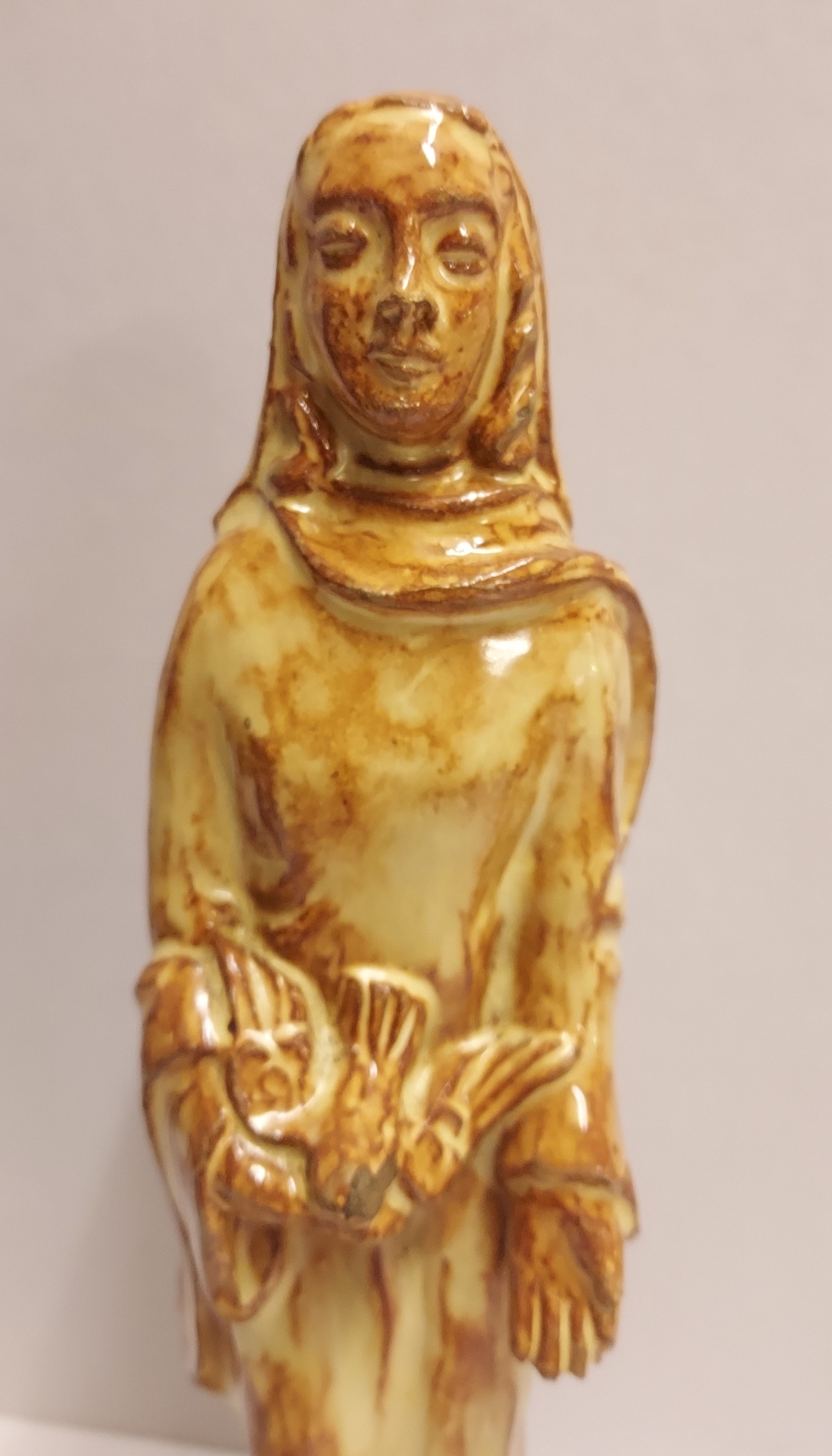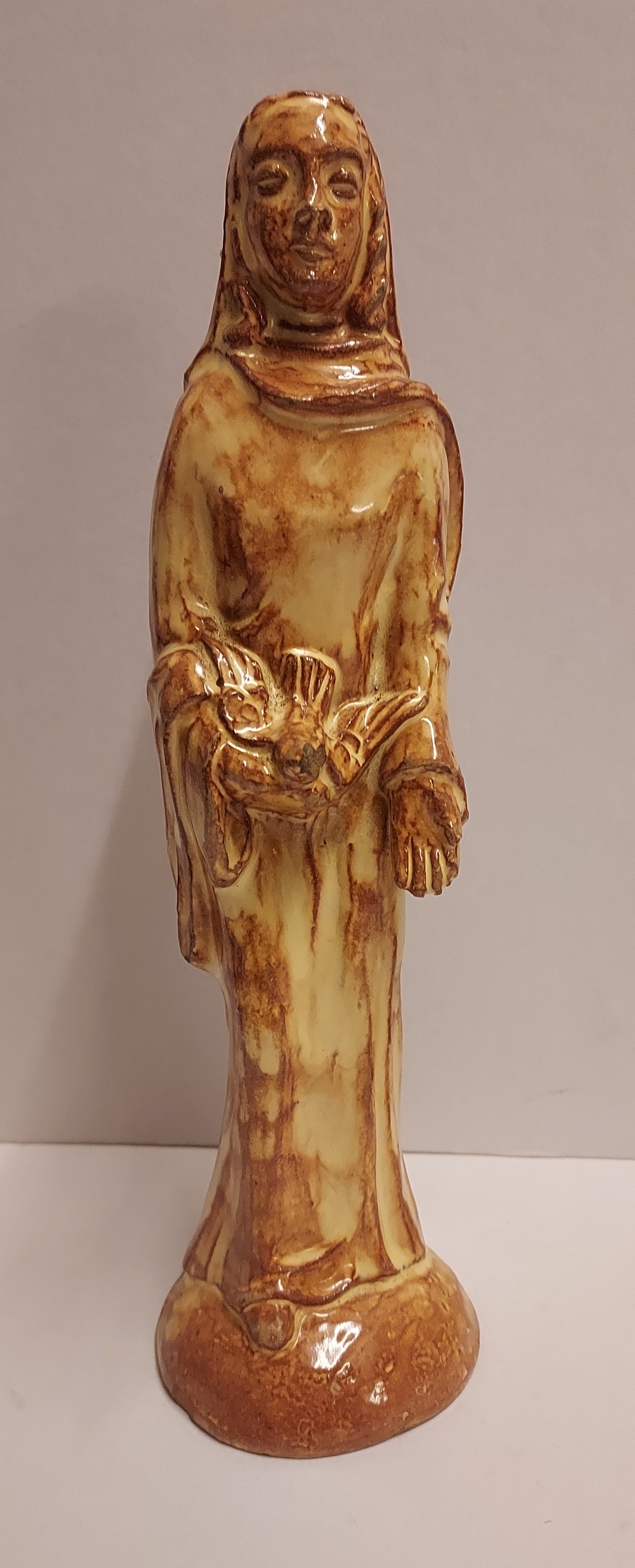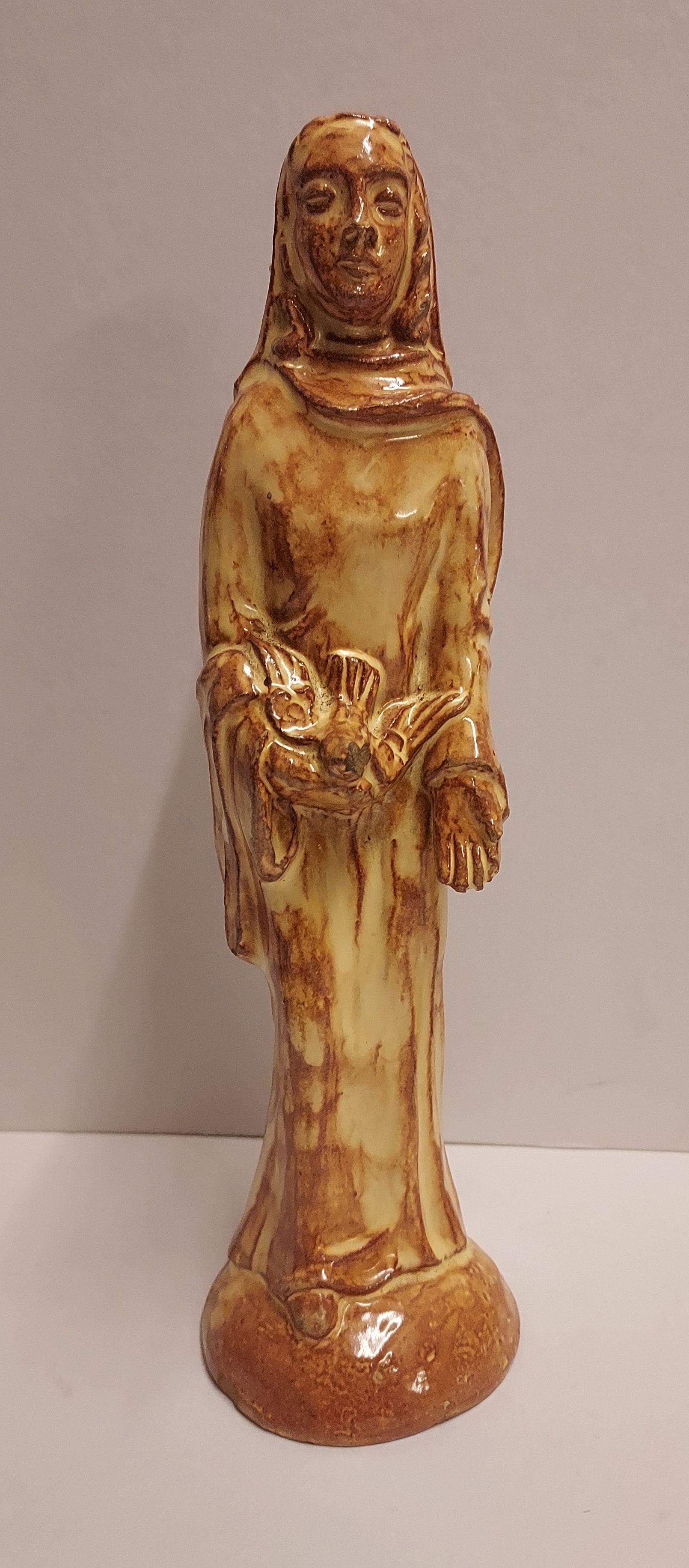 Terracotta statue of Saint Francis with a bird in his hand. Bottom with stamped brand.