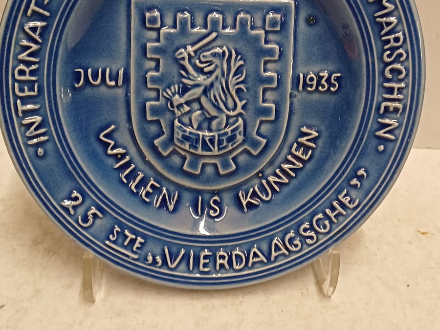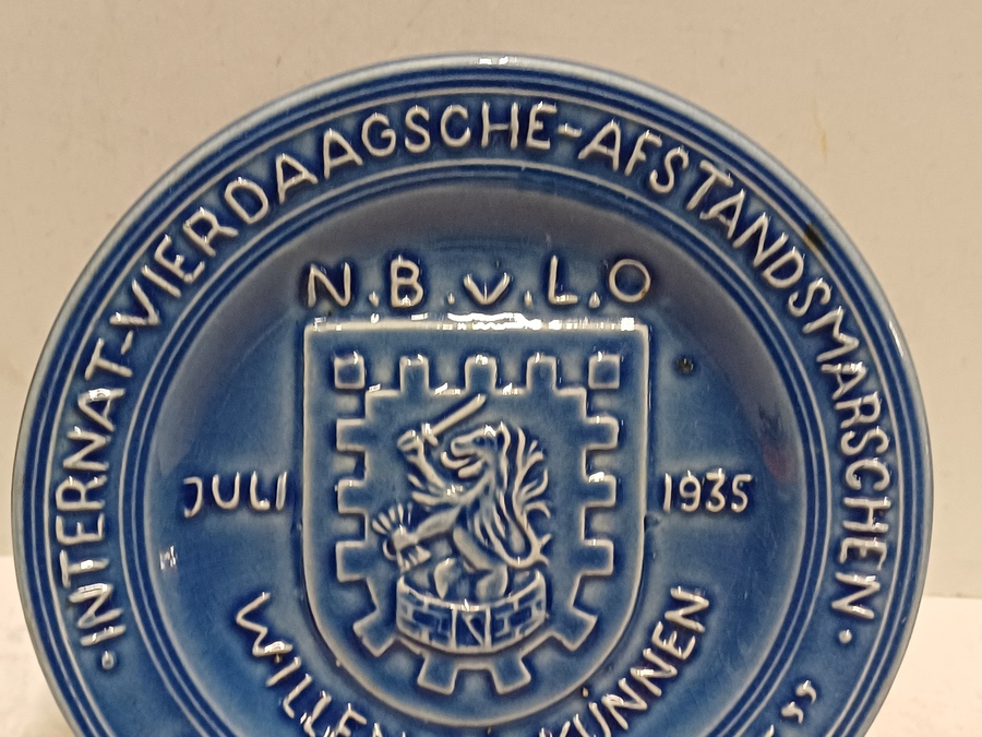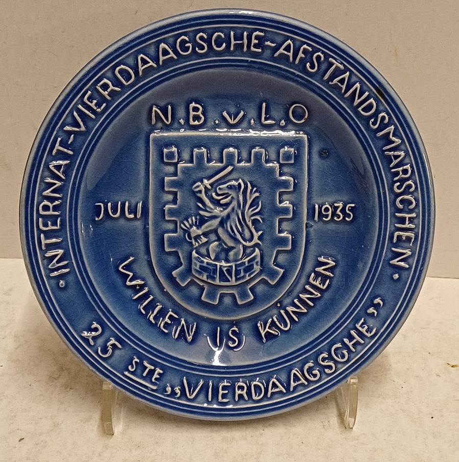 Gegoten bordje met reliefdecor van wapenschild en tekst N.B.v.L.O. Internat-vierdaagsche-afstandsmarschen 25ste vierdaagse Willen is kunnen. Achterzijde met fabrieksmerk.